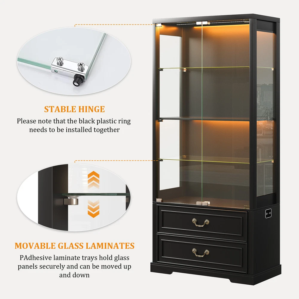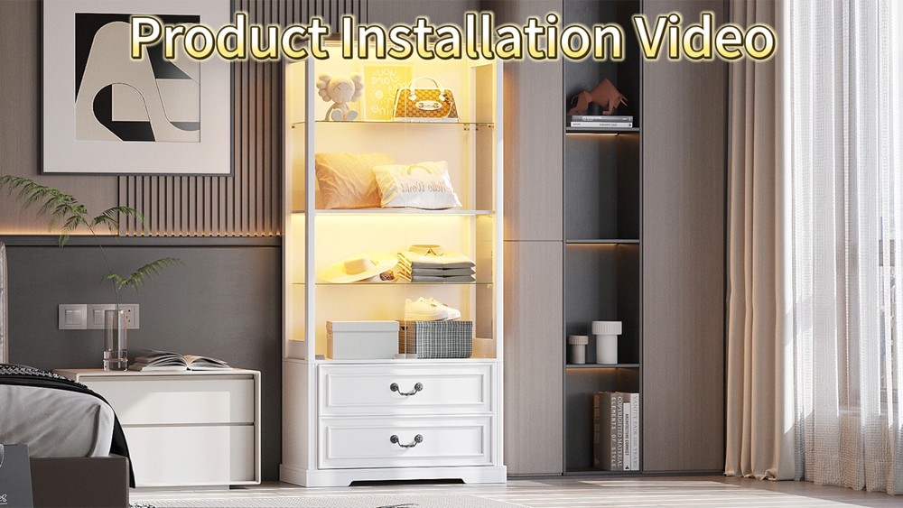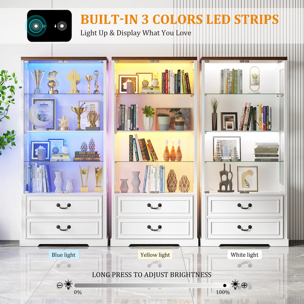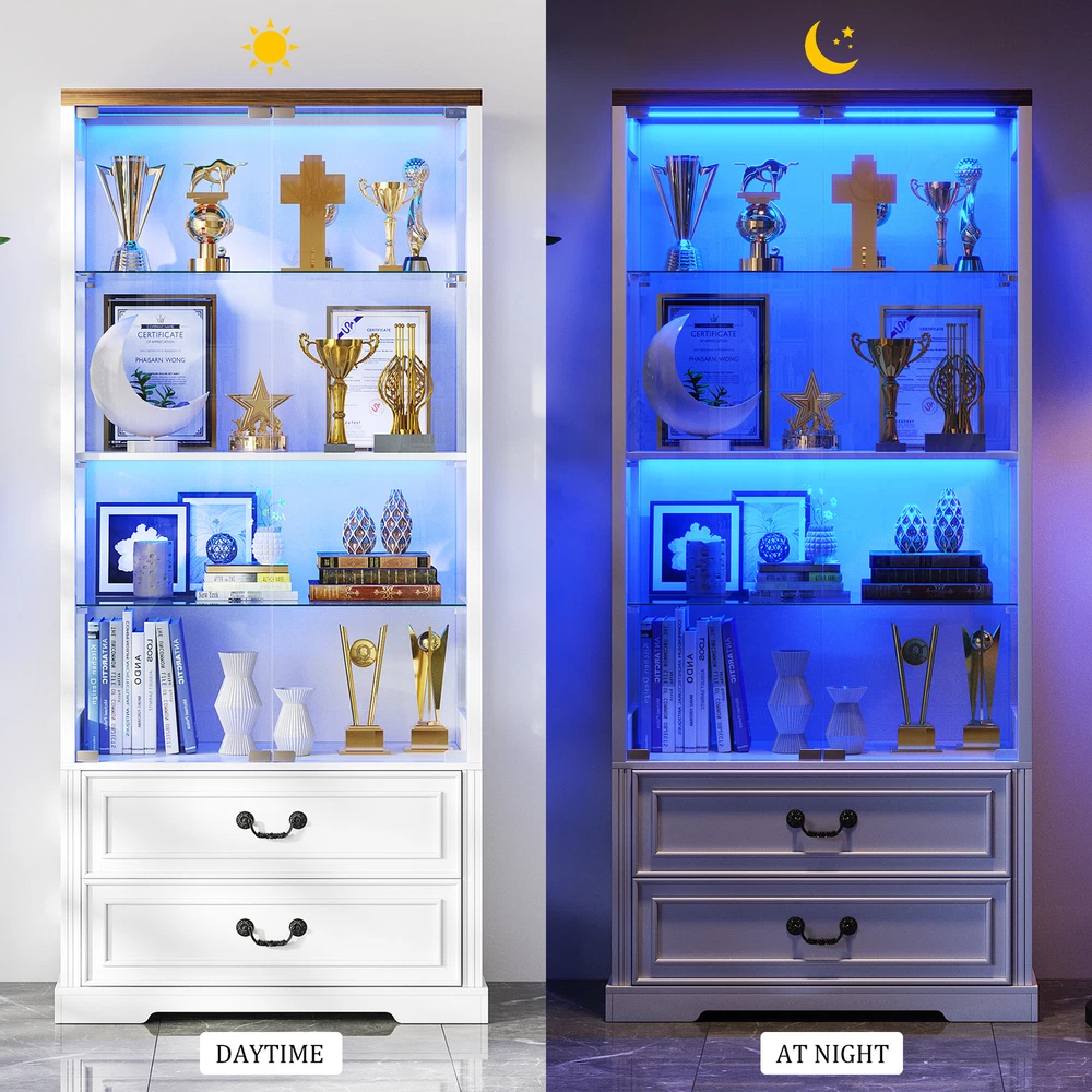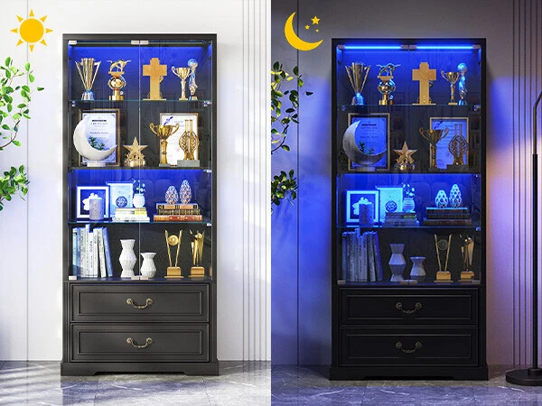 [Body Sensor Tri-color Light]:The display case is equipped with tri-color LED light, (blue, white, warm light), different light color to create a different atmosphere, to meet the user's personalized needs. Long press can adjust the brightness. Turn on the human body sensor light, when someone is near, it can automatically light up, to ensure that there is enough light in the dark, to avoid falling or collision, to improve safety; when the person leaves, the light will be automatically turned off in the set time, it's very convenient to use and save energy [Pop-up Glass Door]: The high transparency of the glass display door provides excellent visibility, allowing others to see the merchandise inside the display case at a glance, attracting their attention; the pop-up design makes it easier to open the door, and enhances the modern and upscale feel of the overall display case. The smooth glass surface is easy to clean and keeps the display case clear and transparent [Extra Large Storage Space]: Four tiers display design plus two drawers, fully utilize every square inch of space to meet your large number of merchandise display needs, perfect for home use. Adjustable shelf height design allows you to freely adjust according to the size and shape of your goods, increasing the adaptability of the cabinet. The drawer design allows you to store items that do not need to be exposed, keeping the display neat and beautiful [High Quality Material]: The display cabinet is made of a combination of tempered glass, acrylic and high quality wood, the tempered glass increases safety and durability, enhances visual appeal and has a higher impact. Acrylic is lightweight and not easily broken, its transparency makes the goods display excellent. High temperature and pressure treated wood composite material provides good stability and load bearing capacity for long service life [Multi-purpose and multi-scene application]: this display case can be applied in family living room, study, bedroom to display family albums, trophies, ornaments, collectibles, etc., to protect and beautify the items, which is both beautiful and practical, and coordinated with the home style. It can be used in office to display company's honor, staff's achievement, product samples and enhance corporate image, reflect professionalism and corporate culture [Easy and Detailed Assembly Instructions]:The product comes with detailed installation instructions and tools. During the installation process, make sure to follow every step of the instructions, when performing glass installation, it is recommended that two people collaborate on the installation to ensure safety. Please contact us first if you encounter any problem, we will solve the problem for you at the first time 3 Color LED Lights(White, Blue, Yellow)---Long Press to Adjust Brightness Human Body Sensor-Automatically senses when the light comes on and goes off Extra large storage capacity - 4 displays and 2 large drawers Keep your display cases clean and clear Convenient door opener presser Two large capacity drawers