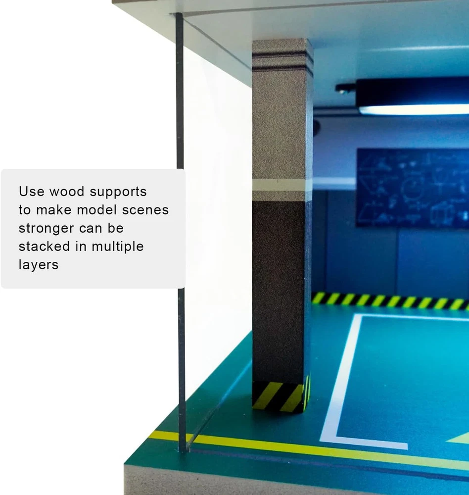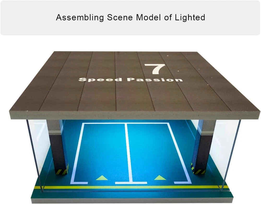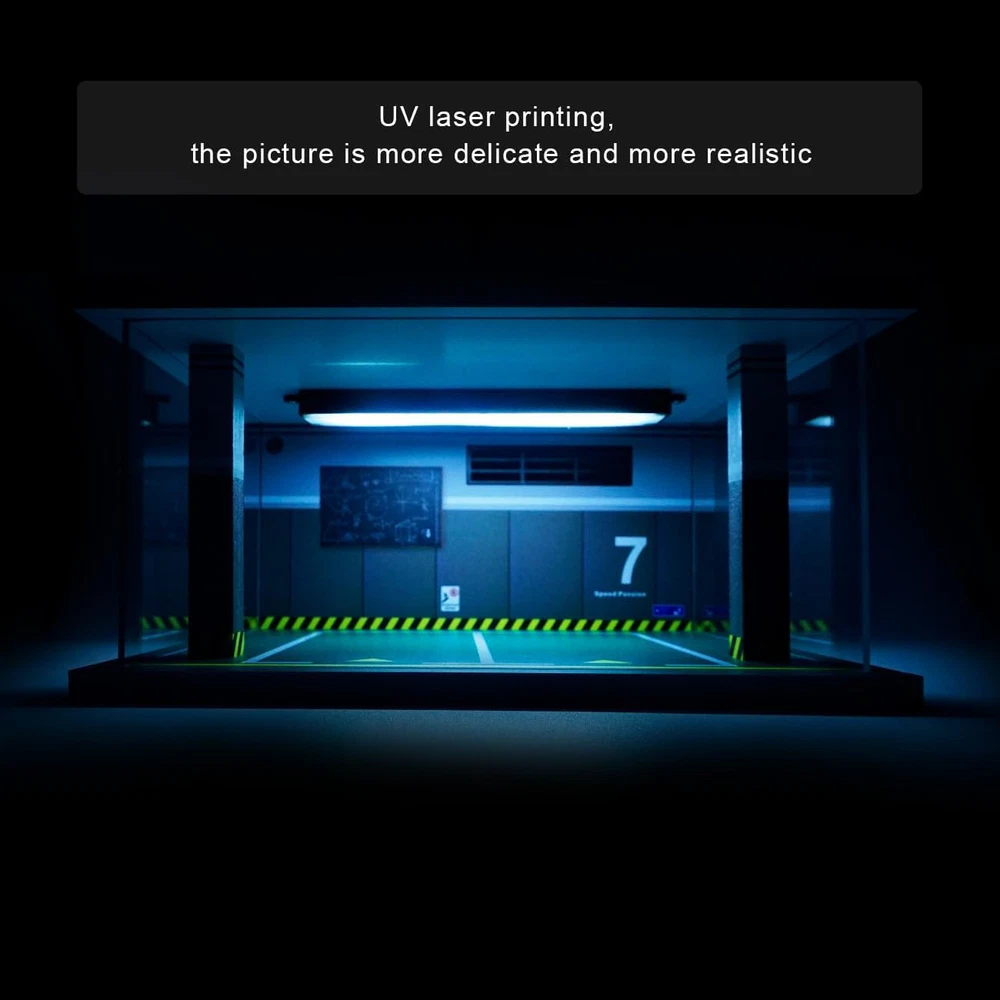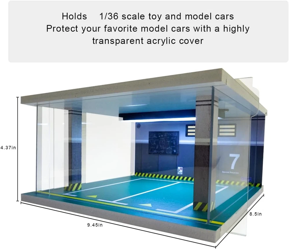 ???PERFECT WAY TO DISPLAY AND PHOTOGRAPH ???This display box can hold 1:32 scale die-cast cars, 1:36 scale die-cast cars, With this display box, you can highlight your favorite collectibles and take photos of them. ???Size???Exterior Dimension: 8.26in X 5.3in X 10.6in". (36.3cm X 21.7cm X 12.6cm). Note: This display box does not include car models. ???LIGHTED DISPLAY CASE???Built-in LED lights on the ceiling to illuminate the whole scene and increase the atmosphere of the scene. ???Realistic Garage Scene???Side panels and ceiling images are printed by UV laser. The garage scene is clear, detailed and realistic. Transparent display box is made of high transparency acrylic, which can display your favorite models more clearly. Each acrylic panel is double-sided packed to prevent damage during transportation. ???EASY AND FUN TO ASSEMBLE???The compact display box is easy to assemble, and the user manual is included in the display box for your reference. Display Case for 1/32 or 1/36 Diecast Cars,Acrylic Display Case for Toy Motorcyle with LED Lighting(