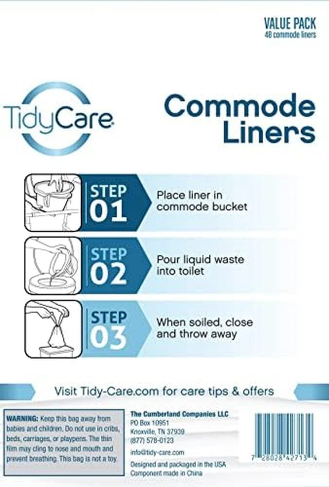 Store New Arrivals Add to Favorite View Feedback Disposable Bedside Commode Liners for Adult Portable Toilet Chair Seat Bucket and Bedpan | Value Pack of 48 Waste Bags | Universal Fit Liners for Home Medical Care Description Item model number 4332453849 Unit Count 48.0 Count Item dimensions L x W x H 10.5 x 1.5 x 6.5 inches Capacity 0.45 Kilograms Number of Items 48 Is Discontinued By Manufacturer No Product Dimensions 10.5 x 1.5 x 6.5 inches; 1.19 Pounds Material Plastic Item Weight 1.2 Pounds Material Feature Disposable Recommended Uses For Product Toilet Waste Item Form Bag Size 1 Count (Pack of 48) No More Yuck: Now there's no more need to clean out liquid and solid waste from portable commode toilets and bedpans. Each plastic commode liner is simple to insert and they are universal in size. Simply remove the liner from the commode chair after use and tie the drawstring for a seal-tight closure, then dispose safely in the garbage. 100% Leak Free: No leaking, guaranteed. TidyCare disposable commode bags keep everything tidy, sanitary, and hygienic while also saving time for care givers, the elderly and the bariatric. The commode disposable liners eliminate the need for cleaning or rinsing the commode bucket. Easy to Use: Our commode liners for bedside toilet chair bucket are designed for hassle-free use, especially by those who typically depend on using bedside commodes. This includes those in medical care, recovering from surgery, bariatric adults, seniors with early dementia, and other such conditions in which mobility is limited. Liners Only: This Value Pack comes with 48 commode liners. Each portable toilet liner fits standard-sized commode toilet buckets and are easily disposable. If you’re looking for absorbency, search for TidyCare Convenience Pack, which comes with our bedpan liners along with super-absorbent commode pads. TidyCare Cares: Our products such as the TidyCare Bedside Commode Liners for Portable Toilet Chair Bucket and Bedpan are assembled at Sunshine Industries, a vocational training facility for people with intellectual & developmental disabilities. Your purchase helps these individuals to work in a safe, encouraging & fulfilling environment. Product description ABOUT US We offer the best prices around on high quality products. Our E-store includes media such as books, movies, music and games while offering electronics, toys, sporting apparel, clothing, tools, general home, garden items and more. SHIPPING We are always working hard to ensure your package arrives as soon as possible. Please understand that some factors like weather, high postal traffic, and the performance of shipping companies are outside of our control. We offer free shipping to the lower 48 states and ship within 2 business days of payment, usually sooner. We do not accept P.O. Boxes. Please provide a physical address. RETURNS We offer a 30-Day Return Policy on items which you are not completely satisfied with. You have the option for a full-refund or an exchange of the item. No returns are available on items shipped outside of the USA. PAYMENT We accept PayPal. CONTACT US This page content is yet to come Please ad us to your favorite seller and visit again later Thank You