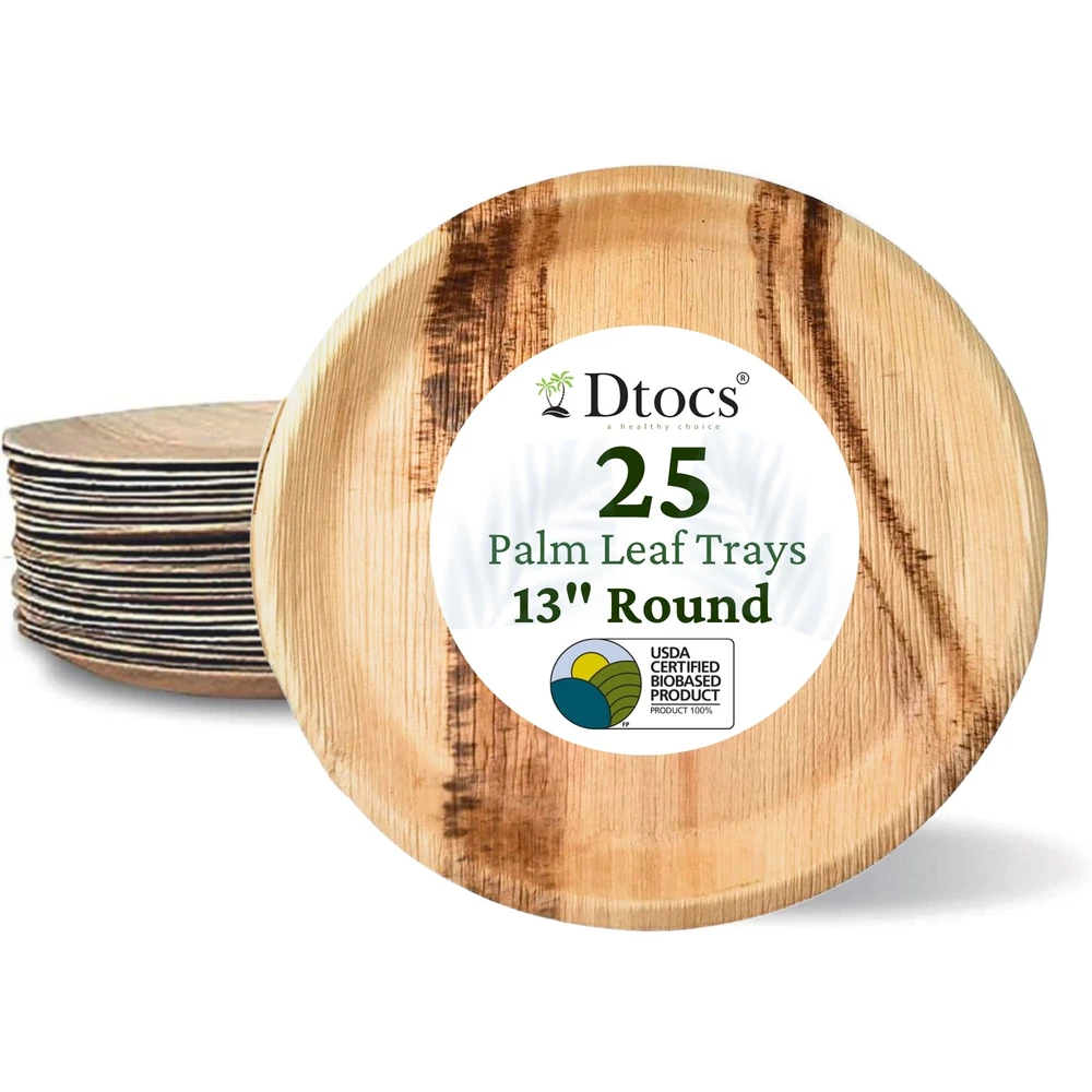 Sustainable & Compostable Serving Trays - Premium quality wooden tray look disposable serving trays are made from natural palm leaves without causing any damage to trees, hence these are compostable & sustainable in nature. Sturdy, Leaf proof & Grease Resistant: Made from centre portion of palm leaves, these disposable trays are very sturdy and can also be used as serving tray, pizza plate, charcuterie board, cheese board, grazing at weddings, camping, BBQ, luau, Dinners, food trucks, restaurants, thanks giving, Christmas, porch party or as beach dinnerware. Aesthetic Appealing Microwave Safe Trays - Since these round disposable platters are made from center portion of the palm leaves, these are very sturdy and can withstand high temperature. These microwave safe trays can be used for reheating. Each platter tray carries it's own character with unique woody look and natural aroma, Heavy Duty & Elegant: These palm leaf round platters are among the strongest palm leaf trays with heavy duty design that won't break or sag. Sturdier than any serving platter & plastic disposable serving trays, these are versatile large round plates Complete Party Dinnerware Set: aims to serve it's customers with best valued natural compostable disposable kitchen utensils thus we have backed our fancy palm leaf plates, disposable soup bowls, charcuterie boards, platters & trays with total satisfaction . So with confidence and start dining in eco-friendly style.