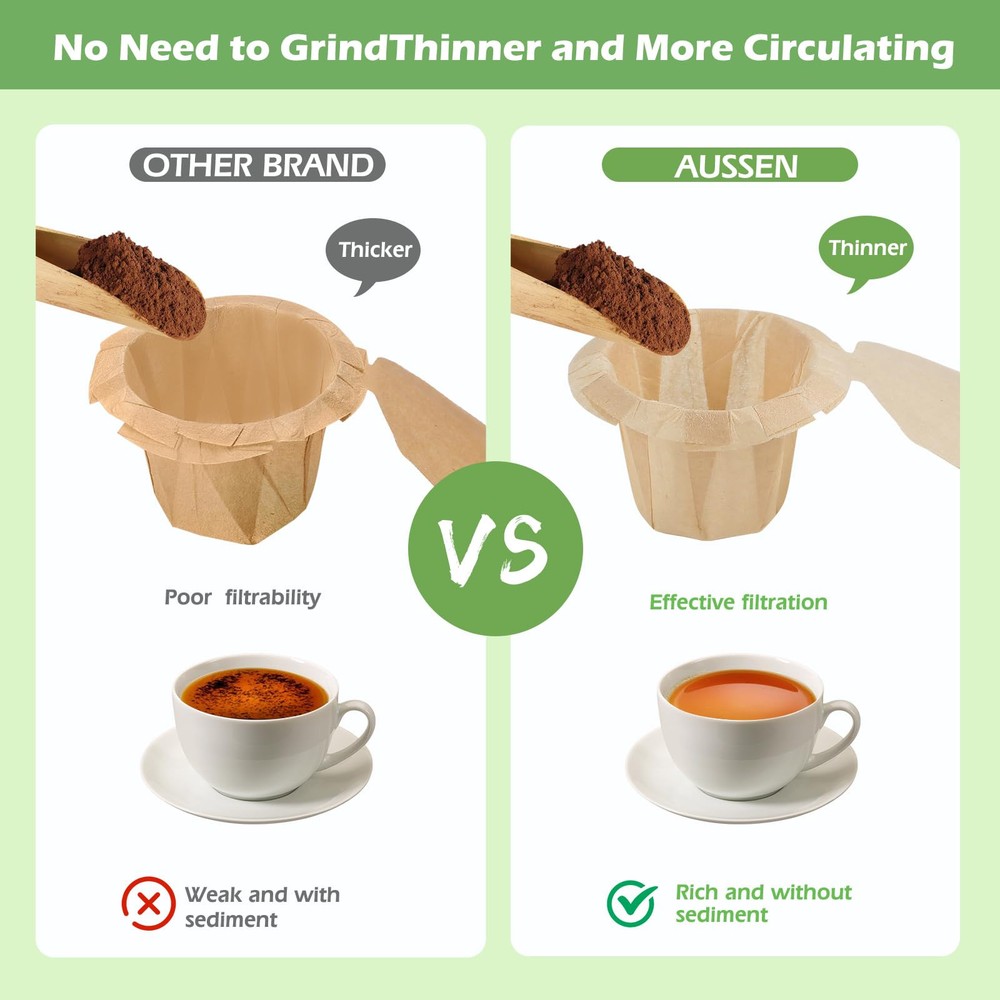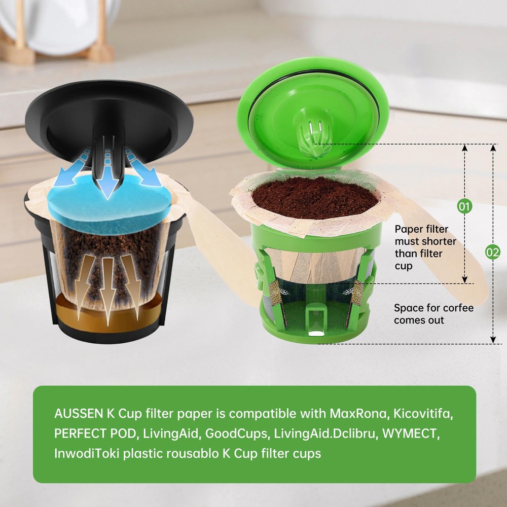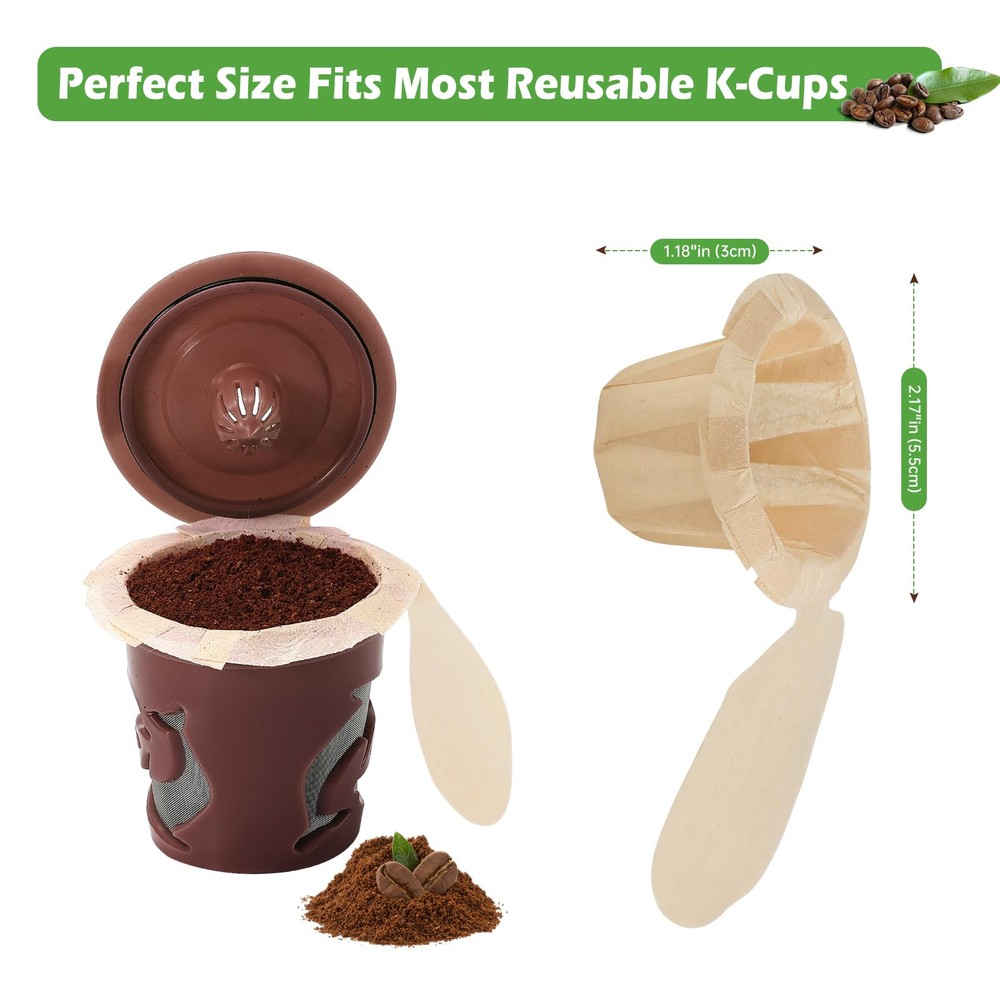 【Easy to use 】- fast and easy to fill, providing you with fresh ground coffee:Easy to clean, you can tap the bottom of the net basket to let them come out directly. Convenient for you to brew your favorite coffee or tea with different flavors and sizes. There are no longer coffee bean residues stuck in reusable cups and it takes a long time to clean. Use our disposable coffee filters there would no mess, no silting filter mesh, just remove and toss out the disposable filterIt's and the k cups are more easy to clean up . 【Natural Disposable Paper Coffee Filters】 :These coffee filters paper are made of natural unbleached, recyclable paper, which very strong, and it is difficult to tears out under high-pressure hot water.With unbleached textured, recyclable paper that holds its shape, keep better flow through but won't tear easily. 【Efficient and Time-saving morning】: Simply insert filter in reusable keuig cups, tuck keurg filter under hinge, fill with coffee and brew! All you have to do is simply flip the keurg cups and discard the paper filter when finished. Make multiple cups in a row without needing to wash your reusable cup between uses. Time saving and enjoy more cups of coffee at the hurried morning. 【Nice Thickness】: filter paper neither too thin to be split up or leak, nor too thick to make the coffee weak. Thinner but better flow through.Fits Into Most K-cups Paper Filters,Easily Flow Through With Good Test No Grounds: good quality disposable coffee filters help you to make a nice cup of coffee with good taste. Filter paper can filter most of coffee grounds and make the taste more silky and crema rich 【Biodegradable】- Our disposable paper coffee filters are entirely recyclable and traps most of the oils and other compounds found in coffee that contributes to acidity. Fully biodegradable and gentle on the planet.Get the coffee you want without harming anything or anyone.By replacing disposable paper filters instead of buying expensive K cups, you not only get to choose your favorite taste but also save your money. More importantly,it reduces the impact on the environment and water waste.