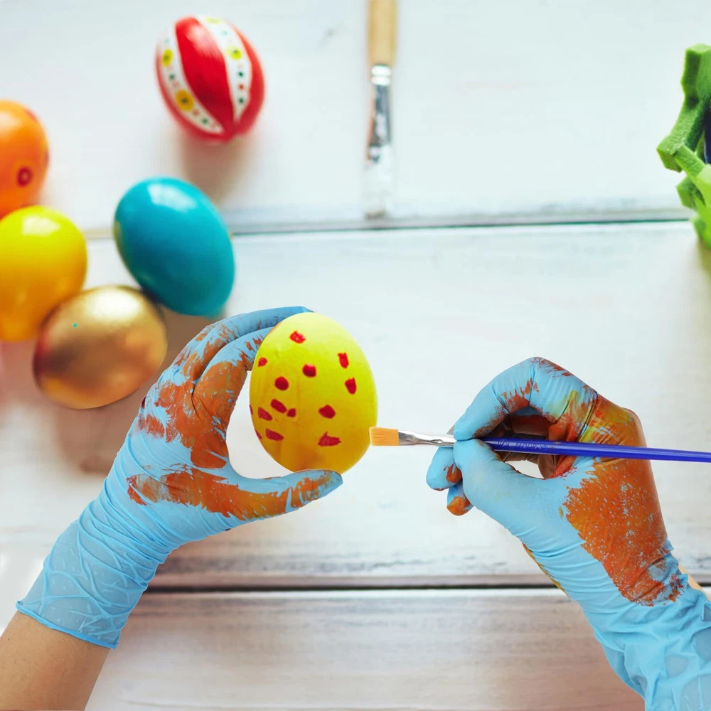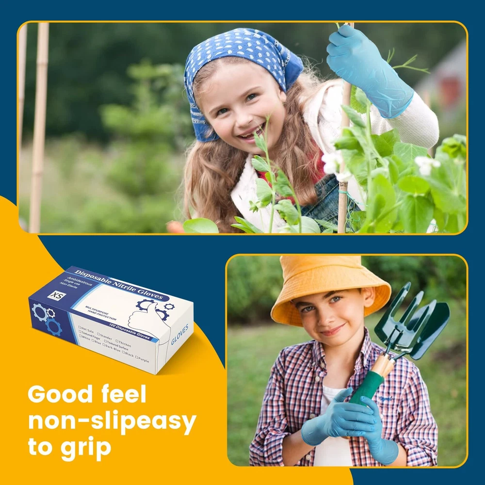Disposable Nitrile Gloves, Kids Gloves Disposable for 4-10 Years, Powder-Free, Latex-Free, for Crafting, Painting, Gardening MORE PROTECTION: The kids nitrile glove have no latex ingredients, to avoid skin itching or discomfort reactions caused by the material, good elasticity, flexible operation; For single use only. WATERPROOF & TEAR RESISTANT: Not only are these nitrile gloves 100% waterproof, but they are also resistant to punctures, rips & tears. Whether painting or planting, it keep hand clean and safe. SUITABLE FOR KIDS: Specially designed and manufactured for children ages 4-10, the actual fit may vary, but these kids cleaning gloves are designed based on the average hand size of students in grades 1-6; Enhances grip without compromising dexterity and feel, so kids can comfortably complete the task at hand, protect their hands and save them time cleaning up. SUFFICIENT TO USE: You will get a box of kids nitrile gloves, and each box has 100 pieces ( 50 pairs) , suitable for usages of any indoor and outdoor activities, they are compact and easy to store in the box, easy to fetch, fast, safe and easy to clean. MORE MULTIPURPOSE: Great for Arts & Crafts, painting, tie dye, science project, lab experiments, gardening, cooking, playing, party, cleaning, pet care etc.