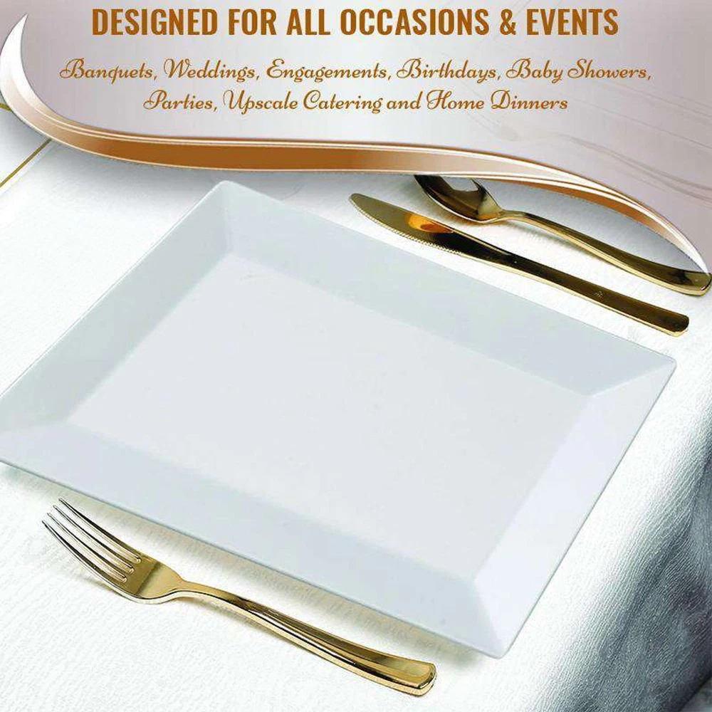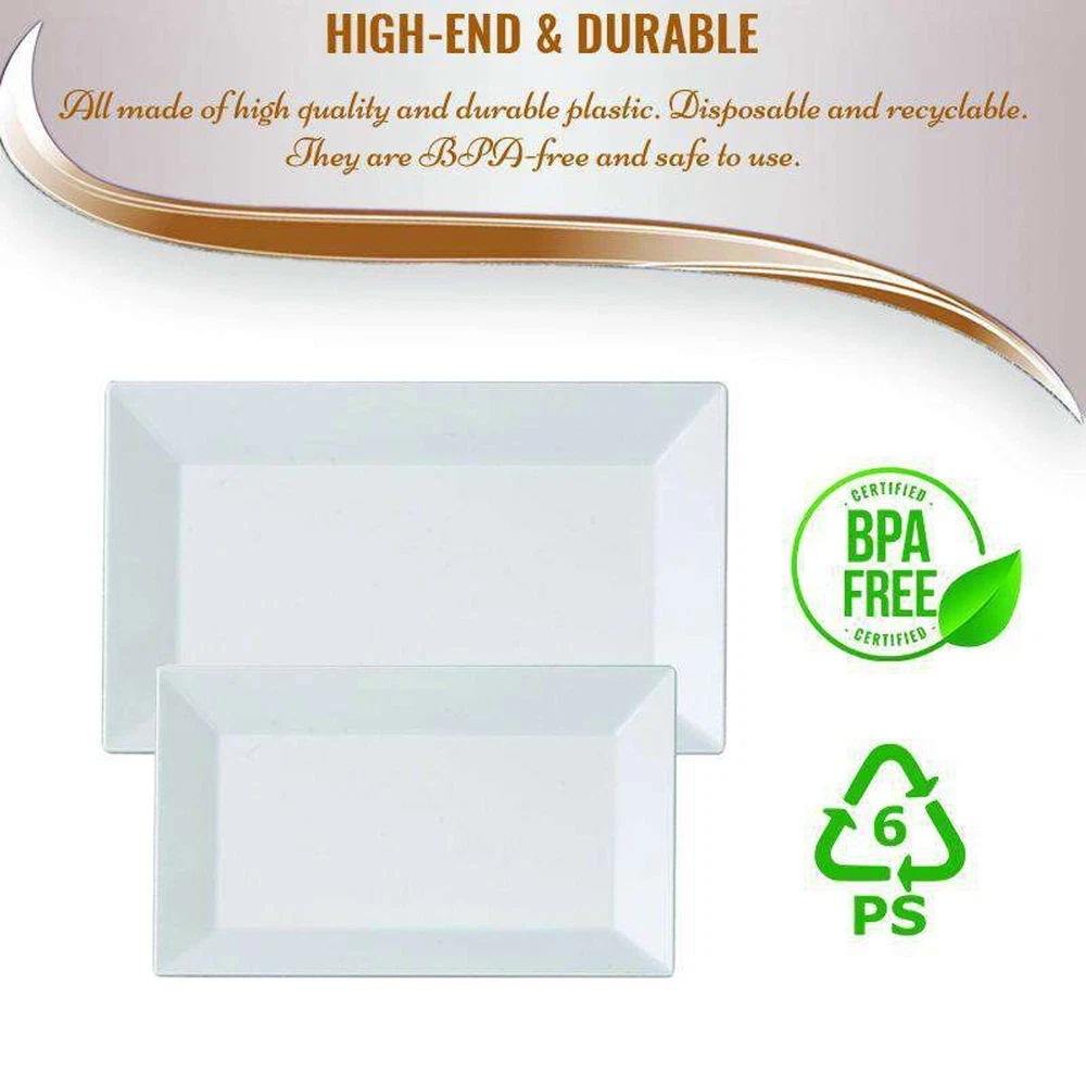 FANCY AND ELEGANT DESIGN – These rectangle white plastic dessert plates add sophistication to weddings, birthdays, and all events. Perfect for serving salads, appetizers, or cakes with style. SERVES 120 GUESTS – This set includes 120 plastic plates, perfect for large gatherings. These party plates make hosting easy with enough dessert plates for every guest. DURABLE AND HEAVY-DUTY – Crafted from premium materials, these plates are disposable yet sturdy enough to handle heavy portions. Say goodbye to flimsy, low-quality plastic plates! CONVENIENT AND DISPOSABLE – Save time and effort with these disposable plates. Enjoy your party without worrying about dishwashing – just toss them after use! PERFECT FOR ALL OCCASIONS – Ideal for weddings, birthdays, and parties, these plastic plates for party settings bring elegance and convenience to your table.
