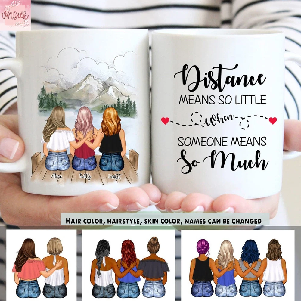 Distance Means So Little When Someone Means So Much Personalized Mug Best Product Details.. This high quality 11oz. ceramic white mug has a premium hard coat that provides crisp and vibrant color reproduction sure to last for years. Perfect for all hot & cold beverages. The highest quality printing possible is used. It will never fade no matter how many times you wash it. Material: 100% Ceramic. Print both sides. Dishwasher and Microwave Safe. High Gloss + Premium White Finish. Printed in the U.S.A. Personalized & Custom. We support personalized and custom mug to add custom, when placing an order, you can add notes to the "order note" in shipping address section. Also you can contact us directly via message. Shipping Info. Ready to ship in 1 to 2 business days, All products are made-to-order and proudly printed in the United States. Shipped by USPS and DHL, You will receive your order in 5-7 days. Replace & Refund. All products are defective during shipping broken, chipped will be replaced free of charge. You are not satisfied with the product, we will refund 100% money to you. If any other issues arise, please do not hesitate to message, we would be more than happy to assist you.
