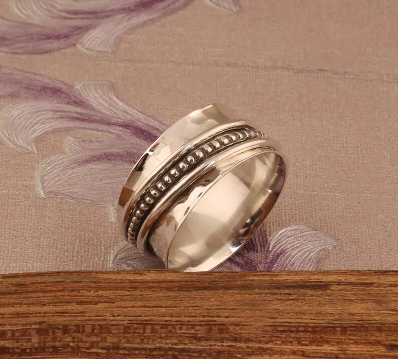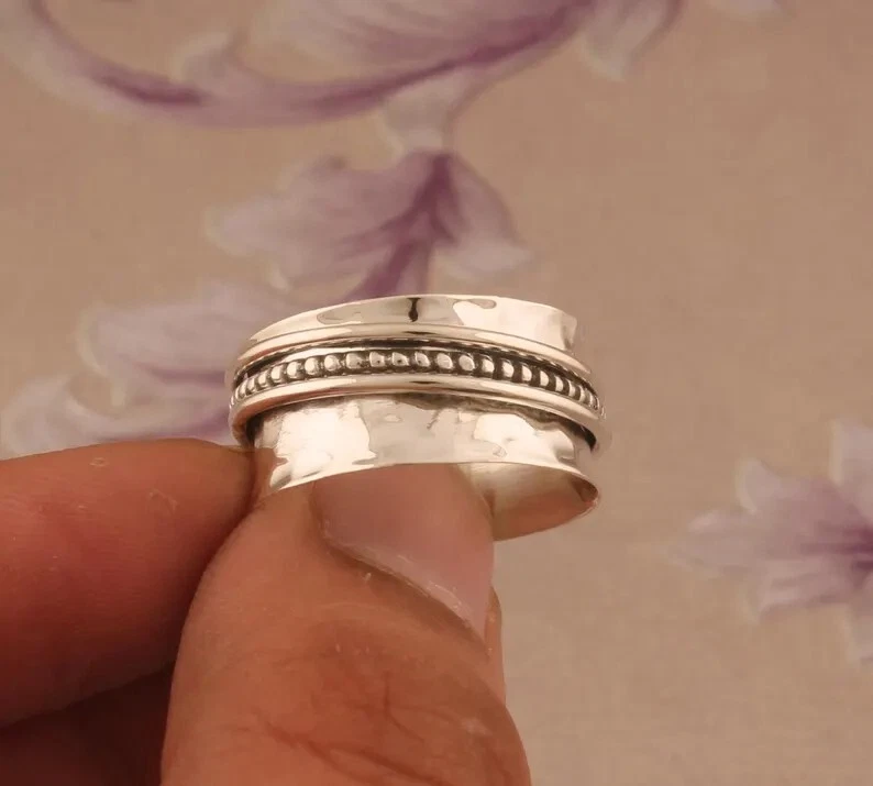 Solid 925 Sterling Silver Handcrafted Distressed Scratches Design Spinner Ring This Handmade Sterling Silver Spinner Ring is a perfect blend of artistry and functionality. Crafted by skilled artisans, each ring features a stunning textured band with unique, distressed scratches that give it a rustic, one-of-a-kind appearance. The spinner mechanism allows the outer band to rotate freely, making this ring a great choice for those seeking a soothing, tactile experience—whether you're wearing it as a worry ring , fidget ring, or simply for its bold, modern aesthetic . Features: Handcrafted with Love : Made from high-quality, solid sterling silver for a durable and timeless piece that will last. Unique Design : The outer band features distressed textures and scratches , giving each ring a distinct, organic feel. No two rings are alike! Spinner Mechanism : The inner band moves smoothly around the outer band, perfect for those who enjoy a calming, tactile sensation. Customizable Fit : Available in a range of sizes to ensure the perfect fit. The ring is made to comfortably slide over your finger, and the spinning feature adds extra fun and function. Versatile Wear : Ideal for daily wear, this ring is a great addition to any jewelry collection. It also makes a thoughtful gift for anyone who enjoys handmade jewelry , unique designs , or needs a soothing, tactile distraction. Perfect For: Those who love artisan-made jewelry with personality A personalized gift for birthdays, anniversaries, or special occasions Fidget or worry rings to help reduce stress and anxiety Anyone seeking a stylish and functional ring with a bit of movement Sizing: Please refer to the size chart to choose your perfect fit. If you're unsure, we recommend ordering half a size larger, as spinner rings tend to fit more snugly than standard bands. Custom sizing requests can be accommodated—please message us with your specific requirements. Care Instructions: To keep your sterling silver ring looking its best: Clean gently with a silver polishing cloth to remove tarnish. Avoid exposure to harsh chemicals or excessive moisture. Store in a jewelry box or pouch to prevent scratches. Shipping & Returns: Free shipping within the U.S. and international shipping available. Fast processing time—your order will be shipped within 1-2 business days. 30-day returns for a full refund or exchange, no questions asked. Note: Due to the handmade nature of this ring, slight variations in texture and appearance may occur, making each piece completely unique. This adds to the charm and individuality of your jewelry!