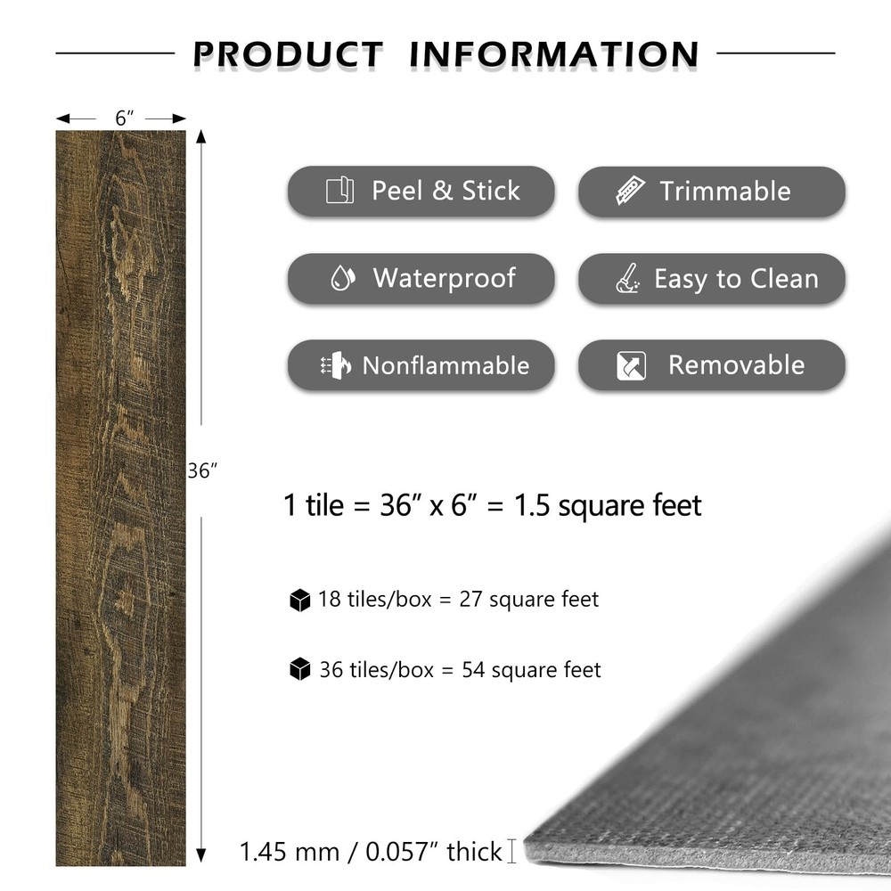 [SIZE] Length: 36 inch; Width: 6 inch [THICKNESS] 0.057" Thick Wood Flooring [MATERIAL] Vinyl Flooring [STYLE] Wood Flooring [DESIGN CONCEPT] Natural wood flooring planks bring timeless charming for your floor! [ADVANTAGES] 1. Peel and Stick Wood Flooring: peel and stick floor tile, peel and stick flooring, self adhesive floor tiles, stick on tile floor, sticky floor tiles, sticky tiles for floor, self stick floor tiles, peel & stick floor tiles, no extra glue needed. 2. Peel and Stick Wood Flooring: removable floor tiles for renters, great temporary flooring for renters. 3. Peel and Stick Wood Flooring: vinyl plank flooring, peel and stick vinyl flooring, vinyl floor tiles, laminate flooring planks, sheet vinyl flooring, vinyl tiles peel and stick floor, linoleum flooring, pvc floor tiles, peel and stick floor tile wood, wood tiles for floor. 4. Peel and Stick Wood Flooring: Waterproof flooring, flooring peel and stick waterproof, peel and stick waterproof floor tile, waterproof peel and stick floor tile, stain resistant, moisture-proof, anti-slip, easy to clean. 5. Peel and Stick Wood Flooring: This peel and stick tile floor can be used as bathroom floor tile, shower floor tile, kitchen floor tile, bathroom flooring, kitchen flooring, it also can stick on bedroom floor tiles, living room floor tiles, this sticky floor tiles are suitable for dinning room, laundry, nursery, dollhouse, playroom, cubicle, farmhouse, garage, basement, attic, kitchenette, gym, dorm, classroom, apartment, office and rv flooring. [PRO TIPS] 1. Measure the size of the floor surface before purchase, buy enough rolls at a time to avoid color difference. 2. Clean the surface before pasting. The adhesion will be the best if the surface is clean, smooth, dry and flat. 3. We recommend to avoid leaving too much water on the floor tiles while cleaning within two days after installation, which helps to maintain great adhesion for a long time. ➤ SIZE & MATERIAL: Each wood floor tile measures 36"L x 6"W and 0.057" thick. 36 tiles per box, totally can cover 54 square feet. The sticky floor tiles are made of superior vinyl, wear resistant and nonflammable, safe for your family. ➤ EASY TO INSTALL: Self adhesive vinyl floor tiles, just peel and stick floor tiles to your room, readjust if you need, cut with utility knife or scissors to fit small space, no grout or special tools needed. ➤ EASY TO CLEAN: This peel and stick floor tile wood is waterproof and washable, oil proof and stain resistant, easy to clean with a wet mop. ➤ REMOVABLE: Just remove this vinyl plank flooring if you want. It's perfect removable floor tiles and temporary flooring for renters! ➤ MULTI-USE: Stick on floor tiles to any dry, clean and flat floor, such as for bathroom flooring, kitchen flooring, rv flooring, bedroom, living room, laundry room, dining room, basement, entryway, foyers, gym, garage, office, apartment, classroom, etc. ➤ 24/7 SERVICES: Any questions about peel and stick wood flooring planks, please feel free to contact us or "Ask a Question". Get the wood tiles for floor, and start to enjoy your DIY time!