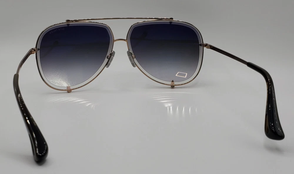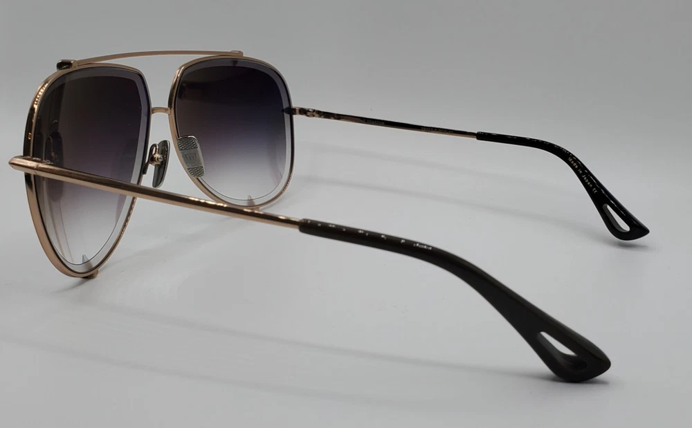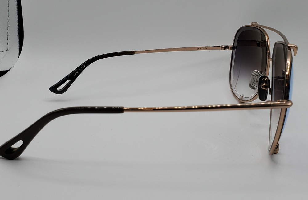 These Dita Sunglasses in the Talon (23007-F-RGD-62-Z) model feature a stylish Aviator design with a rose gold titanium frame and gray gradient flash lenses. The lens technology includes gradient and mirror features. Made in Japan, these unisex sunglasses also showcase a rose-themed aesthetic with a sleek and modern appeal. The sunglasses come with plastic lenses and have a temple length of 135 mm.