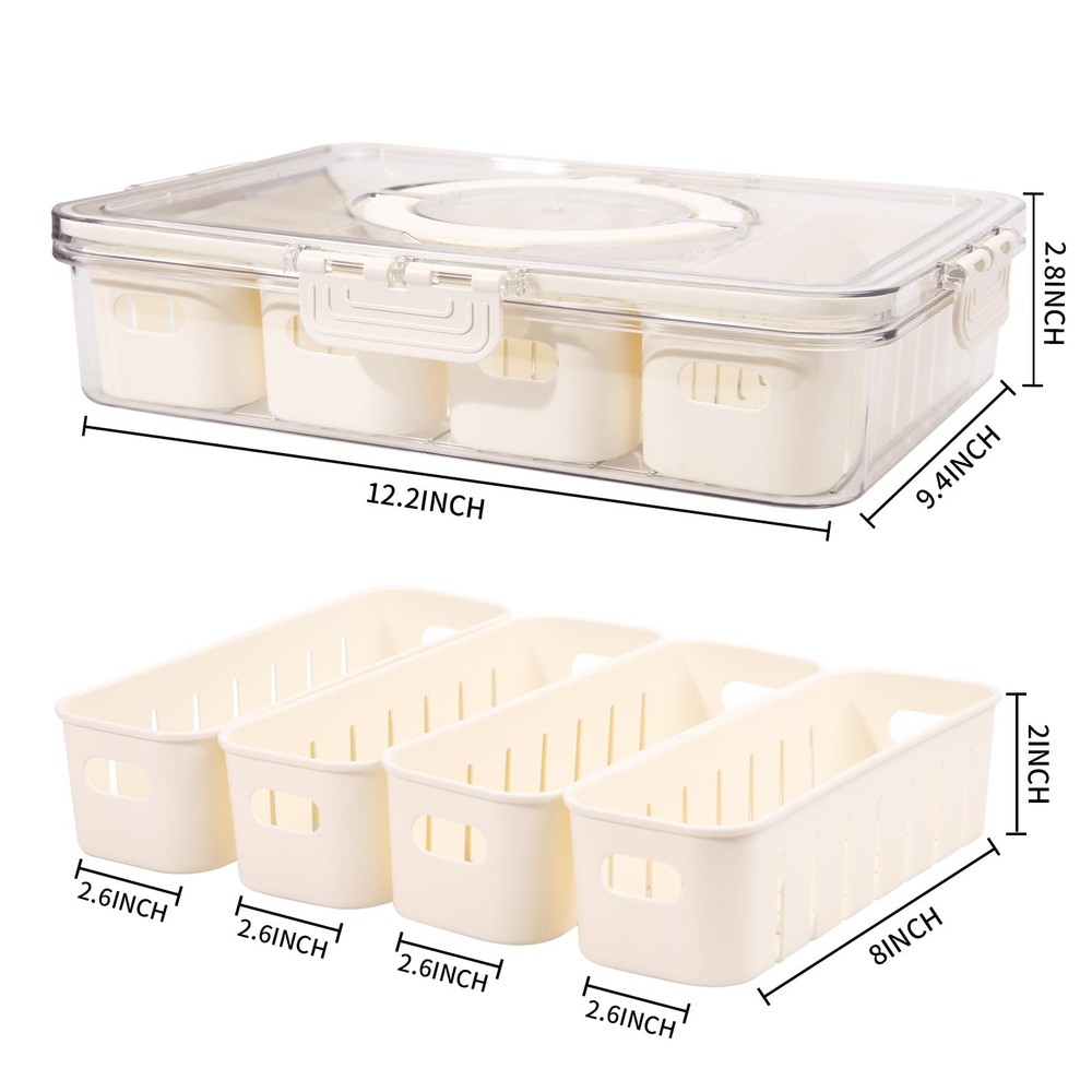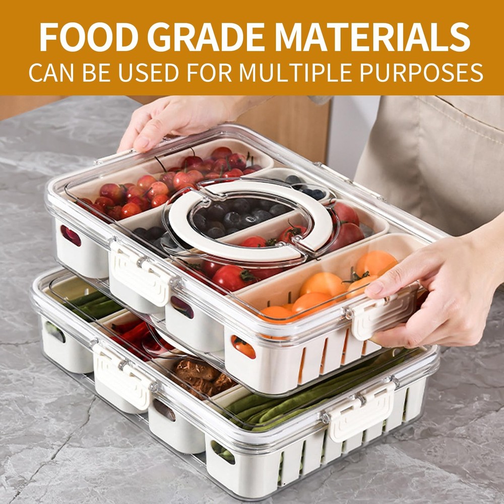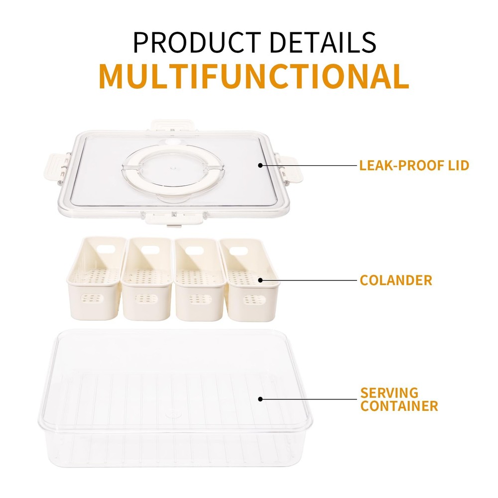 The product is a divided serving tray with lids, handle, and 4 removable colanders, serving as a portable and practical snack box for kitchen organization and storage with features like efficient drainage, multi-compartment design, convenient handle, but not suitable for microwave or dishwasher use. Portable and Practical: The snack box measures 12.2*9.4*2.8 inch. It has ample space for candies, fruits, nuts, fitting in a fridge. Its compact design allows easy carrying in a backpack or picnic basket, ensuring snacks are accessible on the go Efficient Drainage System: The serving tray is designed with a remarkable draining function. This allows for any excess liquid or moisture to be effectively removed, ensuring that snacks stay dry and crisp, maintaining their optimal texture and taste Thoughtful Multi-Compartment Design: With multiple compartments, this snackle box offers excellent organization. It enables users to separate different types of snacks, preventing them from getting mixed up and making it convenient to access Convenient Handle Design: The handle on the meal prep container is a practical addition. It makes it effortless to carry the box around, whether it's for taking snacks on the go or simply for moving it from one place to another at home Usage Tips: Please note that it is not suitable for use in a microwave oven or a dishwasher. Microwave heating may damage the box and its components, while dishwasher use can cause deformation. Wipe it with a damp cloth and mild detergent if necessary