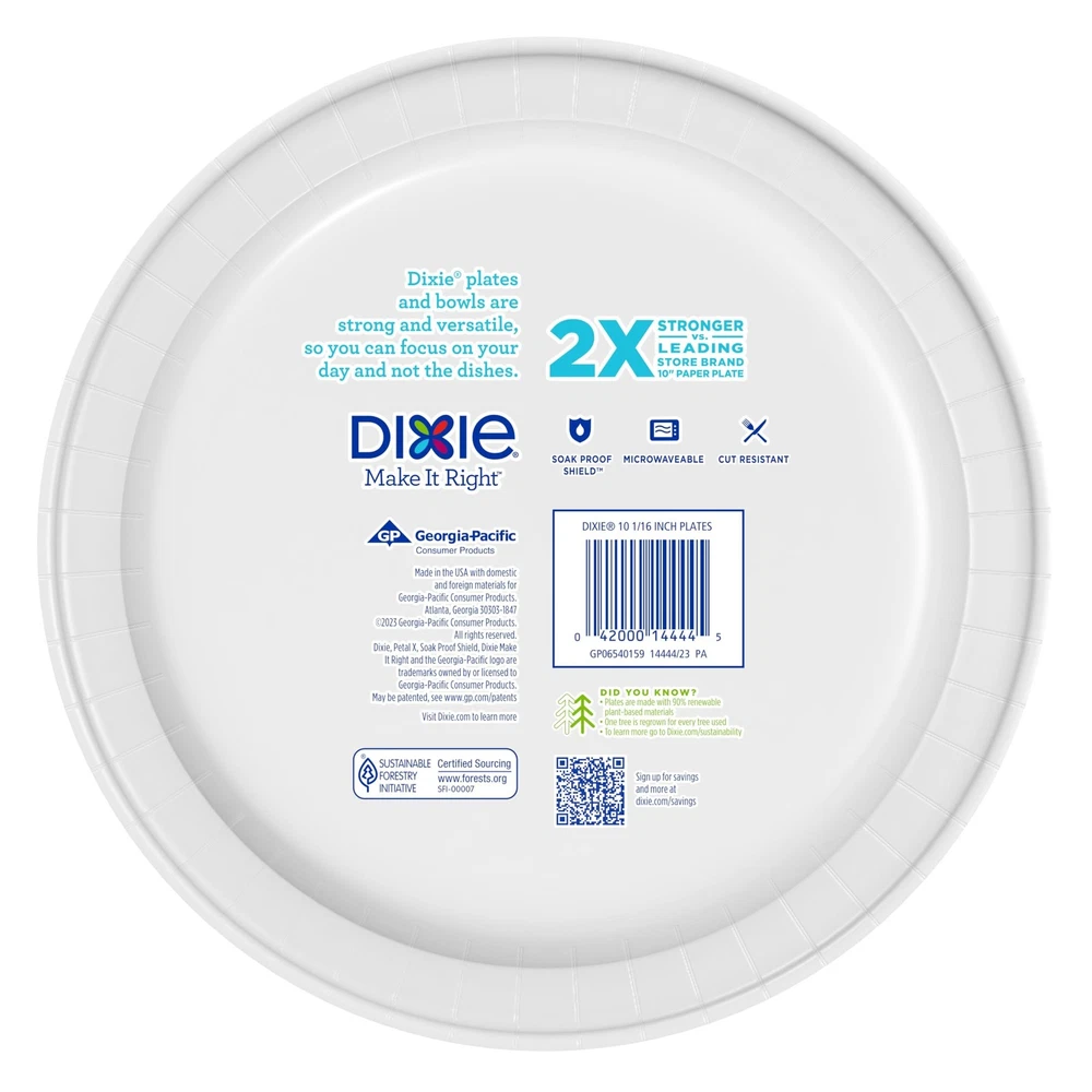 Durable and versatile—Dixie disposable 10 in. paper plates* are perfect for serving everyday meals at home, parties, picnics, and barbecues to make mealtime hassle-free 2x stronger—Two times stronger than the leading comparable store brand 10” paper plate, so you can dish up your heaviest, messiest meals with confidence Strength and Performance—Microwaveable, cut-resistant, and a Soak–Proof Shield to hold up against dressings, sauces, and grease Responsibly made—Dixie 10” paper plates deliver the same strength and performance, but with the added benefit of being compostable except in CA. Convenient pack size— Includes 150, 10” large paper plates to meet your mealtime needs. All Dixie products (paper bowls and paper plates) manufactured in Georgia- Pacific facilities are kosher certified by the Orthodox Union.