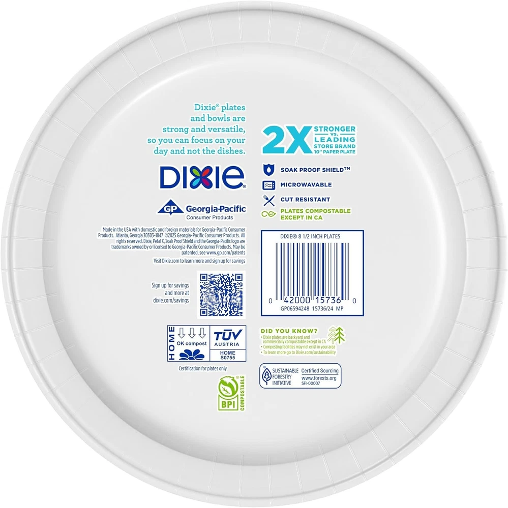 Dixie® Disposable Paper Plates make everyday mealtime stress-free and enjoyable. With our 8.5 inch paper plates, you can serve all your favorite dishes without worrying about cleaning up messy dishes afterwards. Our Soak Proof Shield™ prevents saucy, soupy, and greasy foods from seeping through the plate, so you can rest assured that your plate will stay dry and intact. Dixie® Paper Plates are durable, microwave-safe, cut-resistant, and designed to hold foods like grilled chicken, burgers, or steak. With 90 plates in each bulk paper plates pack, Dixie® plates are premium quality and convenient for all your dining needs, letting you focus on the moment with peace of mind. Enjoy meal time with Dixie® Paper Plates 8.5 inch today! Strong, durable, and convenient with 90 paper plates in each bulk paper plates pack, so you can focus on your day and not the dishes Dixie Disposable Plates are Microwave Safe, Cut Resistant, and have a Soak-Proof Shield that can handle anything from salad dressing to burger grease Dixie Medium Paper Plates 8.5 inch: the perfect medium size plate for breakfast, lunch, and dinner from everyday meals to parties and picnics Dixie Paper Plates are 2X stronger than the leading comparable store brand 10” paper plate Batteries required No Finish types Matte Diameter 21.5 Centimeters Item model number 10042000157381 Unit Count 90 Count UPC 042000157360 Manufacturer Georgia Pacific Global Trade Identification Number 00042000157360 Reusability Disposable Is Dishwasher Safe No Material Feature Soak-proof Is Microwaveable Yes Item Weight 2.3 Pounds Finish Type Matte Size 90 Count (Pack of 1) Product Care Instructions Hand Wash Only Pattern Floral Number of Pieces 90 Recommended Uses For Product Salad Product Dimensions 8.58"L x 8.58"W x 4.18"Th Shape Round Style Modern Special Feature Disposable,Resistant Color Multicolor Material Paper Brand Dixie 6818261