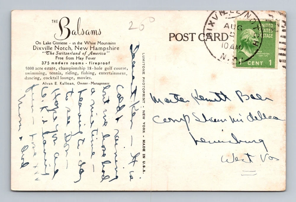 Country: USA Original/Licensed Reprint: Original Country/Region of Manufacture: Unknown Subject: Cities & Towns Unit of Sale: Single Unit Postage Condition: Posted Region: New Hampshire Theme: Cities & Towns Era: Vintage Type: Printed (Lithograph) Size: Standard (5.5 x 3.5 in) Material: Paper City: Dixville Notch