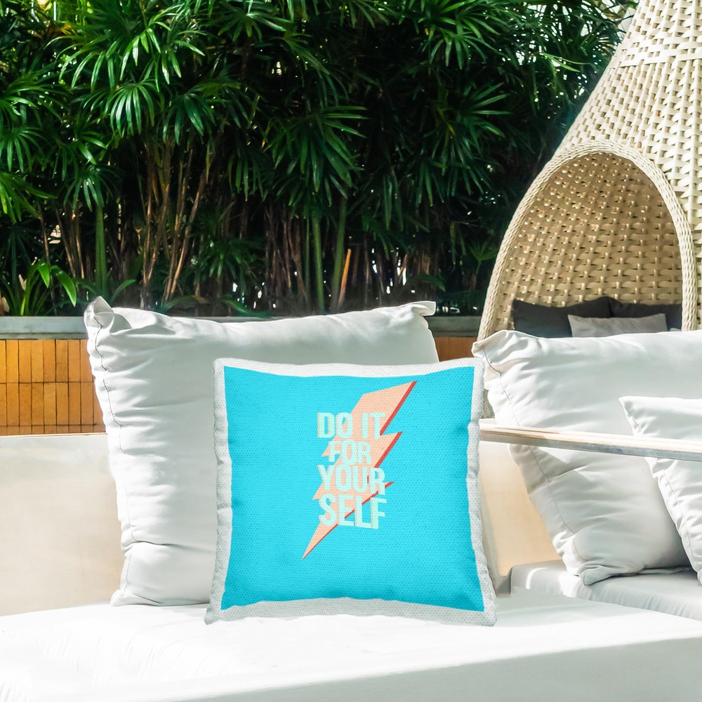 Dimensions: 18 x 18 Inches, Including Filling Insert Decorative outdoor pillows are a great and easy way to decorate your outdoor living space, adding both a decorative accent and comfort. Pillows arrive with insert already zipped inside and ready to fluff. Casing and filling insert are both made of quick-dry soft polyester material. The printing process makes the ink part of the fabric for greater outdoor durability. To wash remove filling insert from casing using invisible zipper. Clean pillow case separately, machine wash on delicate with cold water and mild detergent. For best quality hang dry. Pillow insert is spot clean only. Artwork Relates To: Phrase, Uplifting, Motivational, Inspirational, Do It For Yourself Design by Ashley Singleton