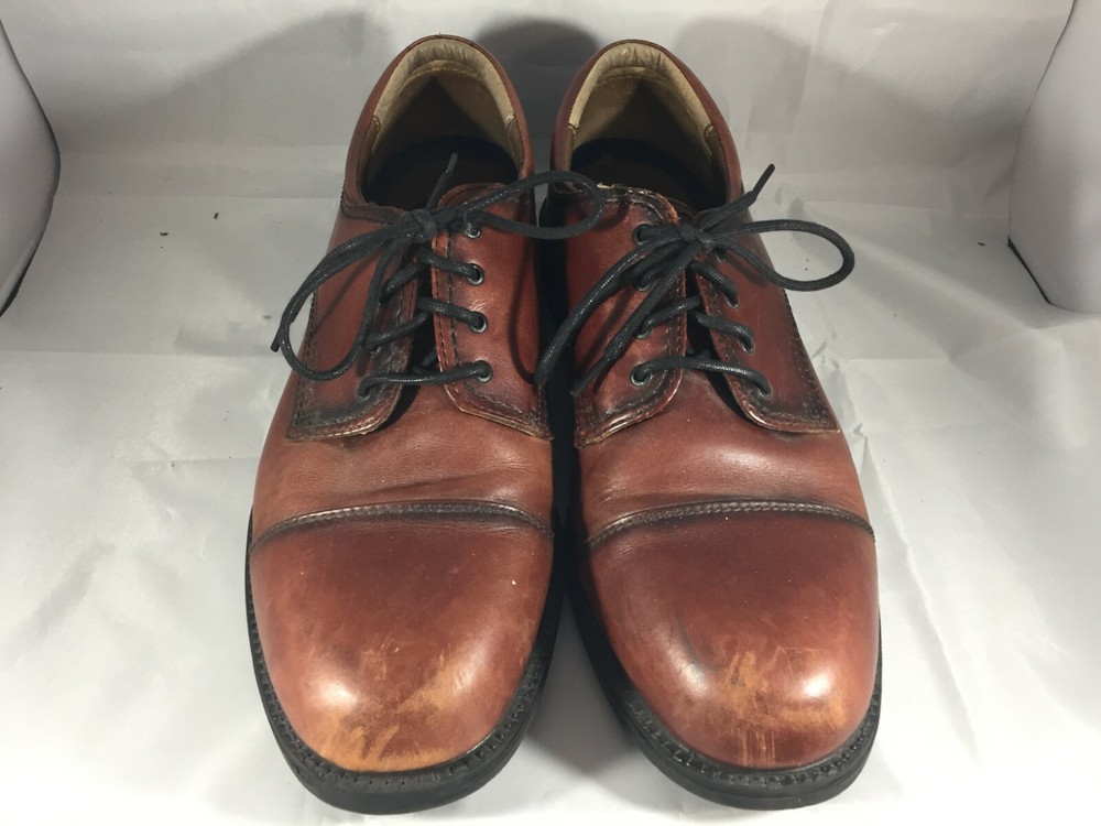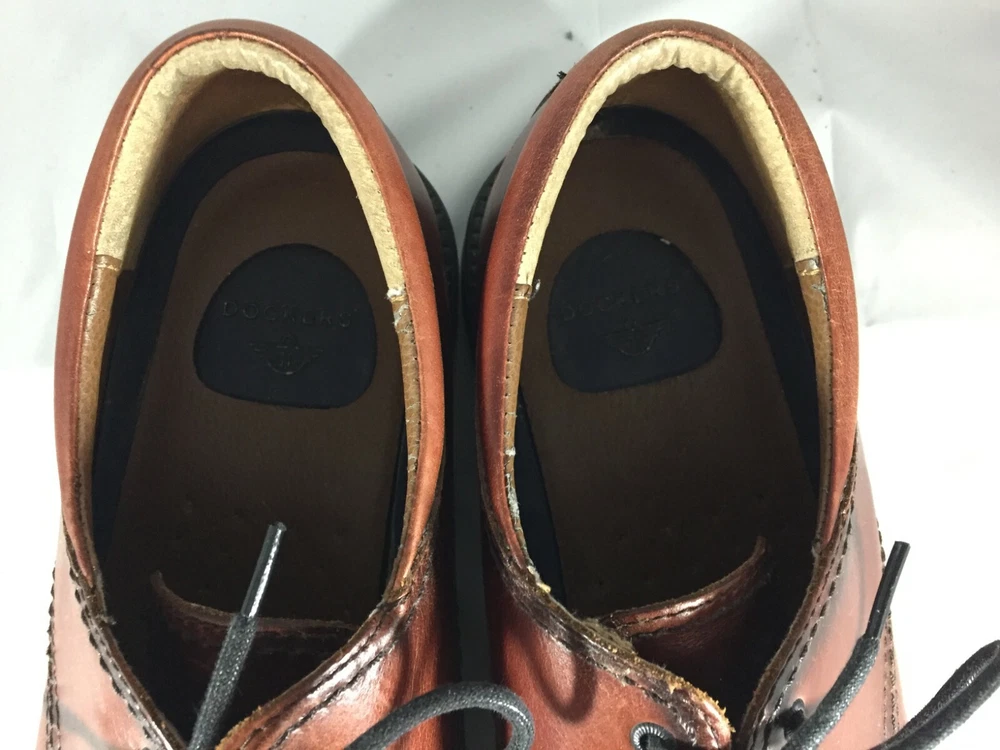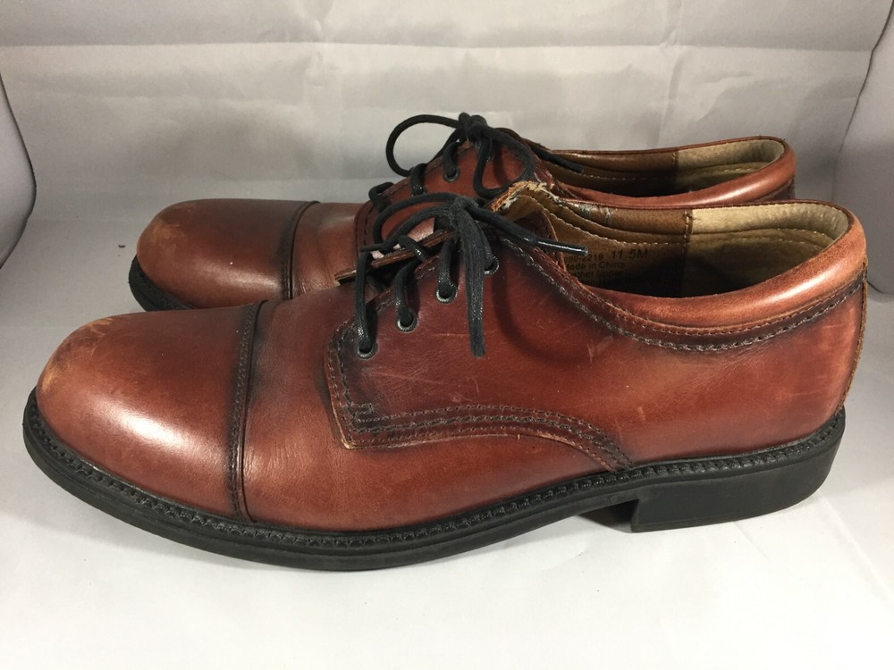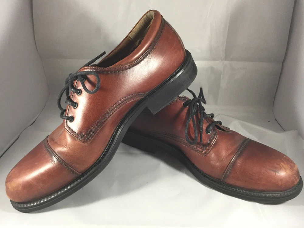 The Dockers Brown Leather Cap Toe Shoes are a stylish and versatile option for men looking for a sophisticated dress shoe. With a classic Oxford style, lace-up closure, and solid brown color, these shoes are perfect for a variety of occasions including weddings, formal events, or going out in the city. Made with high-quality leather, these shoes feature a cap toe design that adds a touch of uniqueness to the traditional style. The rubber outsole provides durability and traction, making them suitable for all seasons. Very good preowned condition with normal preowned wear. Please see all photos.