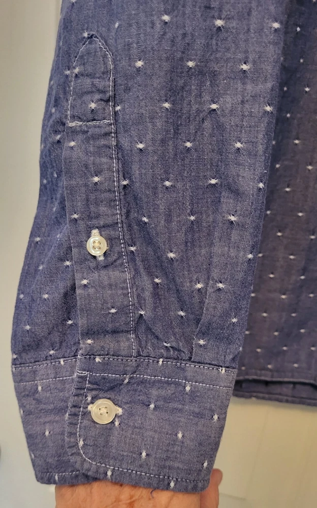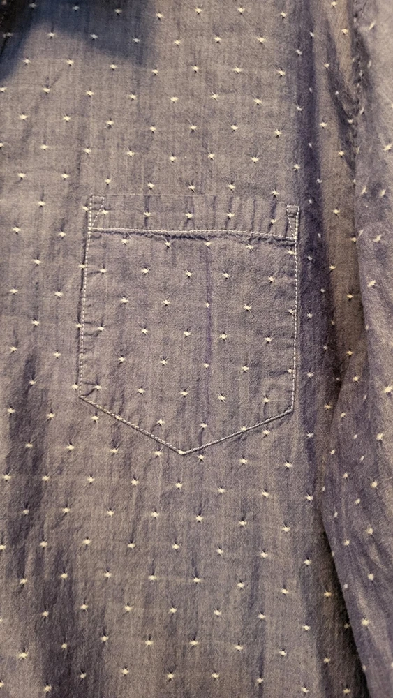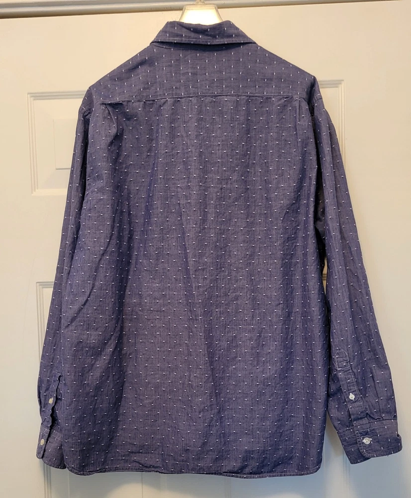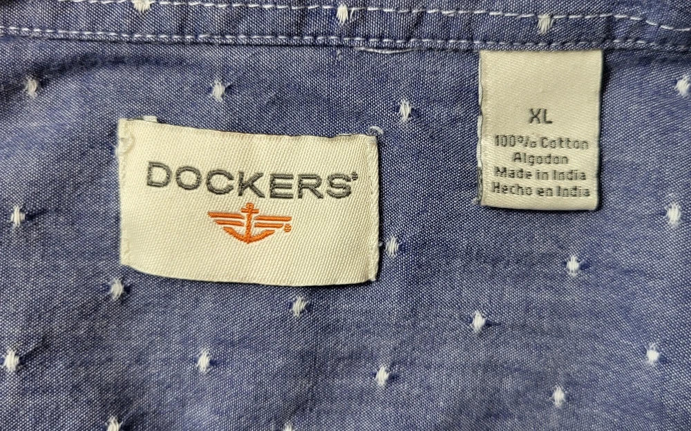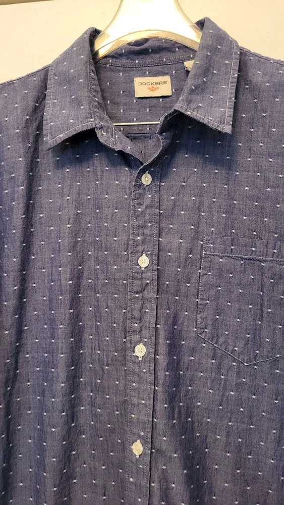 Elevate your wardrobe with the timeless elegance of the Dockers Men's Blue and White Button-Up Dress Shirt. Designed for the modern man, this regular fit XL shirt features a classic collared neckline with a sharp point collar style and long sleeves finished with barrel cuffs. The striking blue hue is complemented by the subtle spotted pattern, adding a touch of sophistication to your ensemble. Crafted from 100% cotton, this woven dress shirt ensures all-day comfort for any occasion, from business meetings to weddings. It's machine washable for easy care and boasts features like easy-care fabric and a handy pocket for functionality. Whether paired with slacks for work or denim for a casual outing, this shirt is versatile for both formal and casual settings throughout all seasons. Pit to pit measures 25 in Shoulder to hem measures 31 in Good pre-owned condition shirt! Add it to your wardrobe today!