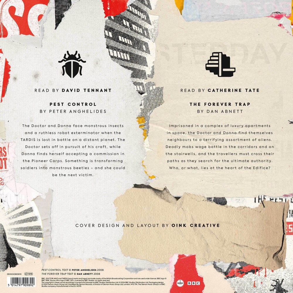 Further Details Title: Doctor Who: Pest Control & the Forever Trap Condition: New Format: Vinyl Edition: 12" Album Box Set Genre: Spoken Word No Of Discs: 6 Country/Region of Manufacture: Czech Republic Release Date: 05/24/2024 Artist: Doctor Who Record Label: Demon Records EAN: 5014797909892 Description: “There goes my TARDIS!” Demon Records celebrates David Tennant and Catherine Tate’s partnership as the Doctor and Donna with two audio-exclusive stories, read by the actors themselves. In Pest Control, read by David Tennant, the Doctor and Donna face monstrous insects and a ruthless robot exterminator when the TARDIS is lost in battle on a distant planet. The Doctor sets off in pursuit of his craft, while Donna finds herself accepting a commission in the Pioneer Corps. Something is transforming soldiers into monstrous beetles - and she could be the next victim. In The Forever Trap, read by Catherine Tate, the duo find themselves imprisoned in a complex of luxury apartments in space, and neighbours to a terrifying assortment of aliens. Deadly mobs wage battle in the corridors and on the stairwells, and the travellers must cross their paths as they search for the ultimate authority. Who, or what lies at the heart of the Edifice? This stunning box set, with an illustrated lift-off lid, features 6 x 140g vinyl LPs - three in Transparent Red and three in Transparent Yellow - each housed in a unique inner sleeve. A four-page booklet features sleeve notes by authors Peter Anghelides and Dan Abnett, who reflect on the process of writing for the Tenth Doctor and Donna, and how they regard the stories 17 years later. ow for the first time on vinyl, accompanied by original sound design and Murray Gold’s Series 4 arrangement of the familiar theme music, these two high-octane adventures are a reminder of the excitement, humour and magical wonder of Doctor Who. Style: Spoken Word MPN: DEMWHOBOX013 Type: Box Sets Release Year: 2024 Missing Information? Please contact us if any details are missing and where possible we will add the information to our listing.