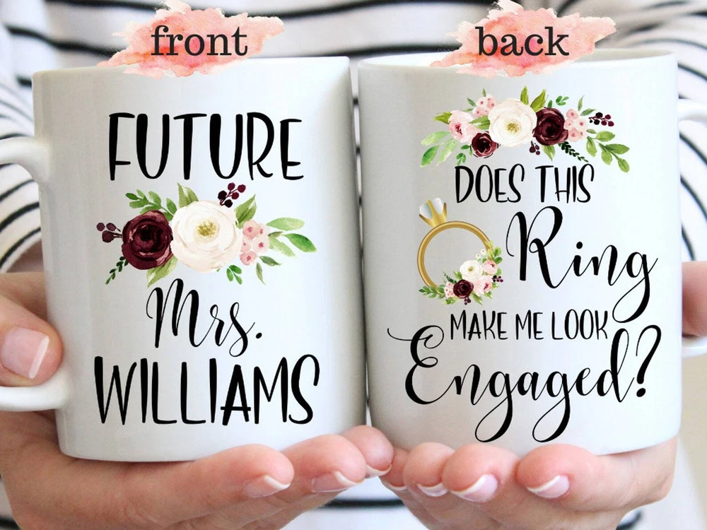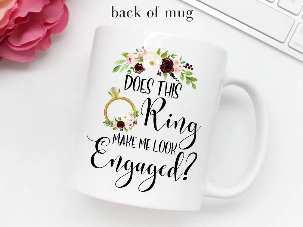 Does This Ring Make Me Look Engaged Mug Future Mrs Mug Bride To Be Mug Product Details.. This high quality 11oz. ceramic white mug has a premium hard coat that provides crisp and vibrant color reproduction sure to last for years. Perfect for all hot & cold beverages. The highest quality printing possible is used. It will never fade no matter how many times you wash it. Material: 100% Ceramic. Print both sides. Dishwasher and Microwave Safe. High Gloss + Premium White Finish. Printed in the U.S.A. Personalized & Custom. We support personalized and custom mug to add custom, when placing an order, you can add notes to the "order note" in shipping address section. Also you can contact us directly via message. Shipping Info. Ready to ship in 1 to 2 business days, All products are made-to-order and proudly printed in the United States. Shipped by USPS and DHL, You will receive your order in 5-7 days. Replace & Refund. All products are defective during shipping broken, chipped will be replaced free of charge. You are not satisfied with the product, we will refund 100% money to you. If any other issues arise, please do not hesitate to message, we would be more than happy to assist you.