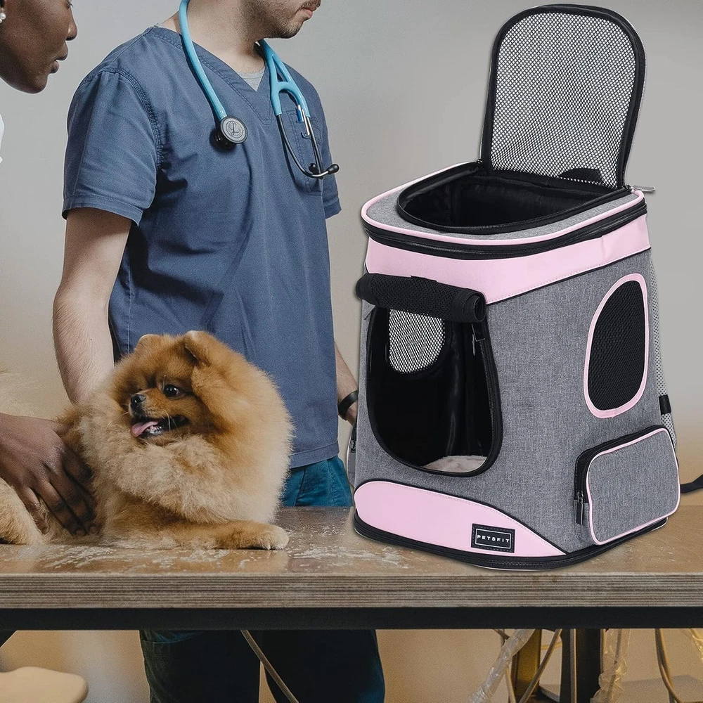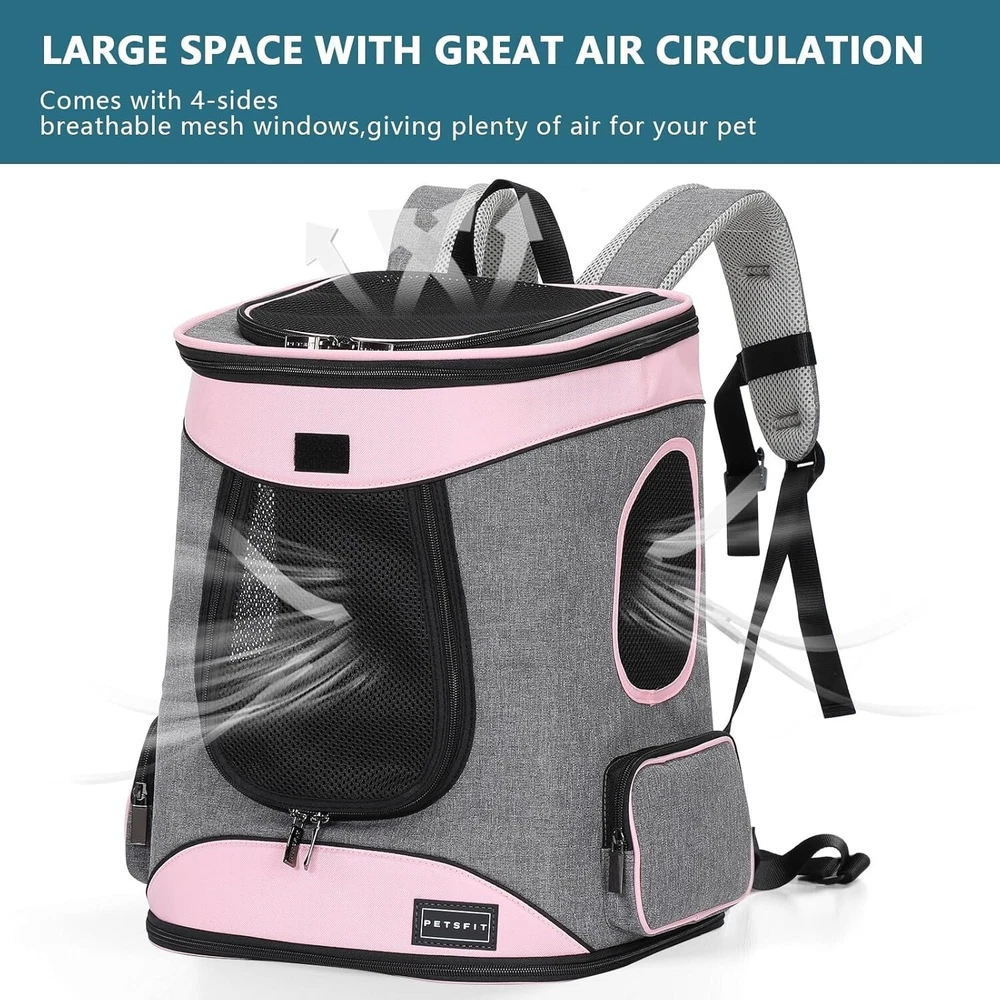 About this item NEW VERSION:Decompression design, upgrade back, increase waist protection design, more comfortable and fit our back, this cat backpack also has shoulder straps, waist and chest buckle, all help to reduce the burden, even if the long journey does not feel tired, take your pet on a trip now! DOG CARRIER BACKPACK DIMENSIONS: With roomy space, This Petsfit pet backpack dimension is 13.5"L x 12.5"W x 17.5"H, Perfect for cats, dogs bunnies up to 18lbs/8kg KEEP YOUR PET COMFORTABLE: Our cat backpack is equipped with a firmly reinforced structure to prevent itself from collapsing on your pet while traveling. Removable cozy mat for easier cleaning and let your pet enjoy it inside. 4 mesh windows give your pet great air circulation and visibility on the go KEEP YOUR PET SAFE:The cat backpack carrier adopts durable lockable zipper (in opening) and a build-in safety belt which prevent pet from escaping from inside, thickened zipper on the bottom, fine workmanship, durable and not easy to break ,providing better security for your pets MADE TO LAST:This cat backpack carrier is made of extra durable 600D Oxford Cloth, no more worry about the scratches or gnawing from your pets. Easy to fold, double side pockets can store food, water, garbage bags,you can use it to carry small dogs or cats for biking, camping, outdoor walking or meeting friends Why choose PETSFIT dog backpack carrier? The entrance door and top window adopt lock-type zippers design to prevent the zipper from being opened by pets, providing double protection Adjustable shoulder pad to reduce stress and improve comfort, there is a waist buckle at the bottom to prevent deviations from shoulder straps in order to maintain the stability of the backpack The built-in safety rope with hook can be connected to the dog's collar, to prevent pets from escaping and falling. When opening the top, it can ensure pet's safety Soft fleece mat for your pet to sit or sleep can be clean with a soft wet brush or take out for hand-wash or machine-wash. The double-sided used design will be perfect for different seasons At Petsfit, we focus on taking perfect care of your pet and are committed to providing you with something different, something better Product information Item Weight 3.66 pounds Manufacturer Petsfit ASIN B0C9D6WQLQ Country of Origin China Item model number DCC1502030AIZ2b Date First Available June 26, 2023 Item Package Dimensions L x W x H 15.94 x 12.91 x 4.21 inches Item Dimensions LxWxH 12 x 15 x 16 inches Brand Name Petsfit Target Audience Keyword Dogs Warranty Description 1 Model Name DCC1502030AIZ2b Color aPink Material Polyester Age Range Description Puppy Manufacturer Petsfit Style Casual Included Components pet backpack Specific Uses for Product Outdoor