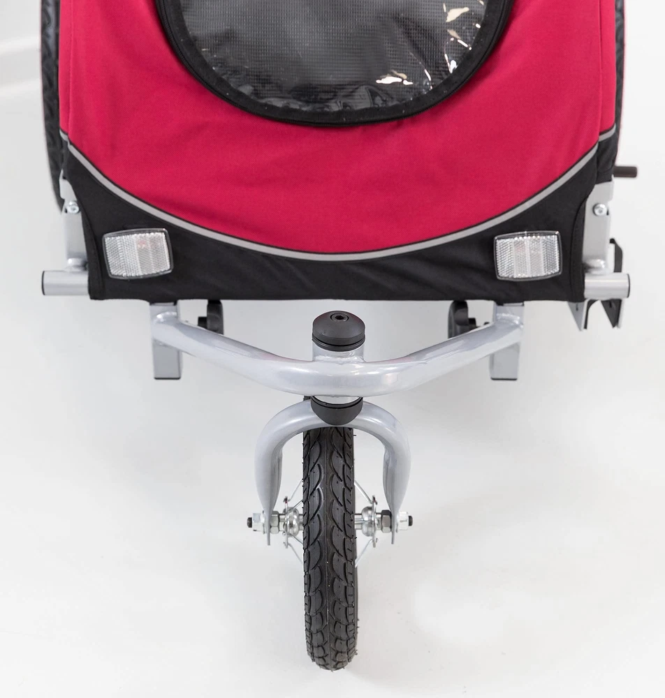 Product Description Convert the Dog Bike Trailer into a versatile, all-terrain jogger/stroller with the Stroller Conversion Kit 12817. If you switch between cycling, walking, and jogging, then the Bike Trailer is right for you. You can park your bike and hit the trails on foot, and your buddy will enjoy the same comfortable ride in his familiar trailer/stroller. Convert the Dog Bike Trailer into a stroller with our easy-to-install Stroller Conversion Kit – includes a handlebar, front swiveling wheel and mounting arm, parking brake, and all required hardware. Each order comes with 1 x Conversion Kit for Jogging Buggy Set Contains: Each order comes with 1 x Conversion Kit for Jogging Buggy Conversion from a bicycle trailer to a jogging buggy Front wheel with 360 degree joint Parking brake Ideal comfort while travelling, also on uneven terrain Non-slip handle, Size: Large.Note: The article mentioned is a conversion kit for a bicycle trailer. This means that this product is just an extension of Bicycle Trailer(which is a different product altogether).The rear wheels are part of the bicycle trailer and are therefore not included in the conversion kit.