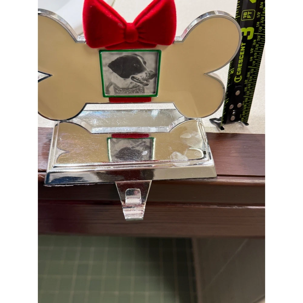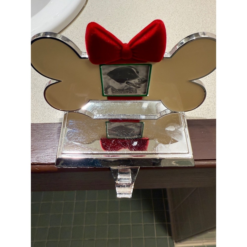 Dog bone Christmas stocking holder features a polished silver-tone base with a cream-colored bone-shaped topper. A festive red velvet bow sits atop a small square photo frame, allowing for a personalized touch with a picture of a beloved pet. The weighted design ensures stability on a mantel or shelf, while the underside is felt-lined to protect surfaces from scratches. Measurements: • Width: 5" • Depth: 3.75" • Height: 5"