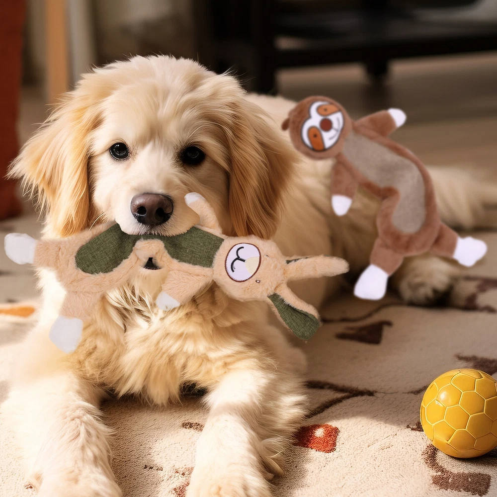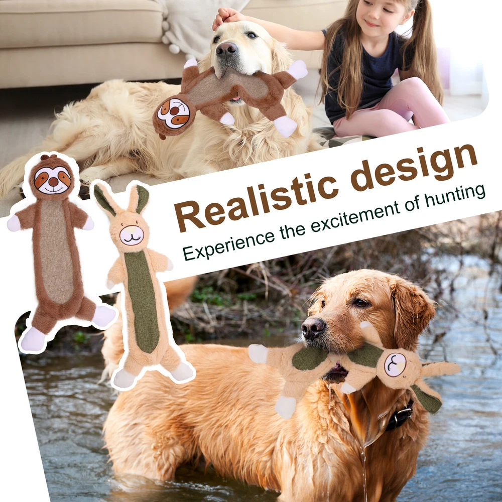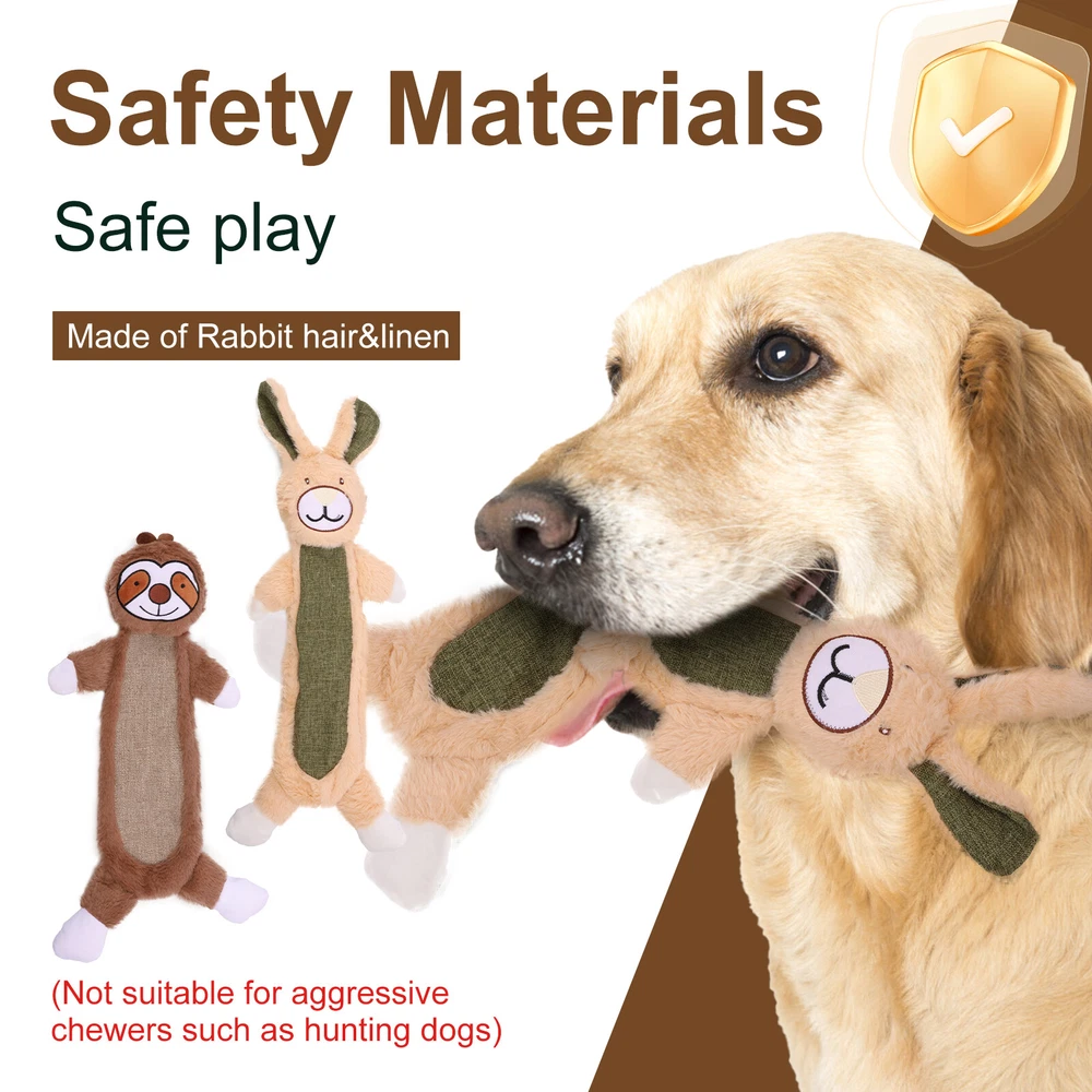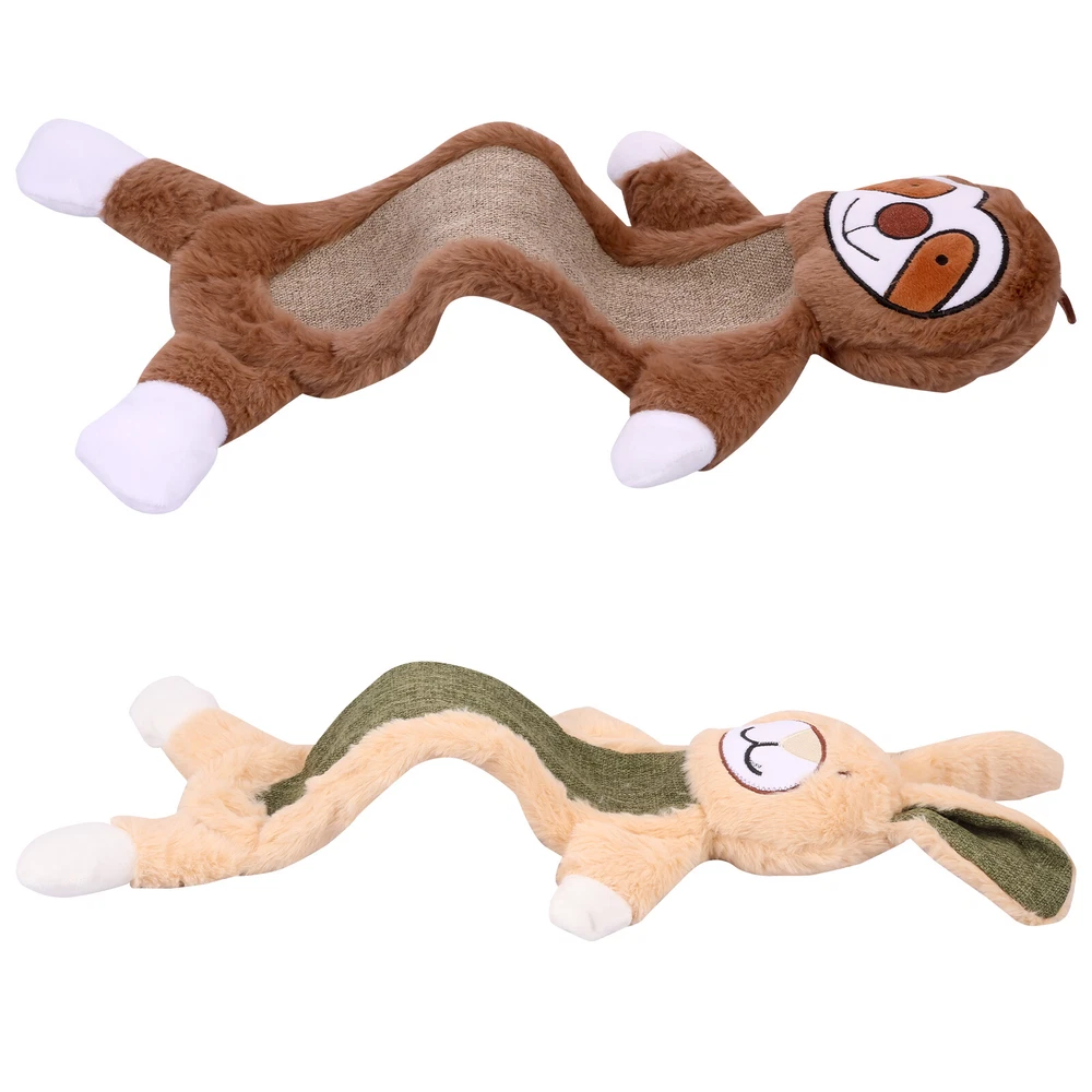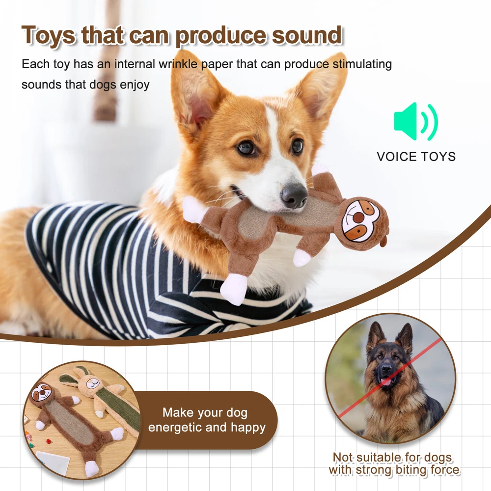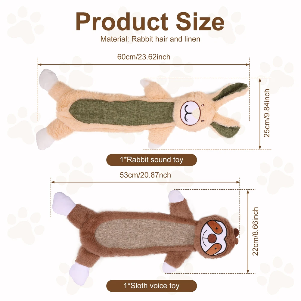 Parts List: 1×Sloth Shape Dog Plush Toy 1×Rabbit Shape Dog Plush Toy Highlight description: Charming Shape: Our dog toy adopts charming rabbit and sloth shapes, which is designed to engage your pet in interactive play and ignite your dog's playful spirit Safe Material: Our dog toy is made of safe material, remaining gentle on the dog's teeth and gums while the dog has fun playing. It has no additional fillers, like fabrics, cotton Crinkle Paper Design: Each plush toy has an inner crinkle paper that produces stimulating sounds that dogs love. This auditory element not only attracts their attention, but the squeaky sound adds an exciting sensory dimension Funny Dog Playmate: This toy can accompany the dog when the owner is out or busy. Whether your dog likes to fetch, chew or simply snuggle with the toys, this product can satisfy it Note: It is worth noting that these toys are not suitable for aggressive chewers such as hounds. We still need to use caution for indestructible tough chewers Detailed description: Description: This plush dog toy is wear resistant and chew resistant, making it fun to play while remaining gentle on your dog's teeth and gums. It features fun rabbit and sloth shapes to engage your dog in interactive play. It has a crinkle paper interior that creates stimulating sounds that dogs love. Feature: Sound Making Toy: This plush dog toy can make crinkle sound to attract dog attention and add an exciting sensory dimension. Interactive Toy: Our dog toy can engage your pet in interactive games and making your pet's playtime more dynamic and enjoyable. Specification: Product Name: Dog Plush Toy Product Material: Faux Rabbit Fur+Linen Product Size: Sloth shape toy unfolded size: 53×22×5 cm Rabbit shape toy unfolded size: 60×25×6 cm Product Weight: Sloth shape toy: 92g Rabbit shape toy: 92g Color: As Shown Notes: 1.It is worth noting that these toys are not suitable for aggressive chewers such as hounds. We still need to use caution for indestructible tough chewers. 2.There may be slight differences between the picture and the actual color of the commodity. We will try our best to show you the exact color. 3.Please allow slight dimension difference due to manual measurement.