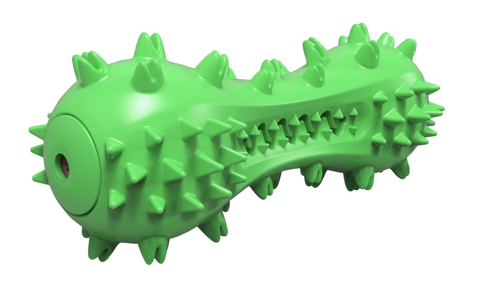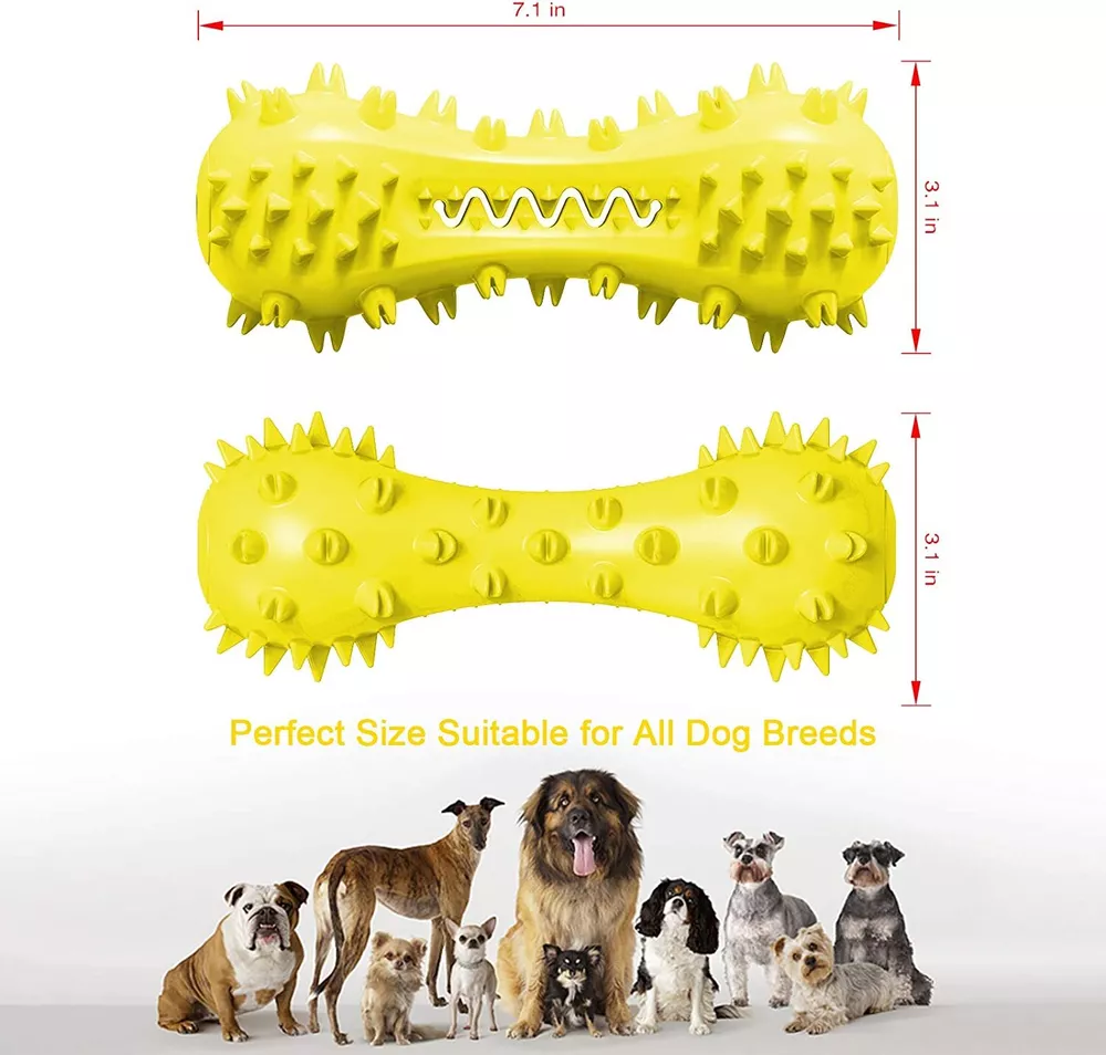 Dog Squeaky Chew Toy Specifications: •1. Size: 7.1*3.1*3.1in / 180 x 78.7 x 78.7 mm. •2. Weight: 5.6oz / 160g •3.Color: Yellow, Turquoise, Green •4. Material: Natural Rubber Note: •1. Please clean the toy regularly. •2. You'd better put some food kibble that your dogs like on it to attract them. •3. This Rubber Chew Toy is lightweight and soft different as the heavy tough Nylon Chew Toy. Dog IQ Training Toy This dog toy keeps your dog playing all day without getting bored, making them more lively and lovely. LIFEIN helps provide mental and physical stimulation. Squeaky Dog Toys The both ends are equipped with a sound devices, it can make a squeak to attract the dog's attention when your dog is biting or playing with it, thereby increasing the dog's more interest in playing. Tooth Cleaning Toy This LIFEIN dog toys can be used as a dog tooth cleaning brush. Squeezing toothpaste on toys can effectively help dogs clean their teeth, reduce their mouth odor and help dogs grow up positively and happily. Soft Durable Rubber Material • Rubber Chew Toy is designed for dog teeth cleaning, it's lightweight soft but durable and safe for dogs gums. • So it's different from the Nylon Chew Toy, which it's heavier, tough and hard as bone, good on heavy duty chewing but risk on gums hurting. Safe Insipidness Material • This dog chew toy is insipidness for absolutely safe chewing. • So you'd better put some food kibble that your dogs like on it to attract them to chew, like toothpaste, peanut butter, mashed potatoes , pumpkin puree, etc. Easy to Clean •You can easily wash it by hand with the attached brush. For the durable surface, you don't need to worry about damaging this toy due to repeated cleaning.