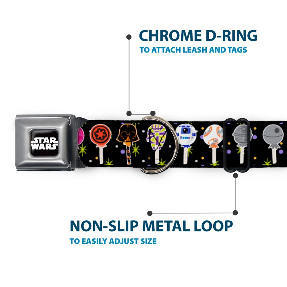 Further Details Title: Dog Collar SWBJY-STAR WARS Logo Full Color Black/White Star Wars Festive Lollipop Icons Black/Multi Color WIDE-Large 20-31" Condition: New Release Date: 05/14/2021 Item Weight: 190g Item Height: 25mm Age Level: ‎All Life Stages Brand: Star Wars MPN: WSW221-1.5-L Item Length: 787mm Size: 1.5" Wide - Fits 20-31" Neck - Large Number of Items: ‎44795 Type: Dog Collar Seatbelt Buckle Material: Alloy Steel, Polyester Pattern: Dog Dimensions: 31 x 1.5 x 1 inches; 6.72 ounces Item Width: 38mm Color: Multicolor Description: Your dog will be the talk of the town when people notice they're wearing this awesome SeatBelt Dog Collar! Made from high-density polyester and durable steel components, this collar is built to last. It features beautiful vibrant artwork. The buckle is a miniature authentic SeatBelt Buckle, so you press the center button to release the clasp. This product is assembled in the USA by Buckle-Down Inc. and officially licensed by Star Wars. Closure: Buckle Dog Breed: ‎All Breed Sizes Fits 20-31" neck size and is 1.5" wide. The buckle is a miniature authentic SeatBelt Buckle, so you press the center button to release the clasp. Made from high-density polyester and durable steel components, this collar is built to last and features beautiful vibrant artwork. This patented product (D609,408) is assembled in the USA by Buckle-Down and is officially licensed by Star Wars. Matching leads/leashes available. Missing Information? Please contact us if any details are missing and where possible we will add the information to our listing.