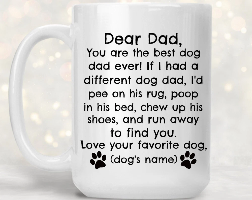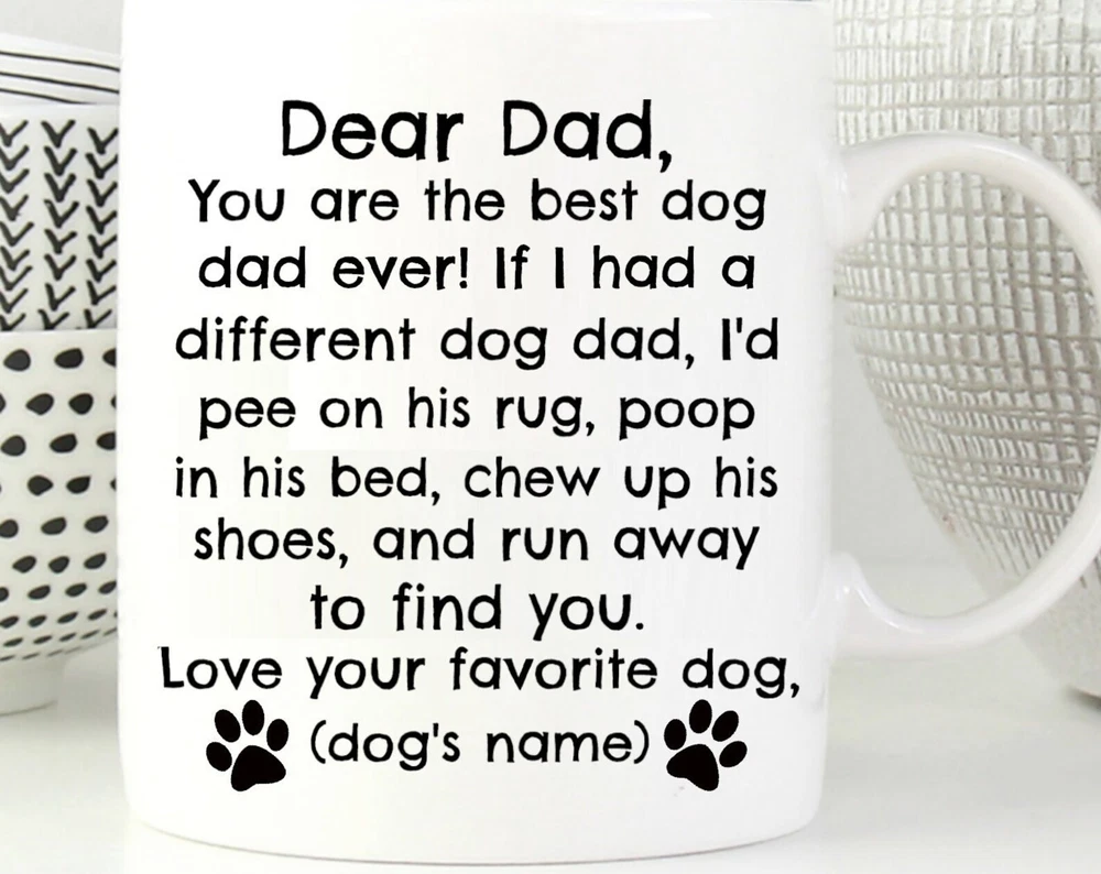 Dog Dad Mug Personalized Mug Father's Day Gift Funny Dad Gifts Dear Dog Dad Dog Product Details.. This high quality 11oz. ceramic white mug has a premium hard coat that provides crisp and vibrant color reproduction sure to last for years. Perfect for all hot & cold beverages. The highest quality printing possible is used. It will never fade no matter how many times you wash it. Material: 100% Ceramic. Print both sides. Dishwasher and Microwave Safe. High Gloss + Premium White Finish. Printed in the U.S.A. Personalized & Custom. We support personalized and custom mug to add custom, when placing an order, you can add notes to the "order note" in shipping address section. Also you can contact us directly via message. Shipping Info. Ready to ship in 1 to 2 business days, All products are made-to-order and proudly printed in the United States. Shipped by USPS and DHL, You will receive your order in 5-7 days. Replace & Refund. All products are defective during shipping broken, chipped will be replaced free of charge. You are not satisfied with the product, we will refund 100% money to you. If any other issues arise, please do not hesitate to message, we would be more than happy to assist you.