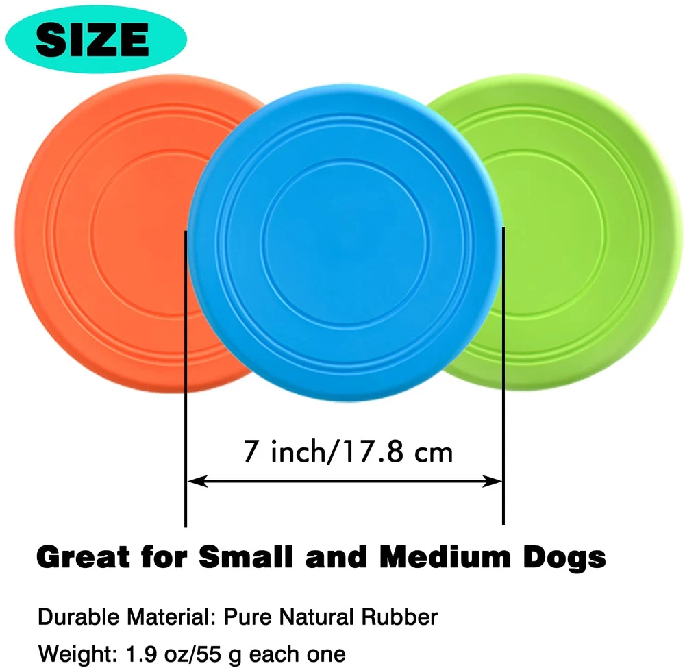 INTERACTIVE DOG TOYS:Dog flying disc designed for a high-flying game of fetch with your dog in the water, grass or snow. This flying disc dog toy is the perfect solution for fitness, exercise, dog training, and a great alternative to dog balls or tennis balls for dogs. Just chuck it and watch your pup go. DURABLE DESIGN AND SAFE ON TEETH: This flying disc for dogs features a durable, harmless pure natural rubber which is safe on your dog’s teeth and designed for lasting outdoor use. NOTE:PLEASE DO NOT LET YOUR DOG CHEW IT, NOT CHEWPROOF. AERODYNAMIC DESIGN FOR EASY FLIGHT:These soft dog flyer dics are designed for long distance flight.The aerodynamic grooved design makes the flying discs keep flying with just a flick of the wrist.Creates toys that enrich the human-animal bond & bright colors(Blue & Green)help dogs & puppies stay engaged. EASY TO CARRY: Our dog flying disc toy has a lightweight compact design for effortless carrying and easy storage, perfect for travel outdoor or walking.When your dog gets thirsty you can even turn it over and use it as a simple drinking bowl or food bowl. DOG TOY FOR VARY BREEDS:Includes 3 pcs dog flyer dog toys in each pack.Each size that is 7 inches in diameter.Ideal dog toys for large small dogs.Just add this dog disc to your dog tox box or give as unique dog gifts. Product Description Our XIGOU dog Flying discs is the perfect solution for fitness, exercise, and training. This flying disc features a durable, harmless pure natural rubber for long lasting outdoor use. With its lightweight, buoyant design, the dog discs floats in the water for interactive play at the beach, lake, or pool. Bright colors make the flying disc easy to locate in the bushes, leaves, and trees. Its 7.2-inch diameter makes it easy to bring your flying toys with you wherever you go. Simply, slide it inside your backpack, beach bag, or picnic basket for interactive, outdoor fun. Our dog flying discs provides a fun, engaging way to exercise with your dog. Get ready for a high-flying game of fetch with your best friend! Package: 2 pack dog flying discs Size: 7.2 inch Color: Blue and Green