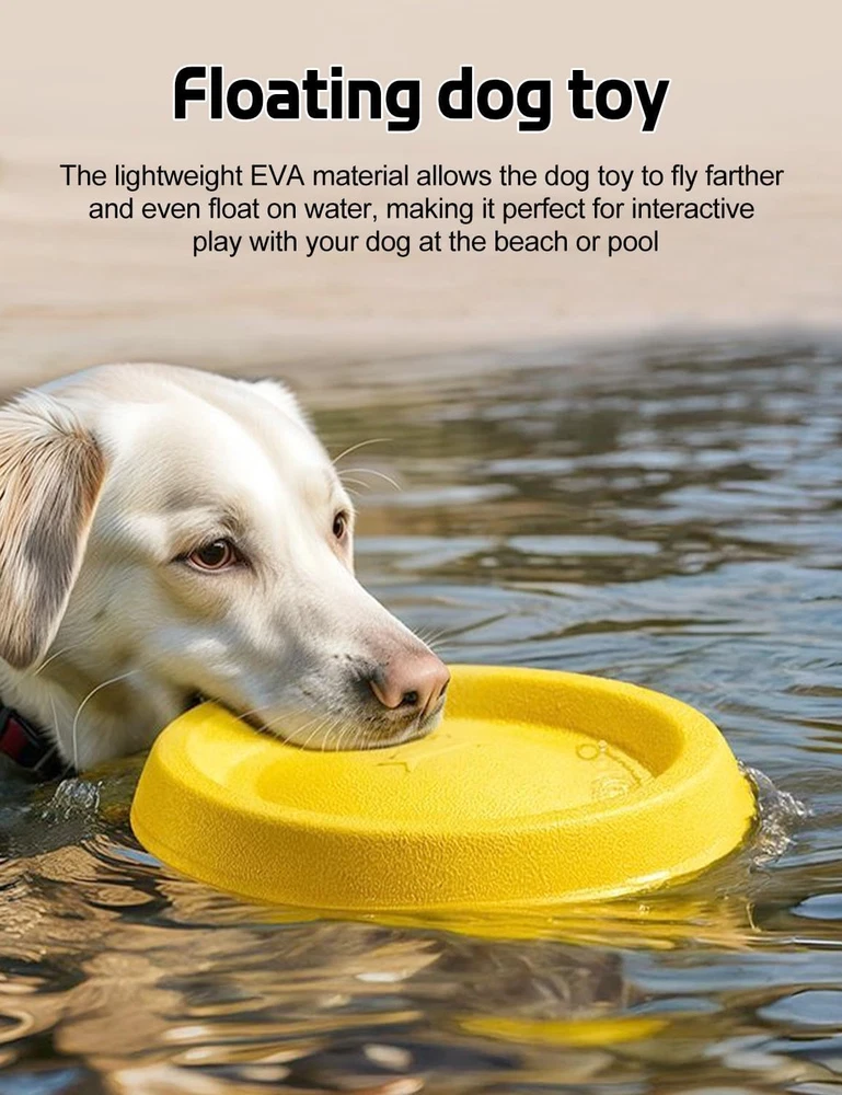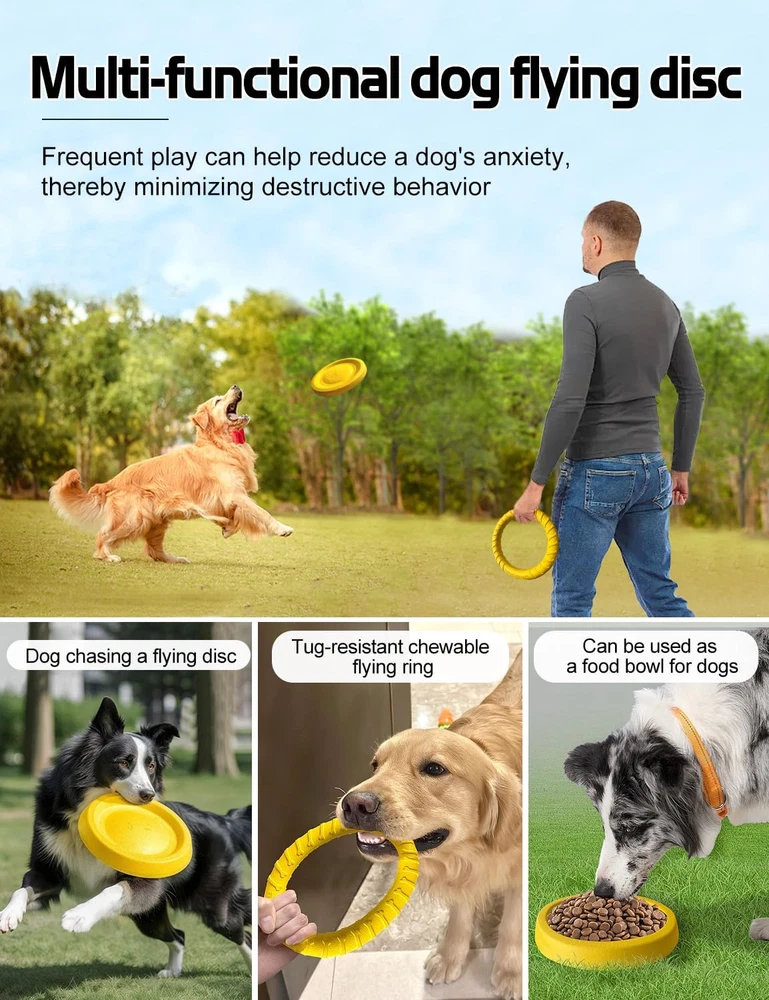 Flying Disc for Aggressive Chewers: Made from flexible EVA material, Moderately soft and firm, offering bite resistance while protecting your dog's teeth. While materials that are too hard provide excellent chew resistance, they can also damage your dog's teeth. Multi-Functional Dog Flying Disc: The flying disc features a grooved design and is approximately 0.99 inches thick, making it usable as a dog food bowl. Chew ring toy for dogs: Bite-resistant, recommended for dogs with aggressive chewing habits. Can replace a frisbee and is great for outdoor activities with your dog, such as fetch or tug-of-war. Helps alleviate anxiety and reduces destructive behaviors. Color Favored by Large Dogs: Yellow is a highly visible color for dogs, standing out against various backgrounds. This makes it easier for dogs to quickly locate the toy while playing, making training more fun and easily. Food-Grade Material: 100% safe, high-density, and odor-free, ensuring your dog’s health and your peace of mind. Floating Dog Toy: Lightweight and easy to carry, this toy can be used anywhere. The light EVA material allows it to fly farther and even float on water. Perfect for interactive play with your dog at the beach or pool. Note: The dog ring chew toy is bite-resistant and recommended for dogs with aggressive chewing habits. Product Description The video showcases the product in use. The video guides you through product setup. The video compares multiple products. The video shows the product being unpacked. The dog flying disc set provides everything you need for interaction, fitness, training, and play with your dog. Flying Disc dog toy Flying Disc for Aggressive Chewers Made from flexible EVA material, Moderately firm and soft, it provides a certain level of tear resistance while ensuring the safety of your dog's teeth. Floating Dog Toy: Lightweight and easy to carry, this toy can be used anywhere. The light EVA material allows it to fly farther and even float on water. Perfect for interactive play with your dog at the beach or pool. The video showcases the product in use. The video guides you through product setup. The video compares multiple products. The video shows the product being unpacked.