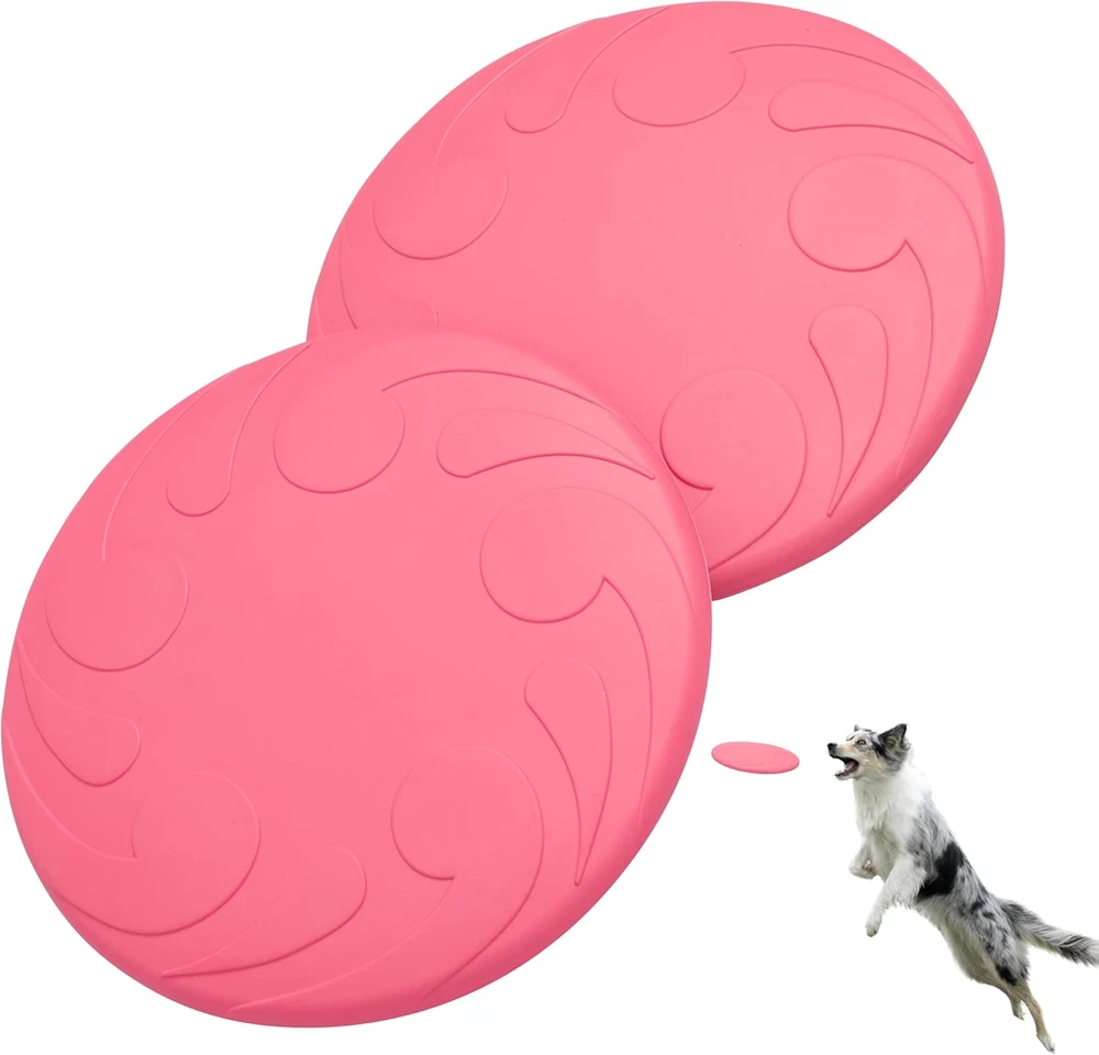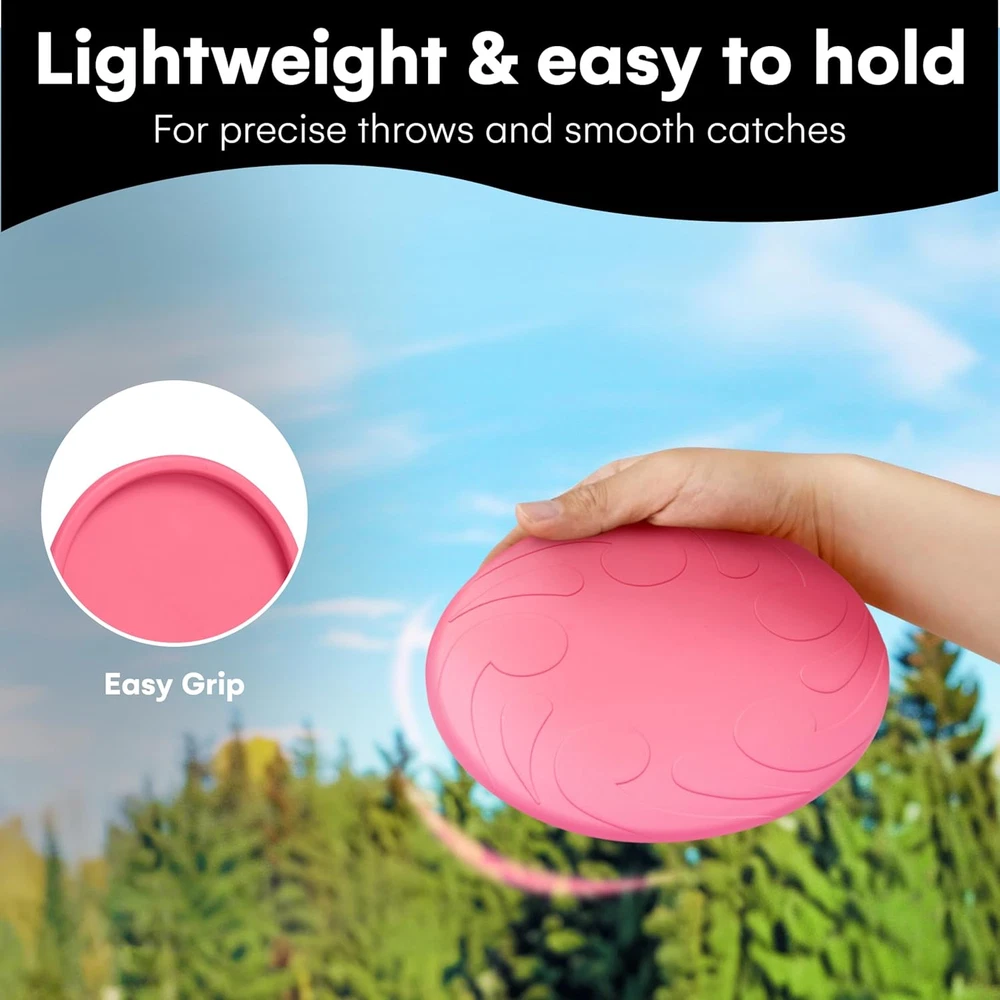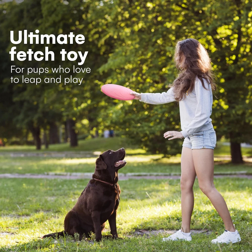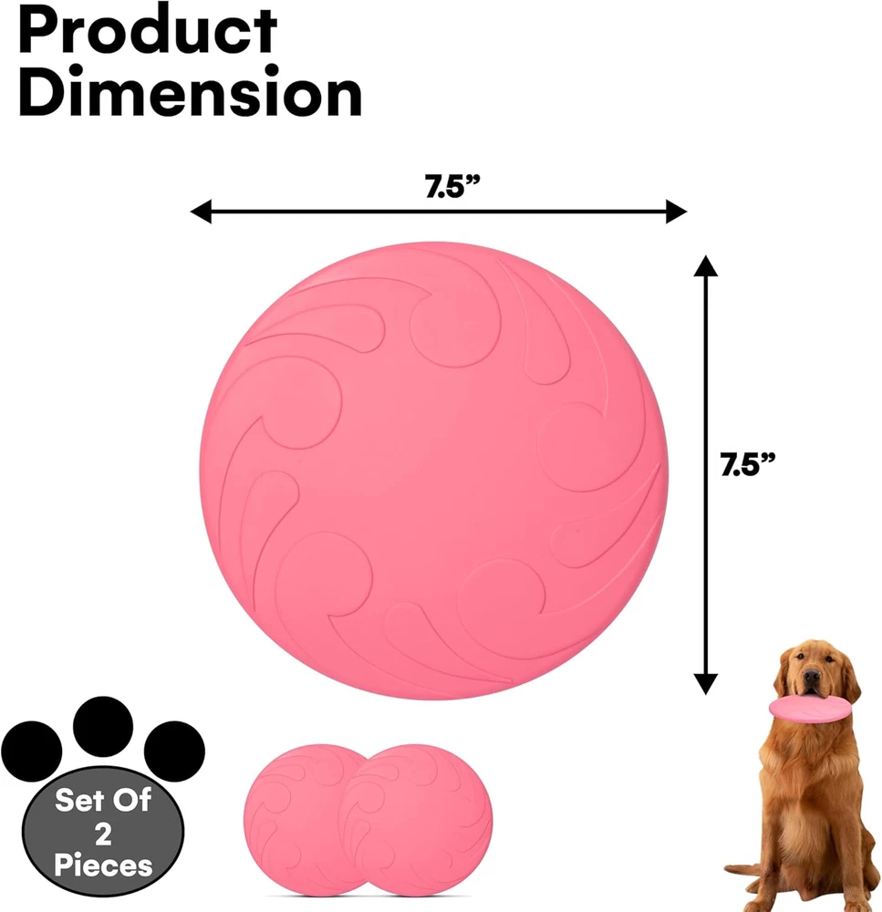 DURABLE CLASSIC RUBBER: This rubber dog frisbee is made of durable Classic Natural rubber, ensuring a safe, comfortable catch for your pet, be it a small dog frisbee enthusiast or a tough dog frisbee lover FLYING DISC TOY WITH DYNAMIC REBOUND: Our frisbee dog toy delivers a dynamic rebound if your dog misses the initial fetch, adding an extra layer of fun to playtime, perfect for frisbee dog games DOG FETCH TOY FOR HEALTHY EXERCISE: This dog chase toy, also a puppy frisbee, encourages your pet to stay active and supports their natural instinct to play, making it an ideal frisby for dogs SAVE BIG ON FREQUENT TOY REPLACEMENTS: Say goodbye to endless toy replacements, and choose the sustainable option. Our chew-proof dog frisbees, forged from renewable natural rubber, are built to last, saving you cash and cutting down on environmental waste SOFT AND SAFE FOR ALL DOGS: This soft frisbee for dogs is gentle on your dog's teeth and gums. Whether it's a puppy frisby or a doggy disc for an older dog, it's designed for safe, fun play. Product Description Crafted from Tough, Non-Toxic Rubber, This Indestructible Dog Frisbee Is Perfect for Rough Play, Soaring High and Staying Soft on Teeth for Endless Outdoor Fun. Easy to Hold Grip Set of 2 Pieces Durable and Stretchable Designed for Precise Throws, Our Frisbee Offers an Easy to Hold Grip for Smooth, Controlled Fetch Sessions.