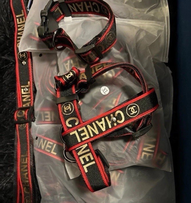 Dog harness and leash set with (Chanel ) printed on items