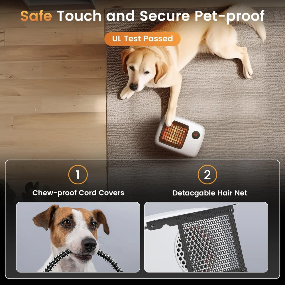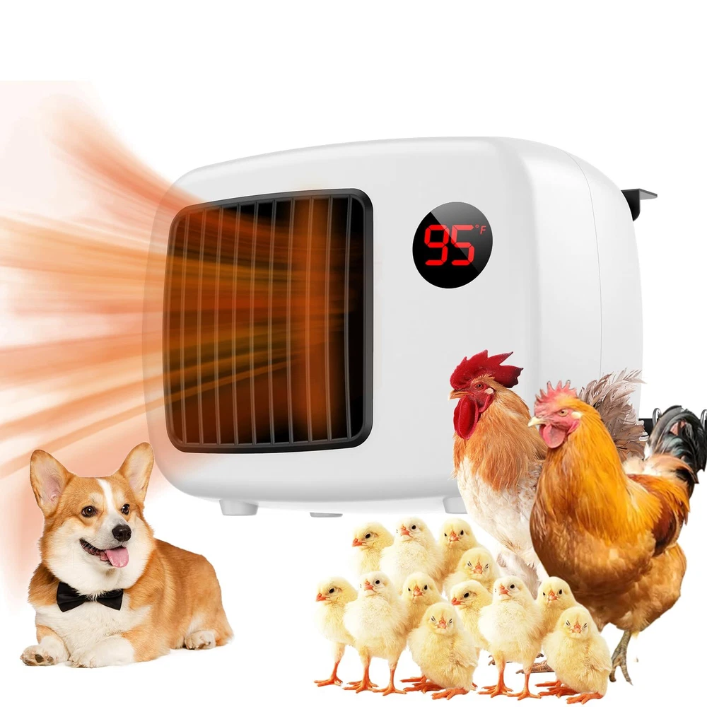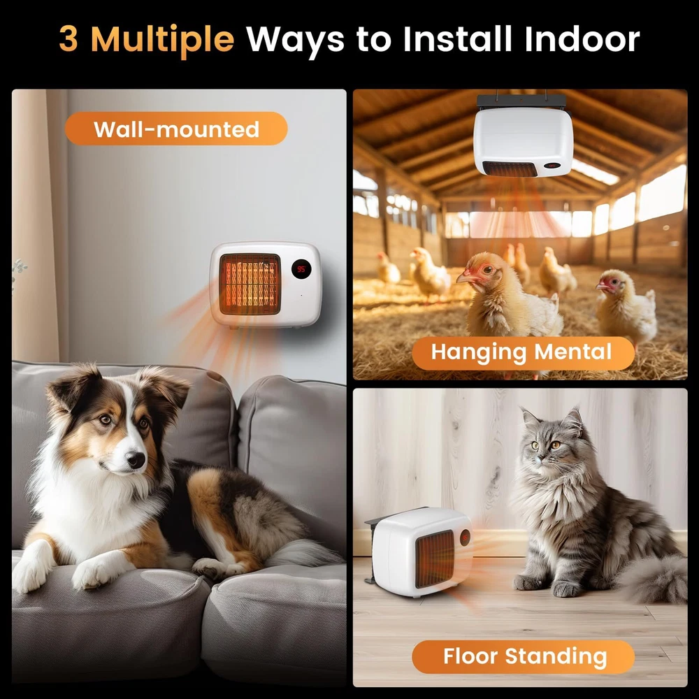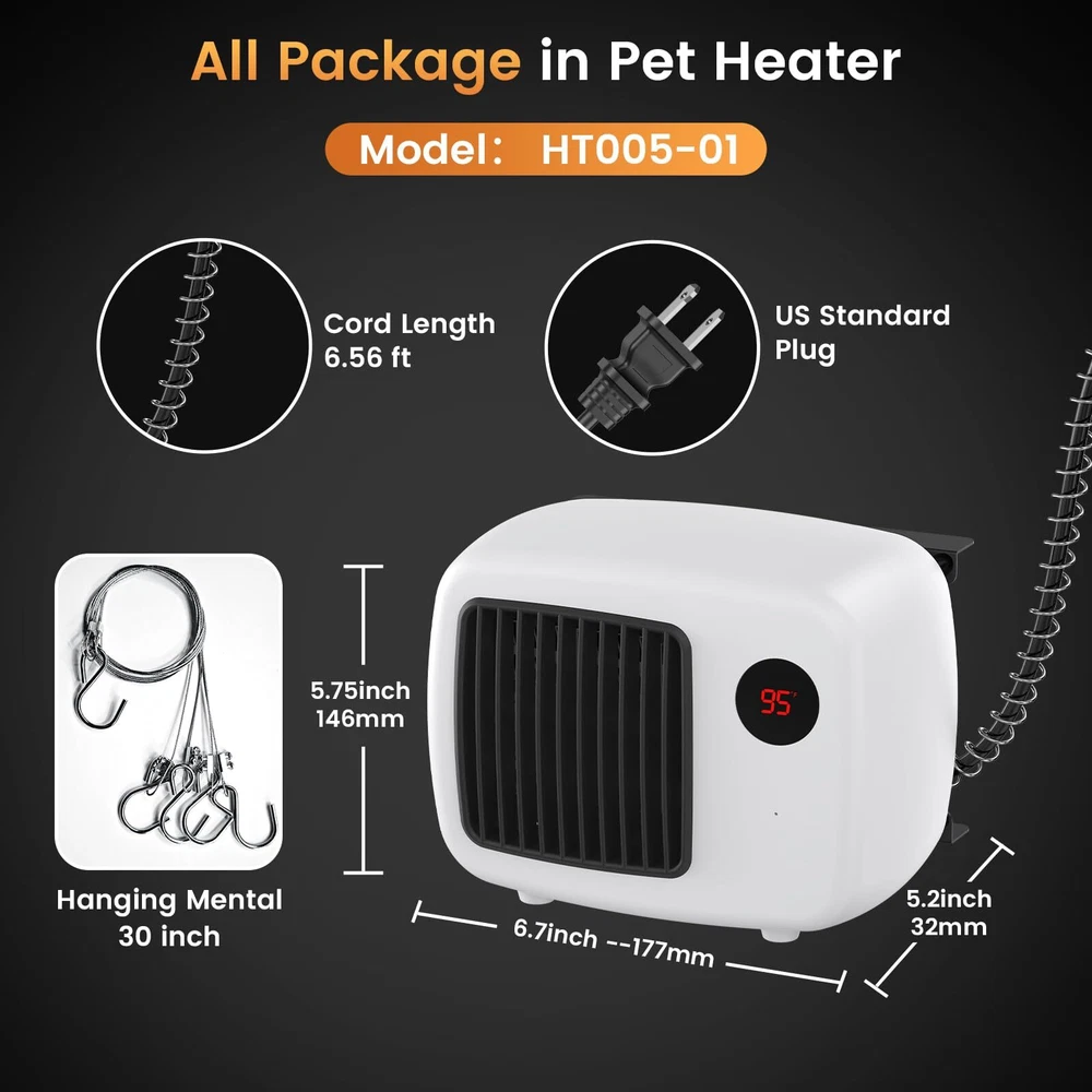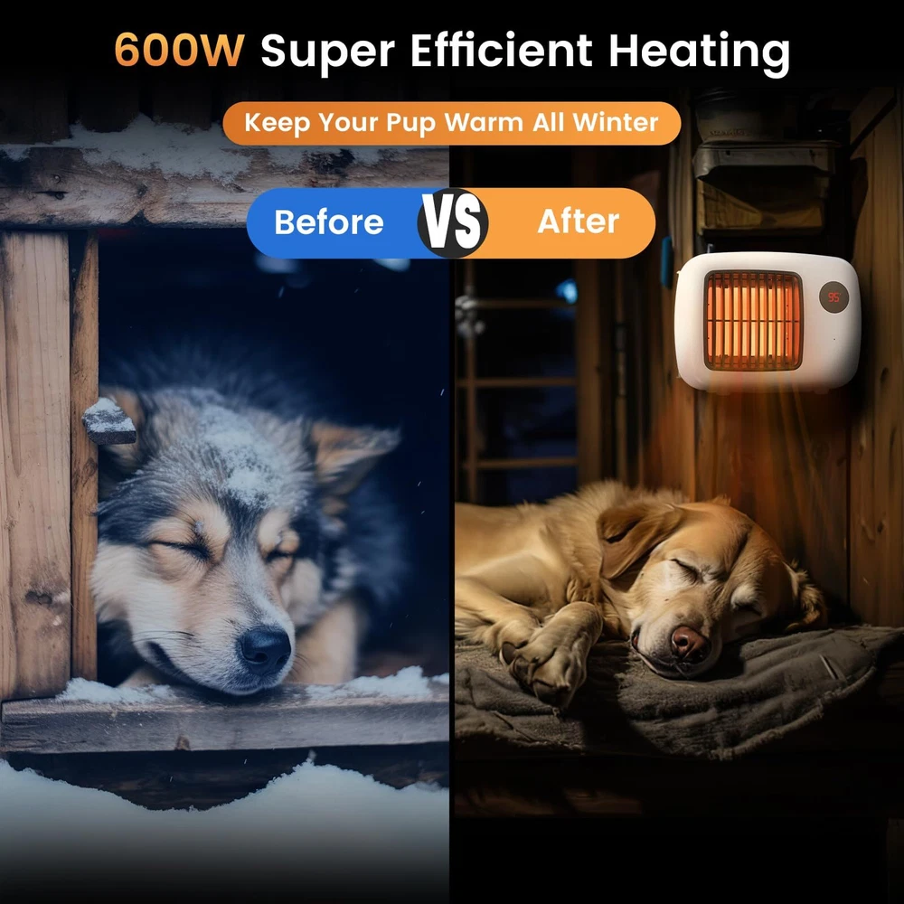 ๐๐๐๐ ๐๐๐๐ญ๐๐ซ ๐๐จ๐ซ ๐๐๐ญ ๐๐จ๐ฎ๐ฌ๐๐ฌ & ๐๐ก๐ข๐๐ค๐๐ง ๐๐จ๐จ๐ฉ๐ฌ: Our pet heater functions on 120V AC voltage with settings - 300W๏ผ95ยฐF๏ผ or 600W(100ยฐF), heating up an area of 150 square feet, depending on the airtightness of the room. The compact and lightweight model makes wall-mouting a breeze with dimensions of just 6.97x5.75x 5.2inches. ๐๐๐ฌ๐ข๐ ๐ง๐๐ ๐ฐ๐ข๐ญ๐ก ๐๐๐ญ๐ฌ ๐ข๐ง ๐๐ข๐ง๐: Our outdoor pet heater integrates multiple safety features, including a functioning thermostat, overheat protection, and an anti-chew cord. The insulated surface prevents any potential burns from touching the heater, making it perfectly safe for your pets. With a powerful capacity of up to 600W, it can quickly radiate a constant temperature to warm up your pet's space in just 3 seconds. ๐๐ฎ๐ฅ๐ญ๐ข๐ฉ๐ฎ๐ซ๐ฉ๐จ๐ฌ๐ ๐๐ข๐ง๐ญ๐๐ซ ๐๐๐๐ญ๐๐ซ ๐๐จ๐ซ ๐๐๐ซ๐ข๐จ๐ฎ๐ฌ ๐๐ง๐ข๐ฆ๐๐ฅ๐ฌ: Certified by ROHS, our hound heaters are effective for outdoor pet houses, chicken coops, rabbit hutches, as well as environments for other small livestock. They're especially beneficial for pregnant animals, newborn pets, and older animals by providing them with a warm haven during winter. Also fit |Outdoor Protable Greenhouse Heater. ๐๐ข๐ฆ๐ฉ๐ฅ๐ ๐๐ง๐ฌ๐ญ๐๐ฅ๐ฅ๐๐ญ๐ข๐จ๐ง ๐๐ง๐ ๐๐ฅ๐๐๐ง๐ข๐ง๐ : Our insulated waterproof heater comes with an independent safety bracket for easy installation. Mounting the heater is as simple as finding a point high enough to be out of pet's reach, making holes, and hanging the heater. Additionally, due to the magnetic hair guard at the back, cleaning pet hair and dust doesn't require dismounting the heater, ensuring daily convenience. ๐๐จ๐ฐ ๐๐จ ๐๐๐ฃ๐ฎ๐ฌ๐ญ ๐ญ๐ก๐ ๐๐๐๐ญ๐ข๐ง๐ ๐๐จ๐๐?? You Can Control the kennel heater If on High or Low:Note: if the outside dog house environment exceeds 100ยฐF (38ยฐC), the pet heating element will stop working and the heater will only blow air, not heat up; The heating element will restart and continue to heat up only when the temperature is below 95ยฐF (35ยฐC). Before pick us, Please measure the size of the dog house and where it will be installed in advance. ๐๐๐ฌ๐ข๐ ๐ง ๐ฐ๐ข๐ญ๐ก ๐๐๐๐๐ญ๐ฒ ๐๐จ๐ง๐๐๐ซ๐ง๐ฌ: pet heater is the new generation dog heater, with an adaptive variable temperature system applied๏ผ95ยฐ&100ยฐF๏ผ. The highest working temperature can reach 95ยฐF. The temperature will stop and keep space warm on 95ยฐF after reaching the highest temperature, then goes back to 95ยฐF. The processes will repeat over and over again. This dynamic heating process is designed to protect your pet from being burned and saves energy as much as possible. ๐๐ง/๐จ๐๐ ๐๐จ๐ง๐ญ๐ซ๐จ๐ฅ ๐ ๐ฎ๐ง๐๐ญ๐ข๐จ๐ง๐ฌ๏ผThere is no automatic shutdown, and there are 2 gears to choose from. We have received a lot of requests from our users for temperature adjustments as well as timings, and this year we are working on new feature requests. If you are interested in joining the Dog heater , please us. ๐๐๐๐ฉ๐ญ๐๐๐ฅ๐ ๐๐จ๐จ๐ค ๐๐จ๐ซ ๐๐ก๐ข๐๐ค๐๐ง ๐๐จ๐จ๐ฉ ๐๐ซ๐จ๐จ๐๐๐ซ๐ฌ: To cater to those running chick brooder programs, we've included a 25-inch adjustable lanyard, allowing you to hang the warmer for optimal heating. This simple installation process using 4 hooks will ensure your chicks and hens are warm and comfortable, preventing excessive hypothermia. The Dog House Heater is Durability &Strength, it come longevity for the Pet. We are deeply involved in the team around the life of pets and poultry, and also has a range of essentials for pets in winter: Dog and cat kennels heater and outdoor houses cat winter.