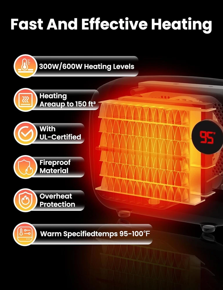 600W Dog House Heater: This dog house outdoor has a 600W output that can quickly provide sustained warmth within 3 seconds. The dog house heater provides 2 temperature settings (300W/600W) according to pets' needs, ensuring comfort in any weather Overheat Protection: Pet house heater has a built-in thermostat that automatically stops when the room temperature exceeds the safe range and restarts when it falls below the appropriate temperature, keeping your pets in a warm and comfortable environment Ensure Pet Safety: The power cord is protected by a steel spring to prevent pets from chewing through it. The heated dog house for outside includes a removable magnetic hair and dust filter for easy cleaning without removing the heater Easy to Install: You can place it directly on the floor, mount it on the wall with the tool, or you can use a rope to hang it above the chicken coop. This chicken coop heater can be easily installed in dog houses, chicken coop, and other pet enclosures Wide Use: The dog house heater outdoor operates at a low noise of 45dB, so dogs won't be irritated by the noise and it won't disturb your rest. It is suitable for a variety of scenarios including dog houses, chicken coops, cat kennels, and bunny sheds Product Description Anti-Bite Cords The 6ft chew-resistant cord, equipped with electric shock protection, effectively prevents pets from biting the cord and avoids injury. This ensures pet safety and prolongs the lifespan of the pet heater Easy Clean Feature The dog house heater features a magnetic, removable hair guard on the back to prevent pet hair from blocking the opening. It's easy to clean and convenient for daily use Overheat Protection the room temperature exceeds the setting temperature range will automatically stop working, when the room temperature is lower than the appropriate temperature the heater will restart heating