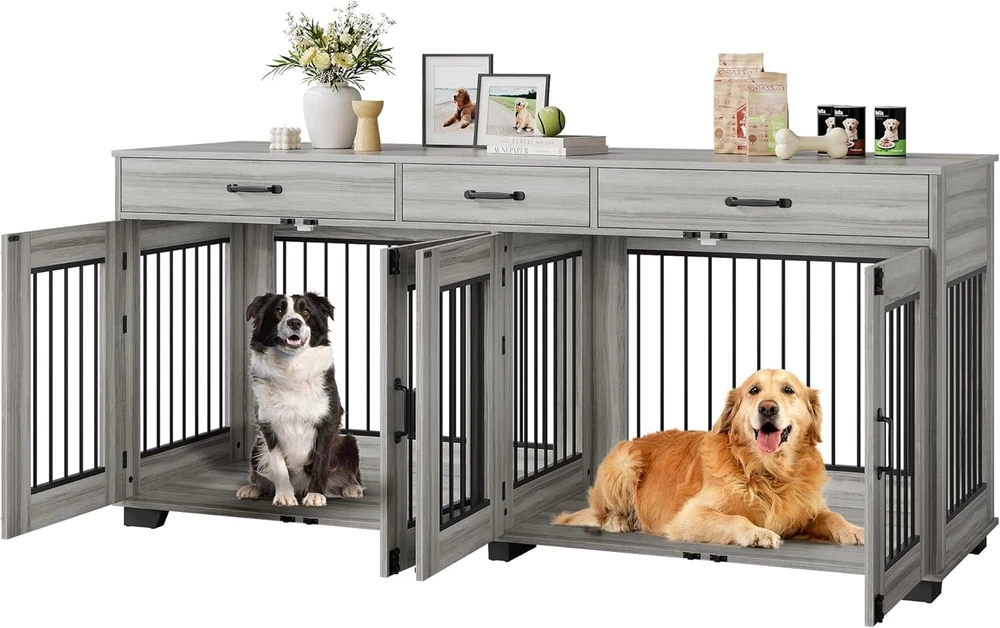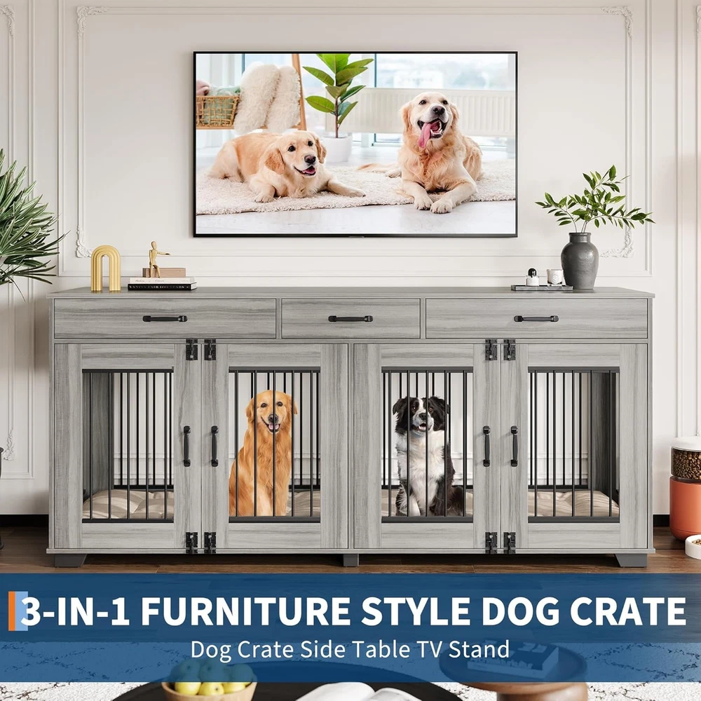 Product description Garvee 71 Inch Dog Crate Furniture Extra Large Storage Space Dog Crate & Tv Stand Dog Cage Furniture for 2 Dogs Wide Top Surface Is it easy to assemble? Yes, we provide detailed installation instructions and optimize the installation process and instructions, including each screw and panel are clear and easy to understand, adults can also assemble it easily. What size dogs are suitable for this 71-inch double cage? This 71-inch furniture-style double cage is suitable for most small, medium and large dogs. We recommend that you measure the size of your dog before purchasing. The size of a single room in the cage is 34.3"*22.1"*25.8". Is it sturdy and chew-resistant? Yes! It features 0.5-inch thick metal pipes and wooden boards, which are 0.15 to 0.2 inches thicker than a standard double dog crate. The thicker materials provide better load-bearing capacity and create a more durable product.