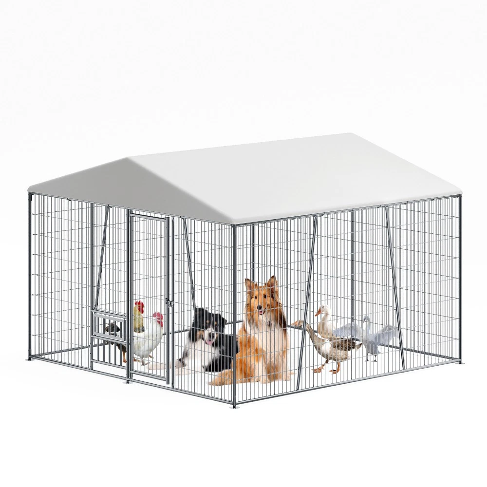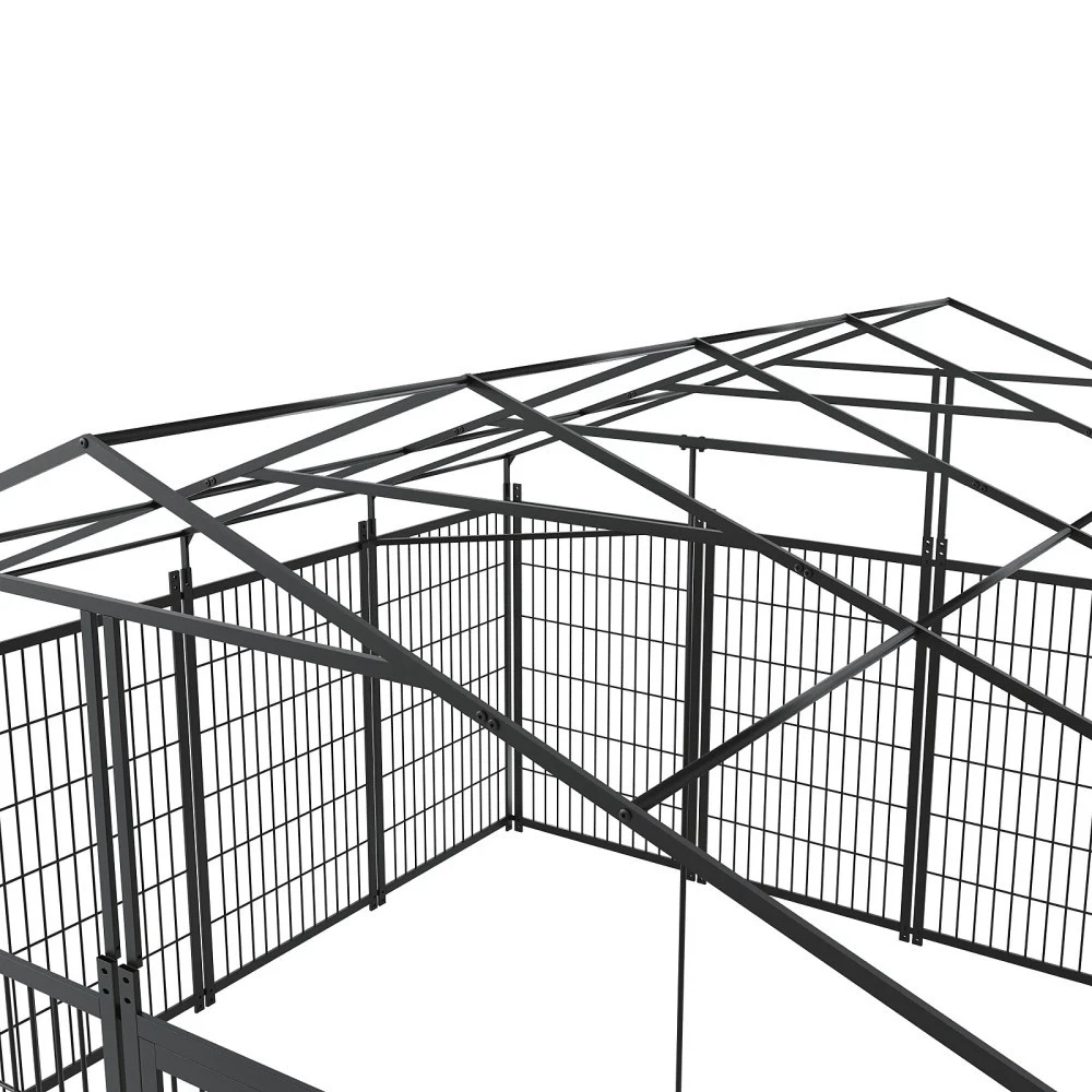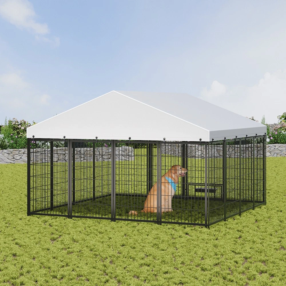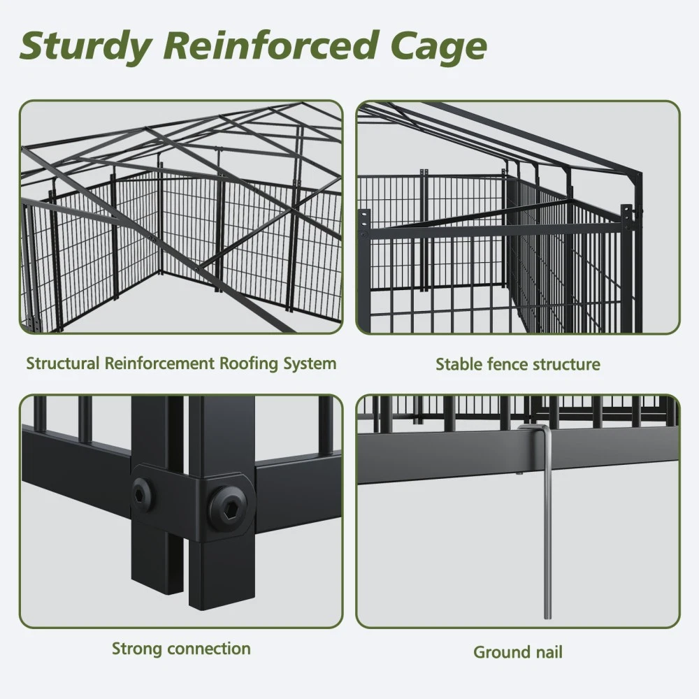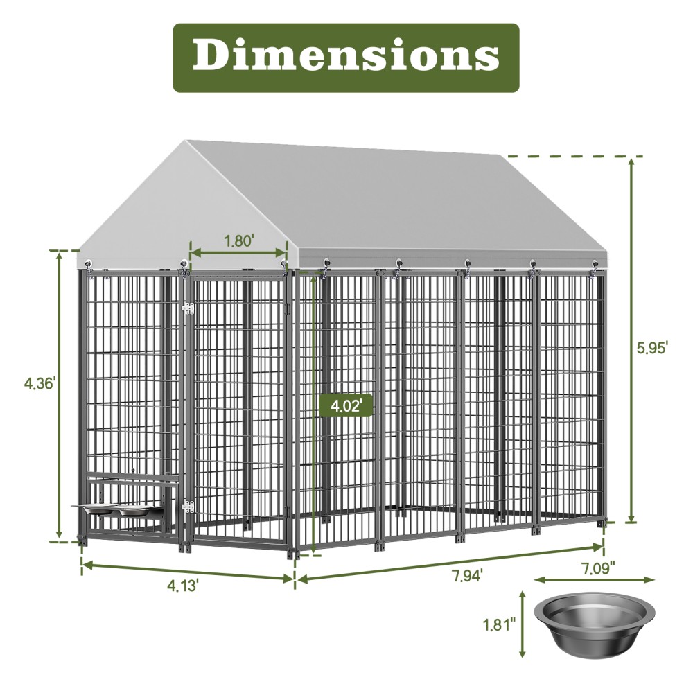 Key Product Specifications Color: Sleek Black Material: High-Quality Iron (Durable & Rust-Resistant) Assembled Dimensions: 7.94'L x 4.13'W x 5.95'H (95.28" L x 50.00" W x 71.65" H) Door Dimensions: 1.8'W x 4.02'H (Easy In & Out for Pets) Product Weight: 83.30 LBS Package Dimensions: 54.72" L x 26.38" W x 7.68" H Package Weight: 88.85 LBS Assembly Time: Approximately 45 Minutes (All Hardware Included) Package Quantity: 1 Box (All Modules Included) Why Choose Our Outdoor Dog Kennel? ✅ Spacious Living Space for Happy Pets Measuring 7.94’L x 4.13’W x 5.95’H, this oversized pet enclosure offers plenty of room for your furry friends to move around, play, and rest freely. The open design ensures excellent ventilation and visibility, reducing anxiety and creating a comfortable living environment. ✅ Reinforced & Secure Structure Crafted from premium iron, this dog cage features a sturdy frame with multiple load-bearing columns for enhanced stability—no wobbling even in windy conditions! The double door lock design provides double security, preventing your pets from escaping unexpectedly and keeping unwanted animals out. ✅ Convenient Feeding Design Equipped with 2 rotating feeders that can be adjusted up and down by 3.9 inches. This thoughtful design allows you to feed your pets easily without opening the main door, saving time and hassle. Perfect for both food and water placement. ✅ All-Weather Protection The advanced roof cover is windproof, UV-resistant, and waterproof, effectively shielding your pets from rain, strong winds, and harsh sunlight. Keep your beloved pets dry, cool, and comfortable in any weather condition—summer, winter, rain, or shine! ✅ Multi-Functional Use Not just for dogs! This versatile enclosure is ideal for raising chickens, ducks, geese, rabbits, and other small to medium-sized animals. Great for outdoor use in your backyard, garden, patio, or farm. ✅ Easy Assembly in 45 Minutes No professional tools needed! All modules can be easily assembled with the included connectors and screws. The door can be installed in any position to fit your specific needs—flexible and user-friendly. Premium After-Sales Guarantee 1 YEAR QUALITY WARRANTY & 30-DAY FREE RETURN/EXCHANGE! We stand behind the quality of our products. If you encounter any issues with the dog kennel within 1 year of purchase, we offer free replacement parts or repair services. Not satisfied? Enjoy a 30-day free return or exchange policy—no questions asked. Shop with confidence! Package Includes 1 x Large Metal Dog Kennel Frame 1 x Weather-Resistant Roof Cover 2 x Adjustable Rotating Feeders All Necessary Connectors & Screws 1 x Detailed Assembly Instruction Manual Invest in a durable, safe, and comfortable home for your pets today! Add to cart now and give your furry friends the outdoor space they deserve.