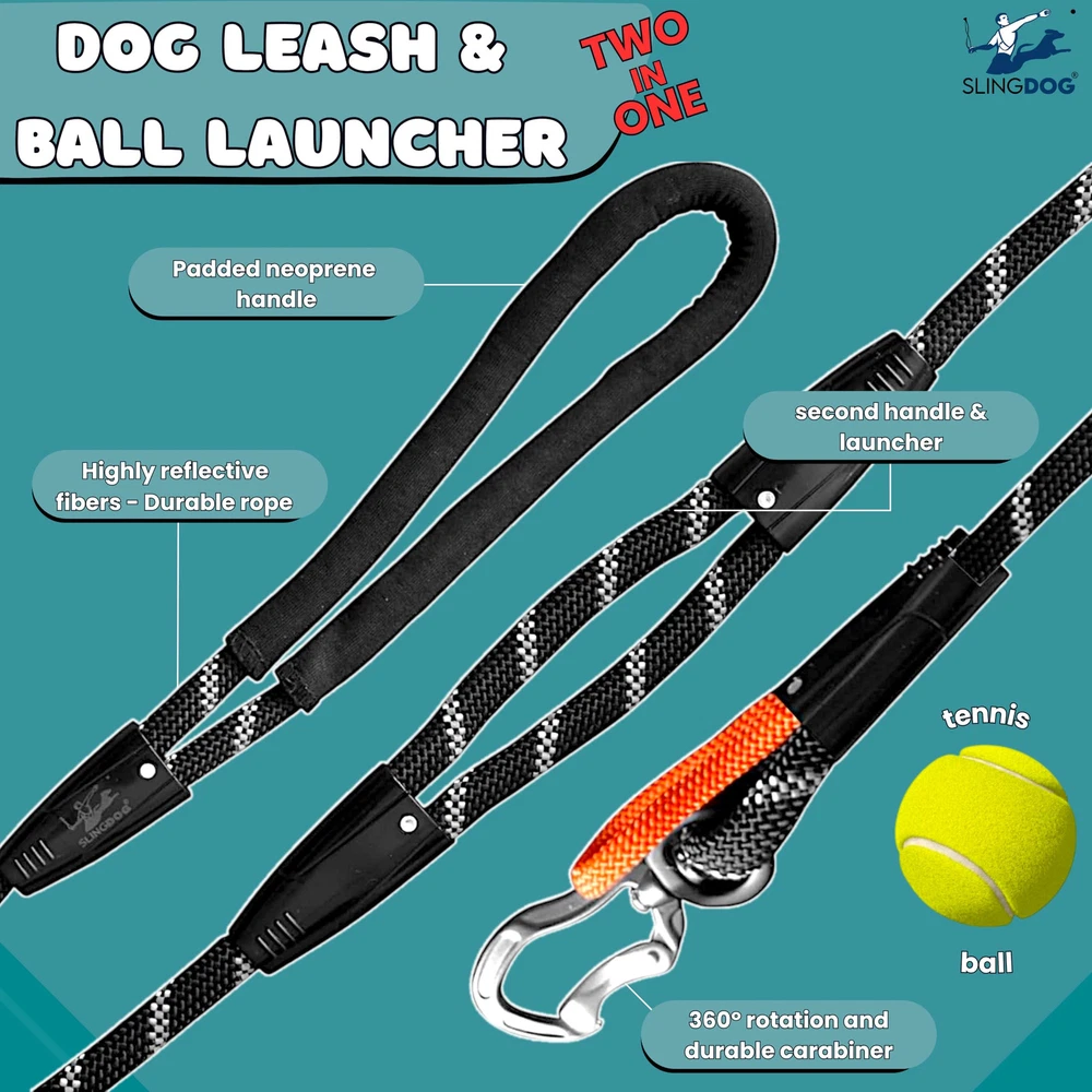 ALL-IN-SOLUTION - Our -in-dog leash and ball launcher defines convenience and fun during your dog walks. Ball holder strings doubles as a second handle, providing enhanced control in challenging or training situations. Our product can be a dog leash, a ball launcher, or a pet toy. It's all three in smart design, making your dog's outdoor adventures more enjoyable. COMPATIBILE WITH ALL TYPES OF BALLS - ball launcher is designed to work with most types and sizes of dog balls, ensuring that you can use your dog's favorite ball without any issue. Our set includes a standard tennis ball to get you started, along with a complimentary cotton bag for carrying the ball on walks. UNBURDENED WALKS - With our Ball Launcher for Dogs you can say goodbye to the hassle of carrying multiple items during your dog walks. Dog Leash and Ball Launcher combo streamlines your outings, with the ball launcher's handle serving as a dual-purpose tool. It's an interactive toy that offers both exercise and the protection, making your walks even funnier. INNOVATIVE EXERCISE SOLUTION - We have combined play and exercise by enabling you to launch a ball further than ever before for your dog using a slingshot-style rope. Provides an interactive playtime experience for your dog, keeping them active and ensures happy experience and quality time for you and for your dog. PRIORITIZING COMFORT AND SAFETY - we have designed our product with your dog's safety and well-being in mind. It features a secure and padded neoprene handle for a comfortable grip, a lightweight and durable carabiner with 360º rotation to prevent pulling, highly reflective nylon fibers woven into the leash which provides comfort and safety during play and exercise. LxWxH 59×0.4×0.4 Inches