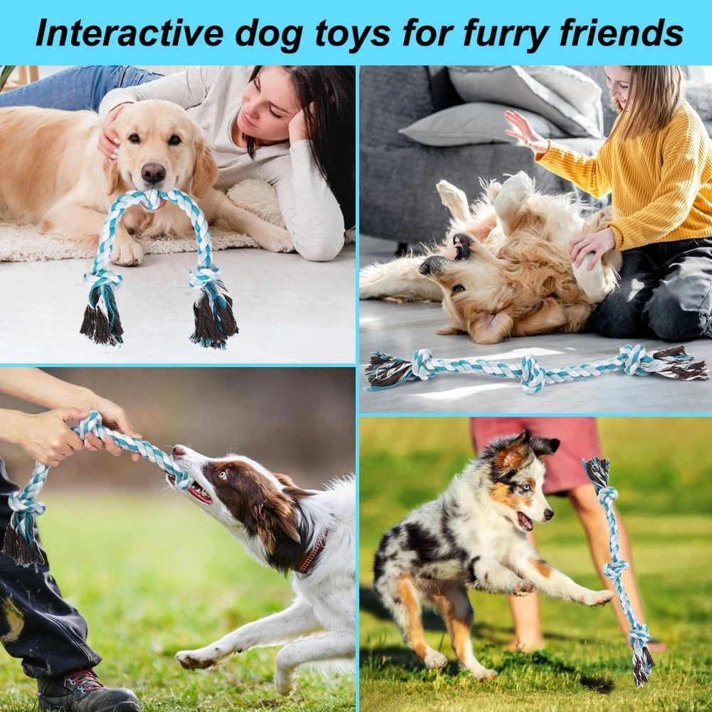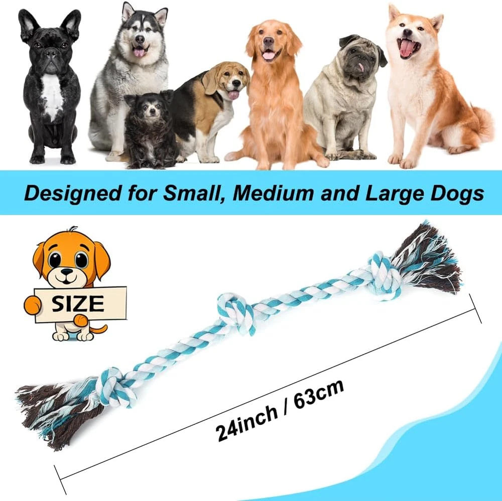 SAFETY MATERIAL -This puppy rope toy is made of natural cotton, safety and sturdy, allowing your pet enjoy chewing and playing IDEAL FOR SMALL MEDIUM AND LARGE DOGS - Our durable dog toys has 3 knots and 24inches long, designed for small,medium and large dogs, not for extra large dogs RELIEVE ANXIETY &PROTECT FURNITURE - Dogs love to chew on things, they will reduce anxiety by chewing. Now you can give them their own rope chew toy instead of your shoes, sofa and furnitures TEETH CLEANING - Natural material cotton fiber of this tug toy for dogs can gently and deeply clean between the dog's teeth, prevent the accumulation of plaque, achieve the effect of massaging the gums, and keep your dog's teeth healthy TUG OF WAR DOG TOYS - If your pet likes to tug of war, we recommend you try this dog rope toys. Vast majority of dogs enjoy tug of war, which keeps them healthy and happy Product Description Specifications: Material: Natural Cotton Color: Blue Length: 24inches Package content: 1PC 3 Knots Chew Rope Toy