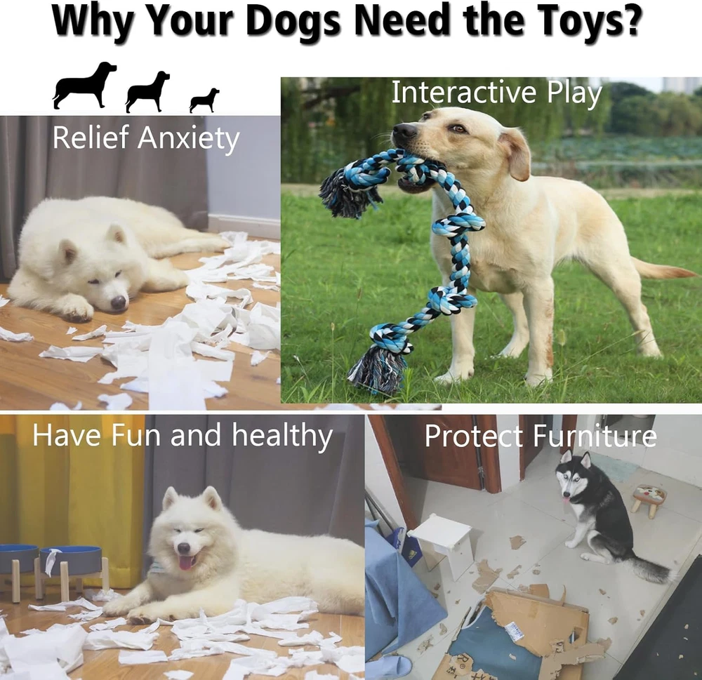 INTERACTIVE FUN DOG TOYS: Perfect for interactive playtime with your large medium dogs, this dog rope toy is finished with 3 feet 5 sturdy knots at each end, making it indestructible and easy to throw, catch and carry, ideal for playing tug of war dog toy! 100% NATURAL COTTON: This premium rope dog toy is made from natural washable cotton finished with sturdy knots, making it a safe and non-toxic chew toys, and a durable tug rope for playing with your best friend. Tough but won't hurt your dog's teeth or gums. SAFE & DURABLE SOLO PLAY: Keep your pet busy when you’re not around – this cotton chew toy for dogs is a great way to keep aggressive chewers away from your furniture, with a safe and satisfying dog chew rope. DENTAL CLEANING & TEETH CARE: The fun way to clean your dog’s teeth! The cotton dog rope fibers floss your dog’s teeth as they chew and play, so daily tugging helps maintain your pup’s oral health and stress relief by chewing rope toys. HEAVY DUTY TOUGH ROPE TOYS: Designed for medium to large dogs and aggressive chewers, Our rope toy for dogs is nearly indestructible, more resistant and durable than our competitors, but in rare cases, extremely powerful chewer may destroy it, if that happens, please contact us and we will send you a replacement. Product Description