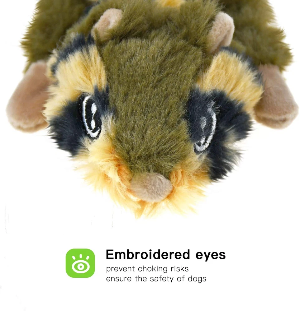 SUPER VALUE PACK TOY PACK: 6 pack furry dog toy, including pig, lamb, lion, cow, chipmunk, leopard, all in animal-shaped, flat and unstuffed. Every set comes with a storage box Your pup will love their new squeaky friends PLUSH DOG TOYS WITH SQUEAKERS: Floppy light weight bodies, easy for small dogs to carry, toss, and roll around with. Each toy has two squeakers inside, not too loud but still get the dog’s attention CRINKLE DOG TOY NO STUFFING: Crinkle paper all over the body, keeping your dog entertained for hours. 100% unstuffed means that no dangerous stuffing hidden in our toys, no swallowing or choking risks and you won’t find yourself cleaning bits of stuffing from all over the house ever again SAFE SMALL DOG CHEW TOYS: Our dog toys are made of natural and non-toxic material that ensures the safety of dogs. Thicker fabric and better stitching make these toys more durable for dogs. It’s suitable for teeth cleaning and chewing WARM TIPS FOR DOG TOY SET: These toys are machine washable. Please kindly note these toys are not for aggressive chewers, and we recommend supervised play, timely replacement of the broken ones Material: Floppy plush Size: Chipmunk Dog Toy: 16.92height x 3.94 width Pig Dog Toy: 15height x 3.94 width Cow Dog Toy: 17.72height x 3.54 width Lion Dog Toy: 15height x 3.54 width Lamb Dog Toy: 14.1height x 3.94 width Leopard Dog Toy: 17.72height x 3.54 width Fun and cute shape 6 pack dog toys make them easy for dogs of all breeds and size to carry, play with and snuggle, they are perfect gifts for your lovely dogs to kill bored time. Great value for the amount of toys you get. Dogs are obsessed with these plush dog toys. Ideal dog toys for small dogs, but large and medium pups love our unstuffed dog toys just as much; Their floppy light weight bodies make these plush dog toys easy for small dogs to carry, toss, and roll around with. Crinkle paper and squeakers all over the body make dogs wont just focus on one to rip apart. They're actually lasting longer than her other soft toys. These toys are made of 100% non-toxic material, very safe for your furry friends. Hand-embroidered eyes and no stuffing design can prevent the dogs from swallowing. Its suitable for dog chewing and cleaning. Not for aggressive chewers. Because our dogs are enjoy ripping everything apart, all proud like they killed it, we recommend supervised play, and timely * of the broken ones. Due to manual measurements, please allow slight different in sizes.