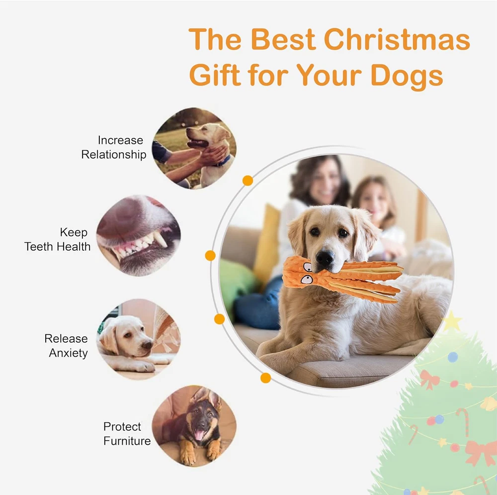 Octopus Dog Toys: This Octopus plush dog toy with bright color is an adorable character that will attract your dog’s interest and keep them entertained. Your dog will have hours of fun with these cute dog toys. The size measures around 12.6 inches, perfect for puppies, small, medium and large dogs. Squeaky & Crinkle Dog Toys: This plush dog toy has a squeaker in the head and crinkle paper sound in the tails. This will attract your dog’s attention immediately. These funny squeak dog toys with hard-to-resist crinkle paper sound will be great toys to interactive with your dog, help to get more exercise, reduce anxiety and boredom. No Stuffing Plush Toys: 100% stuffing free design, which means no dangerous stuffing hidden in our toys, it is very safe your puppy to chew and play, no worry about swallow or choke on and no clean up for you. These squeak dog toys are soft and lightweight, great for tug and fetch, easy for pets to carry, toss and roll around with. Durable Material: Made of safe and high quality plush polyester, thick fabric with solid stitching making these toys more durable for dogs chewing and playing. Great for teeth cleaning, it also helps maintain dental hygiene by naturally cleaning your pet's teeth Warm Tips: These toys are machine washable and easy to clean. Like any other dog toys, we suggest to play under supervision, not for aggressive heavy chewers. Besides, we offer 100% refund if you are not satisfied with your purchase for any reason Product Description CPYOSN No Stuffing Squeaky Octopus Dog Toys - Best Christmas Gift for Your Dog Does this sound familiar? You give your dog a new toy only to find its eyes ripped off and stuffing all over the house minutes later? Or maybe your pup just doesn’t love those heavy stuffed toys, or likes them at first but quickly loses interest? Whether you have a dog who rips the stuffing out of toys, or a small dog who cherishes them, our 100% stuffing free toys are perfect for your furry friend. Interactive with your dog, let's play toss, fetch and tug of war! Cute and funny dog toys that your pup will love and enjoy. Squeaky toys relieve boredom and develop dog's healthy habits. Crinkle paper sound provide more fun for your dog playing. Easy to clean, non-toxic materials to ensure safe play, It is a necessary interactive dog toy for owners and their love pets. Perfect size dog toys for small, medium and large dogs. 2 Pack Dog Chew Toys You will receive two octopus dog toys in two differect colors. These dog toys will become one of your dog's favourite toys and bring more joy for the holidays! Squeaky & Crinkle Dog Toys Squeakers in the head with Crinkly paper sounding legs will attract your dog’s attention quickly, keep your dog entertained and occupied. Durable & No Stuffing Plush Toys No stuffing toys last longer because dogs are less tempted to kill a toy that has no filling to trigger their hunting instinct, which making these toys more durable for dogs chewing and tough play.