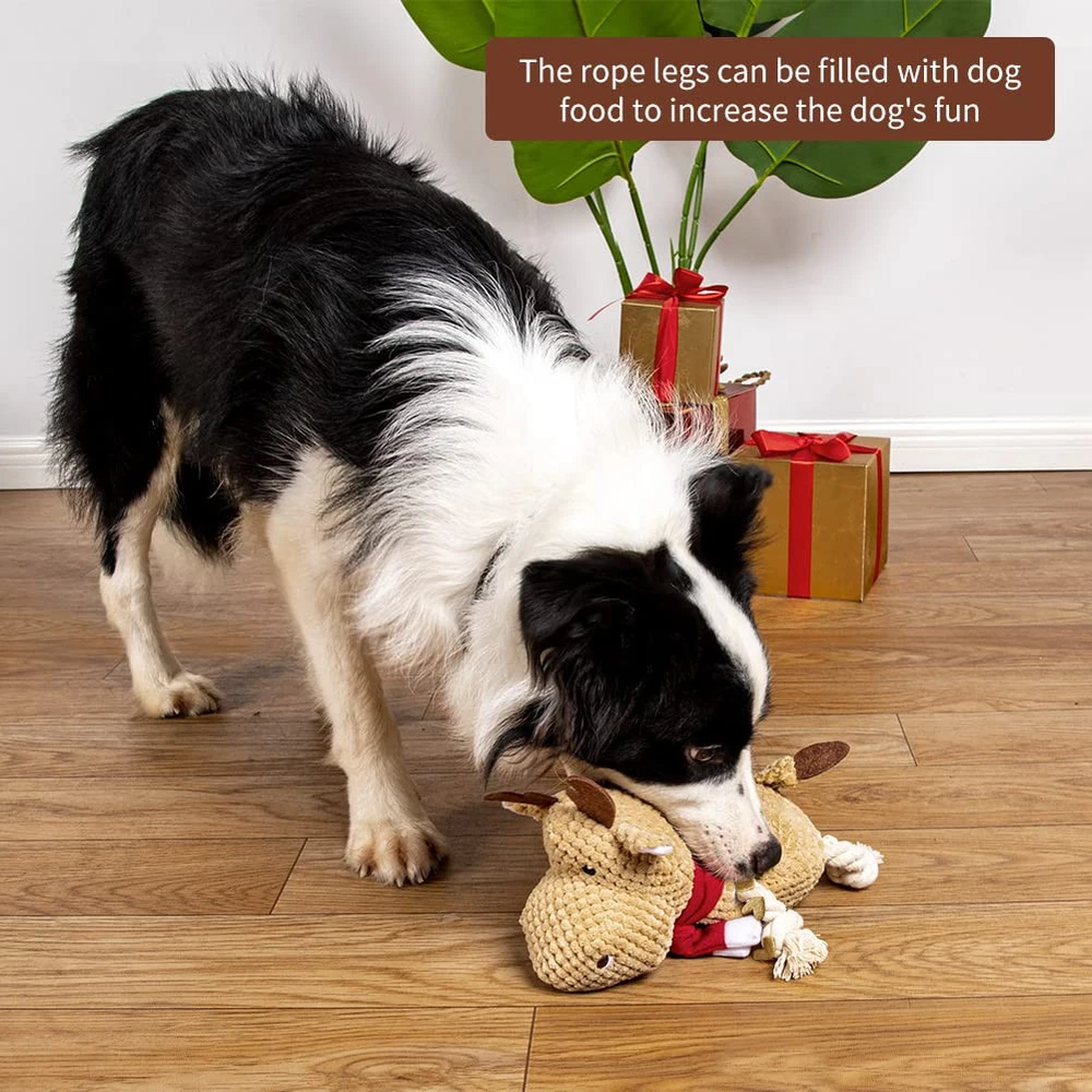🐩Funny Squeaky:This dog squeaky toy built-in squeaker that emits a sound when pets bitting it, allow your dogs to chew it for reducting boredom, and its ears and tails were made of crinkle paper that helps entice play for extra excitement.You can also play using the durable rope leg with you dog. 🐩Comfortable Material: squeaky dog toys makes with an ultra-soft plush material with a cuddly natural cotton texture, very safety to your dogs, also natural cotton rope legs make the toy more durable and bite-resistant that is a perfect cuddle buddy. It is very easy to clean, just wash toys by water and washing machine after playing. 🐩Unique Design:Durable dog toy has a fox shape design and shape design,which is perfect for puppy,smalland middle,large dogs(do not suit for extreme aggressive bite dogs).shapes for your choice. 🐩Keep Teeth Clean:Dog chew toy can highly clean the dog's mouth, stimulate gums and reduce plaque and tartar, promote healthy teeth, pets will increase exercise to maintain weight and by playing the toy. 🐩Emotion and Interactive Toys:When your puppy is bored at home, they may damage the sofa, door and chair.Squeaky dog chew toys are great for fetching games or as a puppy's comfort toy to relieve your dog's depression, boredom and anxiety.Our dog squeak toys are suitable for puppies, medium and large dogs.It is also a good gift to your dogs for christmas,birthday,valentines day,etc
