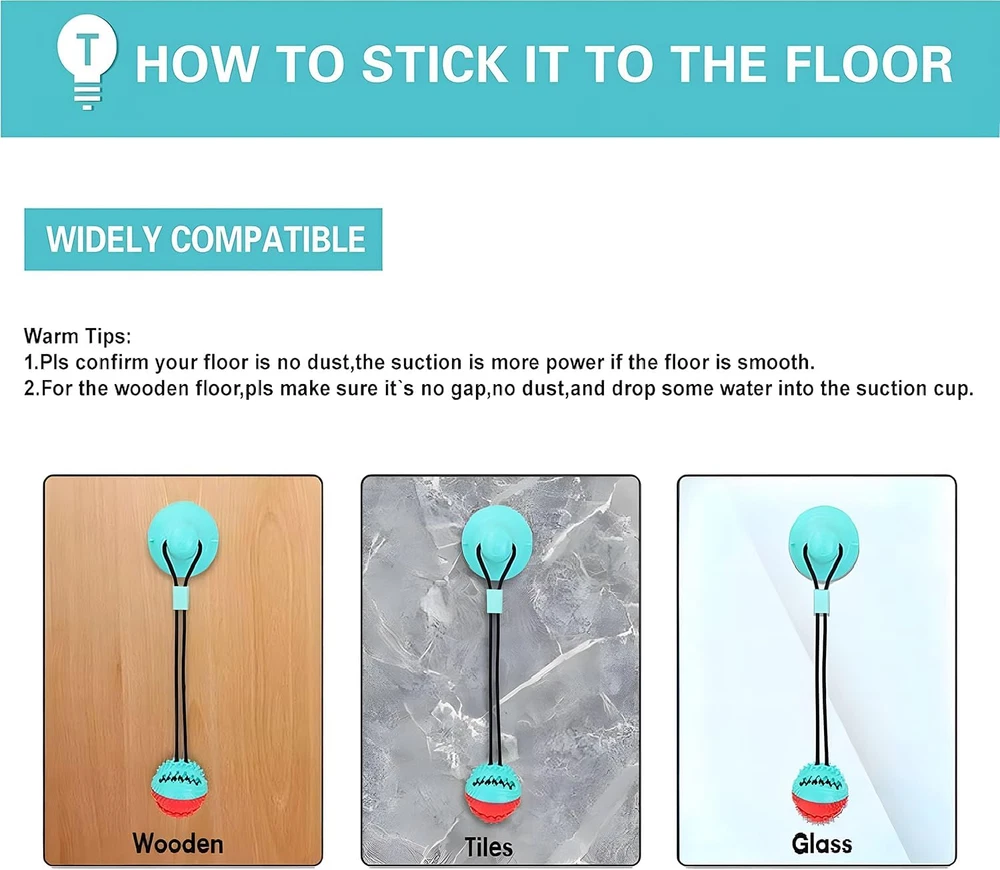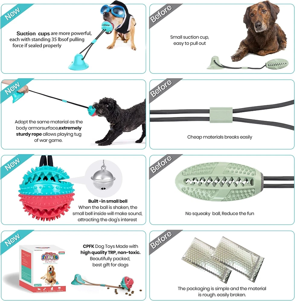 【Premium Quality Dog Tug Toys】suction cup ug Rope Toys is Made of natural TPR materials, environmental friendly, safe and harmless. The sturdy rope is made of high-density material and wear-resistant. Indestructible 【Puppy and Dog Toys for Teeth】 Dog rope puzzle toy not only can it bring joy to your pet,In addition, this is also a good teething cleaning tool, you can put the dog food in the ball, then dogs will try their best to eat the food, when the dog bites it, the serration inside can clean the food residue in the teeth 【Puzzle Toy for Medium Dogs】Dog Interactive Chewing Biting Toys is equip with strong suction cup more firmly adsorbed.It can sturdy adhere to the floor, door and glasses to let the pet self playing, just like a fun tug of war, Increase dog's interest, develop dog's intellgence 【Multifunctional Interaction】 Chew Toy Built-in small bell - When the ball is shaken, the small bell inside will make sound, attracting the dog's interest and increasing the interactive taste effectively Chews help relieve boredom and discourage destructive behavior 【Suction Cup Tug of War Toy for Dog】: CPFK is committed to designing the best toys for dogs. Each of our products has undergone strict quality testing, your SATISFACTION is the most important. If not completely satisfied with our product, we are here to help WITHIN 24 HOURS, please feel free to contact us Product Description SUCTION CUP DOG TOY Is Designed for Small, Medium and Large Dogs , TOYS to KEEP DOGS BUSY Chewing is the natural behavior of dogs, we can through the right way guide the dog and help the dog change its habit. The newly designed suction cup dog toy by CPFK can effectively help dog release excess energy and prevent the dog from bad behavior due to long-term boredom. Suction dog toy can effective help and mitigationwith chewing, separation anxiety, teething, boredom, training, barking, and more. IMPROVING ORAL HEALTH Puppy toys for teething small dogs not only brings joy to pets, dog teething toys also a great tool for cleaning teeth. There are molar particles of different sizes around the spherical surface of teething toys for puppies. When the dog bites the ball, suction cup dog tug of war toy with sawtooth particles to effectively remove tartar and plaque and improve the oral health of dogs. LEAKY EATING DESIGN Suction dog toy leaky eating design will make dog more clever and healthy. you can put the dog's food and medicine in the treat ball dog toys, and then the dog will try its best to eat the food. So can help the dog develop healthy diet habit, at the same time, it can also increase the fun of playing. MULTIFUNCTIONAL INTERACTIVE Indestructible dog toy great for chasing, tug of war, fetching, dog toys interactive rope toys can provide dogs with daily exercise, dog squeaky toys allows you to interact with the dog at any time, dog toys can enhance the relationship between owner and pet. And dog rope toys allows you making your relationship with your dog more intimate. DOG TOYS FOR SMALL DOGS: DURABLE AND RUGGED The ropes of squeaky dog toys are made of high-density material, which makes dog toy very durable and wear-resistant, make sure pets can play long time, no damage. Suction dog toys are made of natural TPR material, suction cup dog toys are safe and harmless to pet's health. Dog suction cup tug of war toy helps pets pass the boring time, relieve anxiety and stress, make dogs' life more fulfilling, dog toys to keep dogs busy. Suction Dog Toy Can Help with Kill The Boring Time, Relieve The Anxiety And Stress. Durable dog toys helping to meet the dog's instinctive needs. Sometimes we can't take the dog anywhere and help him choose this chew bell toy ball with suction cup. Dog toys can kill the boring time, relieve the anxiety and stress, to make dogs' life more fulfilling. Let our puppy enjoy the fun of toys at home and play happily every day. TUG OF WAR DOG TOY USAGE SCENARIOS: Puppy toys's suction cups work better on smooth and flat surfaces. Please do not use dog tug of war toy on matte wood floors, dusty walls and concrete surfaces. Dog Toys for Aggressive Chewers Product Specification: Dog Puzzle Toys Name: Suction Cup Dog Toy Dog Squeaky Toys Color: Red + Turquoise Durable Dog Toys Size: Total length 28.5 in Suction cup Size: 2.4 in*3.74 in Dog Toys Weight: 0.6 pound