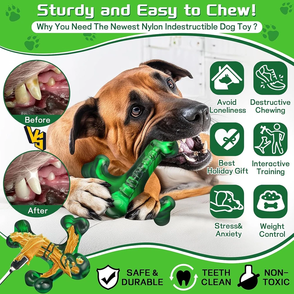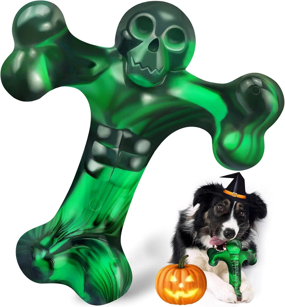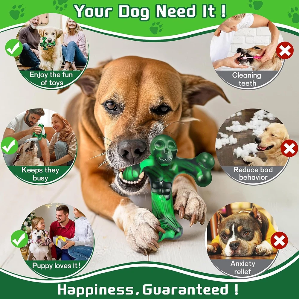 Dog Toys for Aggressive Chewers,Faint Bacon Flavor,Almost Green Product Details Item Weight: 7.8 ounces Manufacturer: SIHRMIU Item Package Dimensions L x W x H: 6.3 x 5.83 x 2.83 inches Item Dimensions LxWxH: 6.3 x 5.2 x 2.75 inches Item Weight: 7.83 ounces Brand Name: SIHRMIU Target Audience Keyword: Dogs Color: Green Material: Nylon Breed Recommendation: Medium,Large Specific Uses for Product: Outdoor, Indoor Product Dimensions : 6.3 x 5.2 x 2.75 inches; 7.83 ounces Manufacturer : SIHRMIU Dog toys for aggressive chewers – dog parents know their dogs' obsession with chewing,This virtually indestructible dog toy can withstand hours of play.Made of safe and chew resistant nylon,providing a tougher and safer alternative to sticks,Without breaking into pieces or splitting in when chewed,superior chewy than real bones.Being able to withstand a dog's powerful chewing while training a jaw allows your dog to enjoy lasting pleasure and satisfy the dog's natural chewing instinct Skull motif y-shaped bone design – easy to pick up and chew,with enticing real bone shapes that are easy for dogs to recognize.The grooves,ridges,and small nodules on the surface will lure dogs into a natural frenzy for bone toys.Dogs like to walk around the house with toys and tightly grasp them while chewing.This forkbone is curved and has four chewable bone ends,making it easy for aggressive chewers to grasp and achieve good chewing effects from any angle,your dog can enjoy chewing or picking up things.You can also apply some peanut butter or toothpaste to help aggressive chewers clean their teeth while biting,maintaining entertainment and mental stimulation This dog chew toy is the perfect gift for dogs – It is easy to clean and can be cleaned with soap and water, or with a dishwasher,saving you a lot of trouble. This dog chew toy is suitable for dogs weighing 25-100 pounds or less,it measures 6.3 inches in length, 5.2 inches in width,and 2.75 inches in height,weighing 220 grams. The size is moderate,allowing dogs to easily control plaque and tartar during chewing,helping to clean teeth and reduce the risk of tooth problems. Its cool green and black paired with a skull pattern makes it super fun to watch dogs chew on it! A great gift for dog lovers and their dogs on birthdays,halloween,christmas,and thanksgiving,let your dog chew on it Our professionalism in dog toys can withstand the test – this dog biting toy has been tested several times by stubborn chewers such as german shepherd,siberian husky,golden retriever,etc.It is still difficult to destroy and has successfully won the recognition of pet parents!Let you not worry about frequently damaging toys,and enjoy long-lasting chewing that is worth it.(our 85 pound dog likes this toy and has been playing with it for a while.It withstood her chewing-evan) (she has had this toy for almost a month and it still hasn't been damaged,Our money is worth it,You can also bring it when walking the dog and play with it anytime-davis) High quality after-sales service – we highly value customer experience and welcome your suggestions on our dog chew toys.If you have any questions about aggressive dog biting toys,please contact us directly and we will provide you with a after-sales service within 24 hours.The behavior of dogs is unpredictable,please regularly check for cracks or missing pieces in sturdy dog bone biting toys,and replace severely worn or damaged toys,use almost indestructible dog toys under supervision