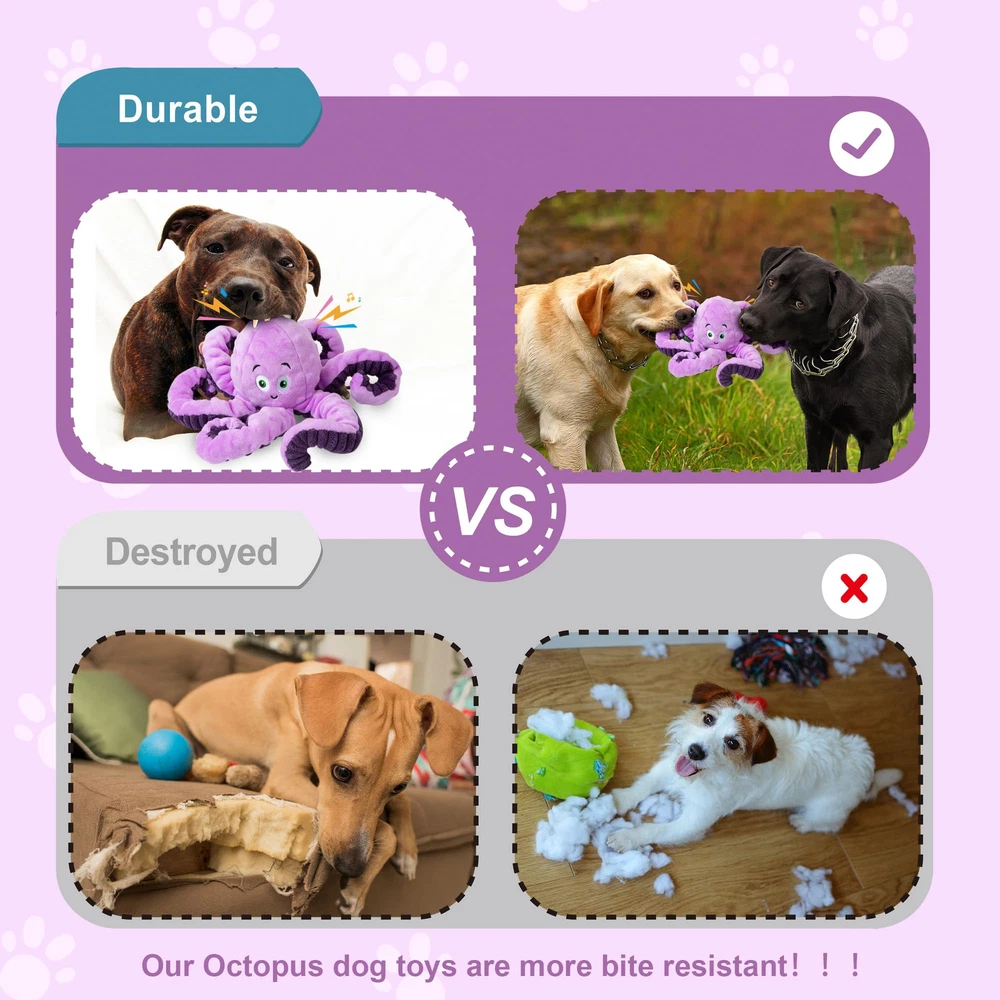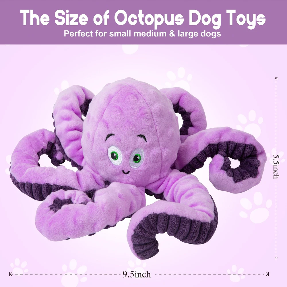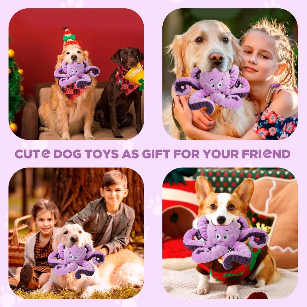 dog toys are not for aggressive chewers or indestructible dogs!!! Safe Plush Natural Material: dog plush toys are made of cotton and do not harm your dog.There is also a layer of waterproof cloth inside the plush toy to prevent dog saliva from entering the plush inside. Octopus Dog Squeaky Toys: Our plush chew dog toys have a built-in squeaking sound inside, and the whistle will sound when the dog bites, which will attract your dog's attention and keep playing with the cute dog toys. Relieve Anxiety: When your dog is at home, with this dog toy, he will play with him without feeling lonely or biting on the sofa at home. Teeth Clean: dog chew toys can effectively clean your dog's teeth and keep them clean.If the dog toy gets dirty, you can easily clean it. Dog Toys: Our plush chew dog toy is very cute and Christmas is coming soon. It can be given as a toy to your dog. He will be very happy to see it.