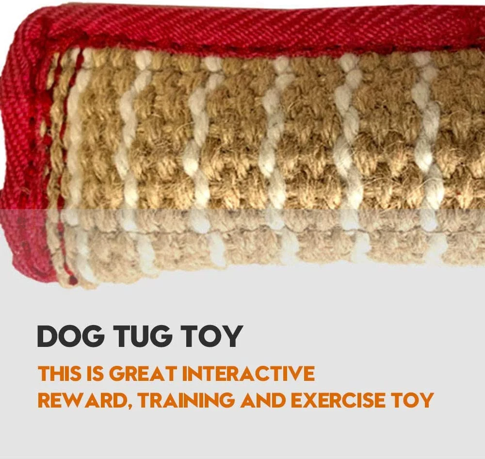 OUT OF THE ORDINARY: High quality dog bite tug toy with double stitching and a tough biting sleeve surface made of jute, withstand the daily tugging. 2 rope handles is comfortable and easy to grip, full control and stability. DOG TUG TOY: This is great interactive, reward, training and exercise toy, suitable for indoor or outdoor play—tug for war, police Favorites, ring sport, agility, creating prey drive or other more. SUITABLE SIZE: The toy is perfectly sized to make it easy to hold for an interactive play or fetch, while it won't cause any damage when thrown around by your dog. NOT A CHEW TOY: This dog tug toy is built safe and tough but no toy is indestructible. Tug Toys are meant for interactive tugging between you and your dog only, not chew toys. UNSUPERVISED CHEWING IS NOT RECOMMENDED: Tug Toys are meant for interactive tugging between you and your dog only, not chew toys. We strongly recommend that you do not allow your dog to keep the toy after interaction has finished and don’t let him bite the handles. Product Description 1 Strong Handle 2 Double Stitches Edge 3 Durable Linen 4 Clean Dog's Teeth Different colors and patterns to choose from! Add to Cart Add to Cart Add to Cart Add to Cart Add to Cart Add to Cart Price — $9.99 $ 9 . 99 $9.99 $ 9 . 99 $9.99 $ 9 . 99 $9.99 $ 9 . 99 $9.99 $ 9 . 99 $9.49 $ 9 . 49 Material Stainless Steel Linen Linen Linen Linen Linen Linen Colour Silver Pink & Yellow Green Black Blue Pink & Yellow Pink & Yellow Pattern No No No Footprint Footprint Footprint Flag Have sturdy handles? ✘ ✔ ✔ ✔ ✔ ✔ ✔ Suitable for dogs? ✔ ✔ ✔ ✔ ✔ ✔ ✔