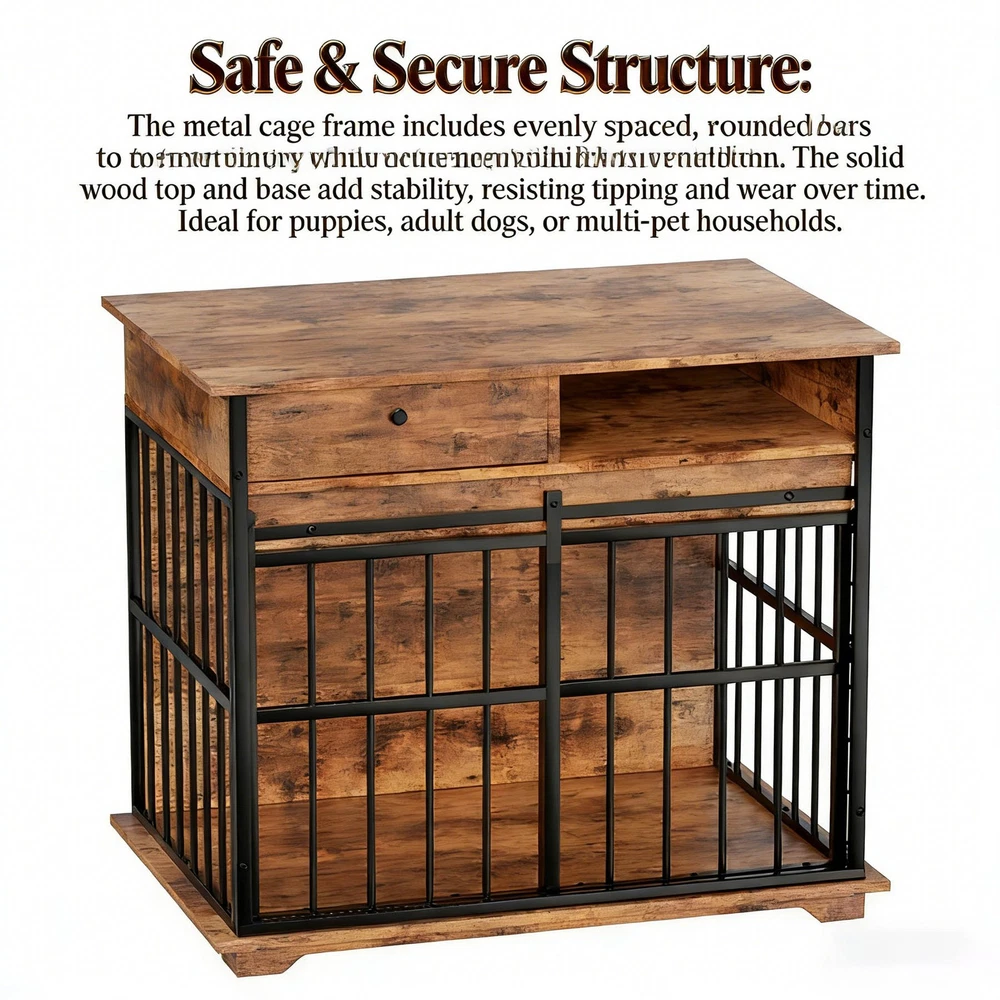 Dog Crate Furniture, Large Wooden Dog Kennel with Tray - Walnut+Black, for Medium & Large Dogs 🔥 Premium Dog Crate Furniture | 1-Year Warranty | 30-Day Free Return & Exchange 🔥 Upgrade your pet's living space and your home decor with this multi-functional wooden dog crate! Crafted for durability and style, it’s the perfect blend of pet comfort and human-centric design—ideal for medium to large dog breeds. ✨ Key Features Spacious & Sturdy Construction : 35.43”L x 23.22”W x 35.58”H dimension offers ample room for your dog to stand, move, and rest comfortably. Made of high-quality MDF wood + robust iron frame, ensuring long-lasting sturdiness and a premium look, suitable for indoor use. Functional Storage Solution : Equipped with a smooth-sliding drawer and side storage compartment. Keep pet toys, treats, bedding, and other essentials organized—say goodbye to cluttered floors! Metal handle ensures secure and easy drawer access. Safe & Secure Design : Evenly spaced rounded iron bars prevent injury while maximizing visibility and ventilation for your pet. Solid wood top and base enhance stability, resisting tipping and wear. Perfect for puppies, adult dogs, and multi-pet households. Tool-Free Easy Assembly & Maintenance : Pre-drilled holes and modular components make setup a breeze—no extra tools needed! Smooth wood finish and metal surfaces are easy to wipe clean with a damp cloth. Detachable design allows quick disassembly for storage or travel. Versatile Home Decor Complement : Walnut+black color scheme with weathered wood veneer and industrial metal accents blends seamlessly with modern, rustic, or contemporary interiors. Can be used as a dog bed, training crate, or decorative furniture piece—elevate your home while caring for your furry friend. 📐 Product & Package Details Specification Details Color Walnut + Black Material MDF + Iron Assembled Size (L×W×H) 35.43” × 23.22” × 35.58” Assembled Weight 69.00 LBS Package Size (L×W×H) 38.98” × 26.57” × 6.89” Package Weight 75.18 LBS Origin China 🛡️ Warranty & Return Policy ✅ 1-Year Quality Warranty: We stand behind our product! Enjoy a 1-year warranty against manufacturing defects. ✅ 30-Day Free Return & Exchange: Not satisfied with your purchase? Return or exchange it for free within 30 days (no restocking fee, buyer only needs to cover return shipping). Note: This dog crate comes with a removable tray for easy cleaning of pet messes. Please measure your dog's size (length, height) before purchasing to ensure a comfortable fit. 👉 Add to Cart Now and Give Your Furry Friend a Comfortable & Stylish Home!