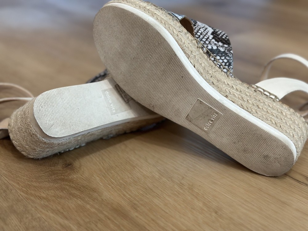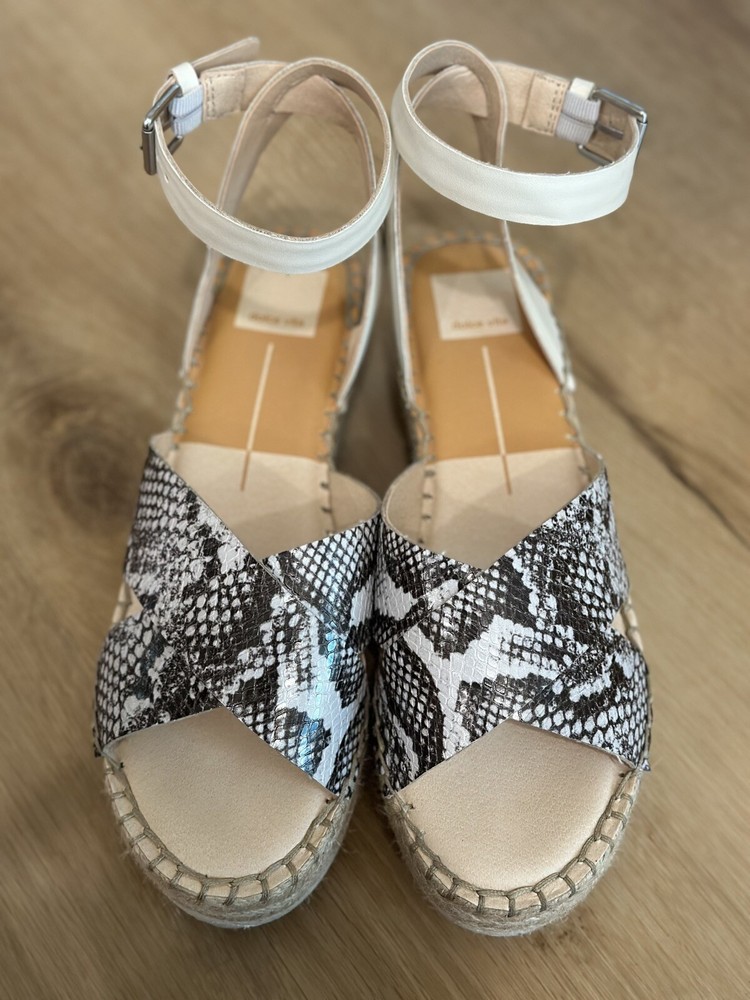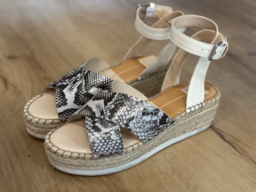 Elevate your shoe game with these stunning Dolce Vita Women's Stella sandals. The ivory leather upper features a chic snake print pattern, complete with buckle closure for a secure fit. These sandals are perfect for any occasion, whether you're headed to a wedding, party, or just a casual day out. The mid-height wedge heel provides both comfort and style, while the leather lining and insole ensure a luxurious fit. These sandals are a must-have for any fashion-forward woman's wardrobe. Don't miss out on the opportunity to add these Dolce Vita Stella sandals to your shoe collection.