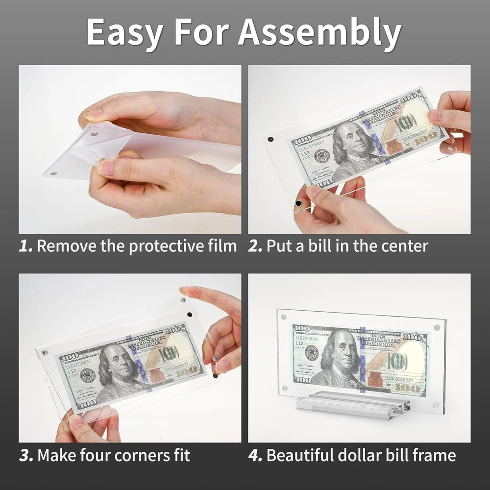 Clear dollar bill frame with base supports, designed for displaying photos, paper curre ncy, pictures, stamps, paintings, or other paper items and arts. Also suitable for real estate licenses and bank checks. This money frame enhances the visibility of your bills and is intended for tabletop or desktop display only. We have created vertical and slanted card slots for the display's base, providing you with additional angles to display your certificates, commemorative coins, and other items. Whether placed in a room or office corner, it will exude an exquisite and tasteful appearance. Our acrylic money holders have a practical magnetic design, making installation effortless and tool-free. Just align the panels and let the magnets handle the rest, saving you time and effort during assembly. This acrylic paper money display case features a double sided transparent window design, allowing for clear visibility from both sides. The case has smooth edges, excellent transparency, and clarity. It is ideal for storing banknotes, commemorative coins, and other items, while also providing an elegant and classic feel.
