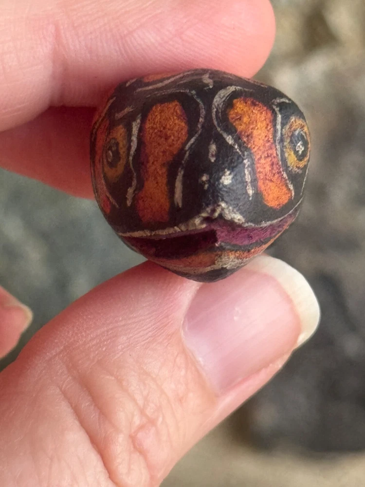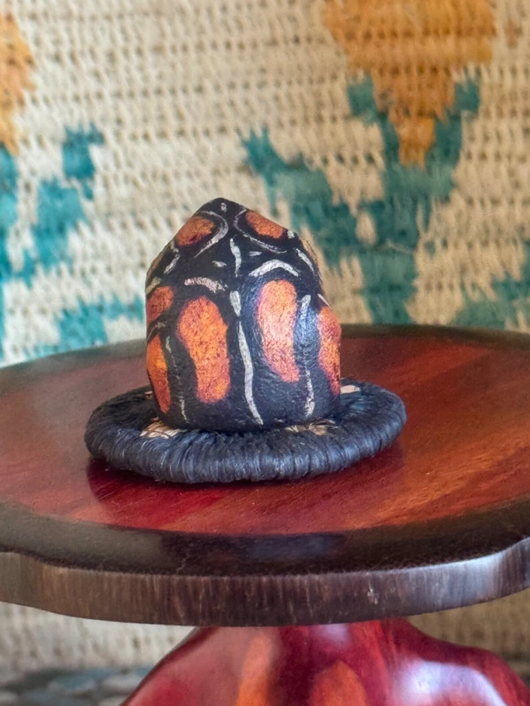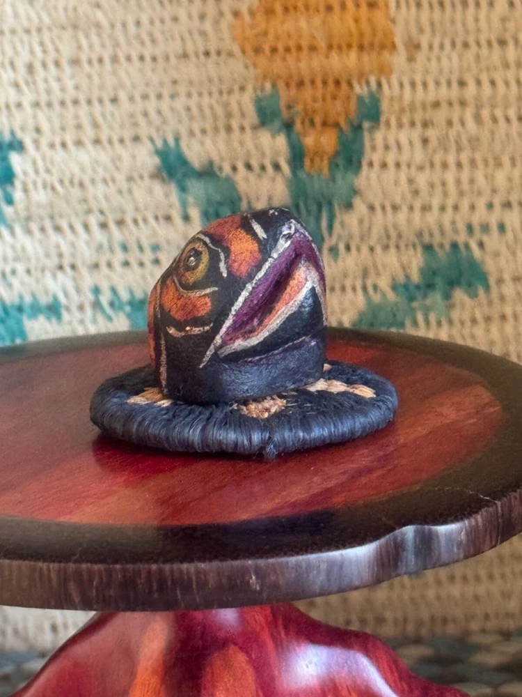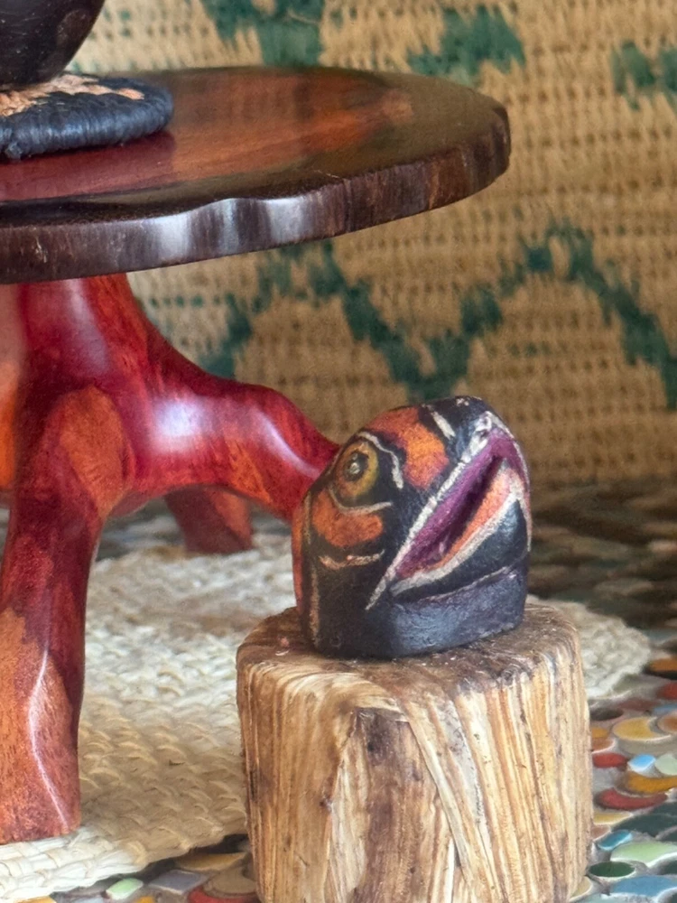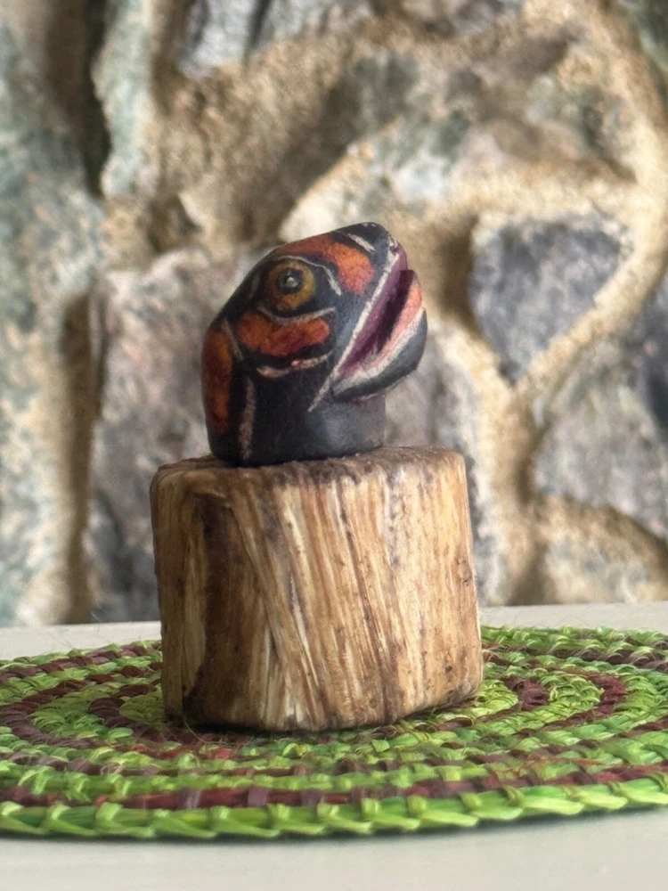 A miniature turtle head sculpture of a turtle head, handmade by José Eduardo Ramos in the Colombia Amazon. Beautiful piece, flawless and expressive. This one is free standing and makes a great tabletop sculpture, or add your own hanging mechanism. You will have to add a hanging mechanism if you decide to wall mount it. Please note this is for the turtle head sculpture only. Other items in the photos may be available in my other listings, by request, or on the website. See the insta account for much more details! Height approximately: 3/4” Length (from back of mask to end of the nose): 1” Width: 3/4” I’m happy to combine shipping with multiple purchases! If you’re interested in something from the site mentioned above, the flat rate shipping can be combined with auction items too.