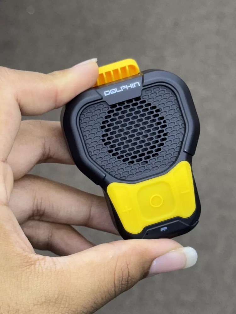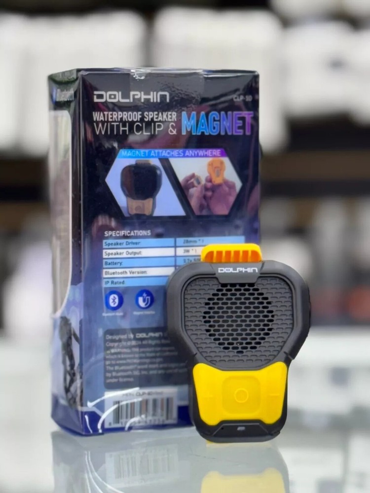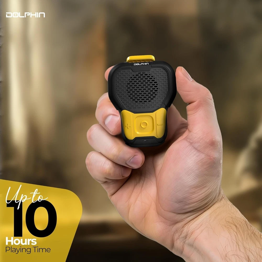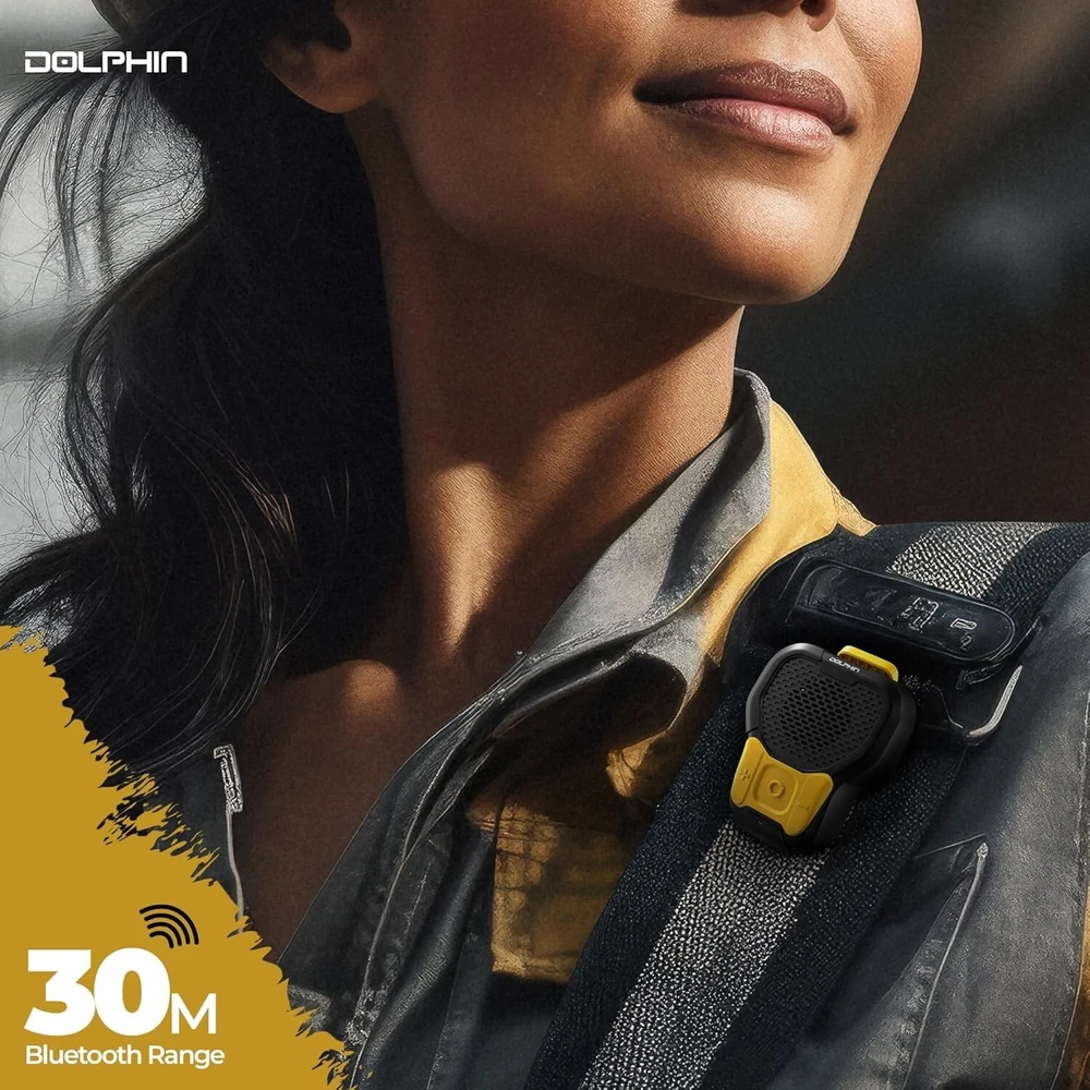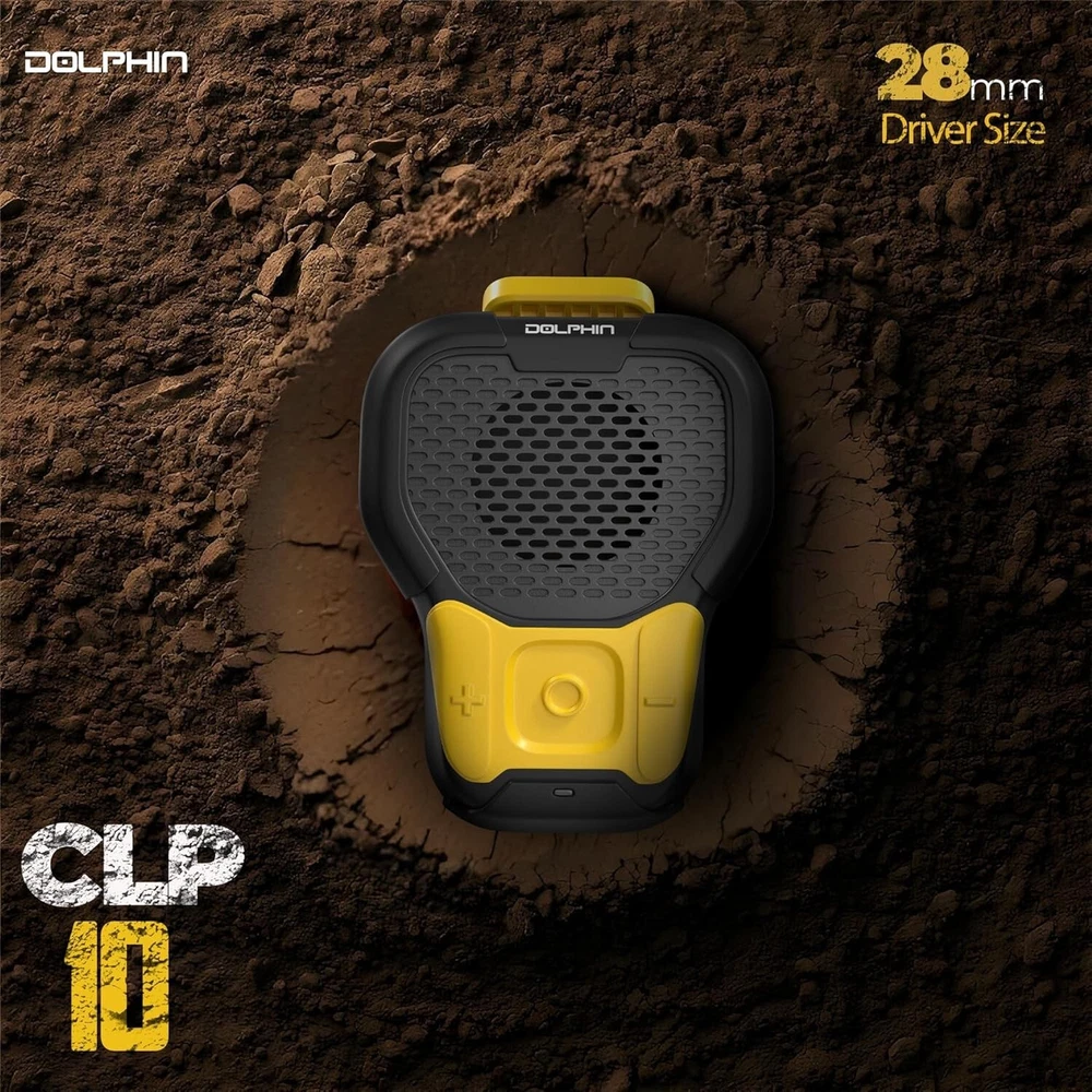 Dolphin CLP-10 Wearable Magnetic Clip-On Bluetooth Speaker with Built-in Mic for Hands-Free Calls/Music, Compact and Portable Design – Black and Yellow About this item Rugged and Durable: Built to withstand tough environments, the IPX6-rated CLP-10 is dustproof and waterproof, making it ideal for construction sites and outdoor sports. Hands-Free Calling: Stay connected without the need to pull out your phone. The CLP-10 features hands-free calling with noise suppression for clear communication. Magnetic Clip for Easy Attachment: Securely attach the speaker to your work gear, bike, or clothing with the magnetic clip, keeping your hands free for work or cycling. Long Battery Life: Enjoy up to 10 hours of uninterrupted playtime on a single charge, ensuring your soundtrack lasts through the workday or workout. Reliable Bluetooth 5.3 Connectivity: Stream music and take calls from up to 30 meters away with stable Bluetooth 5.3 technology, compatible with all your devices.